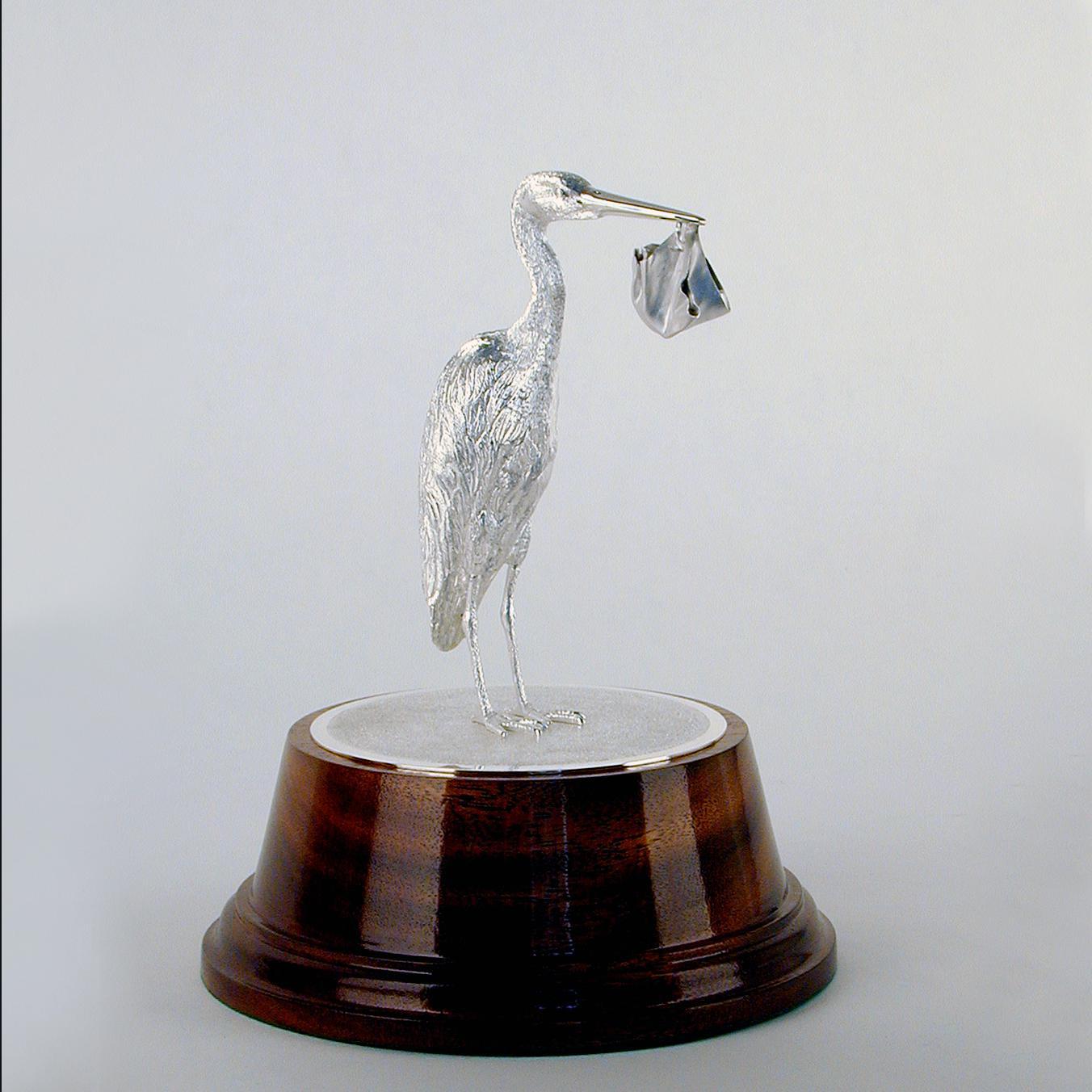 Initials drawings were approved by the client before translating them into a hand-modelled 3-D wax which in turn was used to create a mould that would take the silver. In the traditional, centuries-old, technique of lost wax casting, the molten silver is poured into the mould and once the silver solidifies the wax is melted and drained away. The heavy-gauge model of the stork and baby was then carefully hand chased to produce the lifelike features and detail of both.