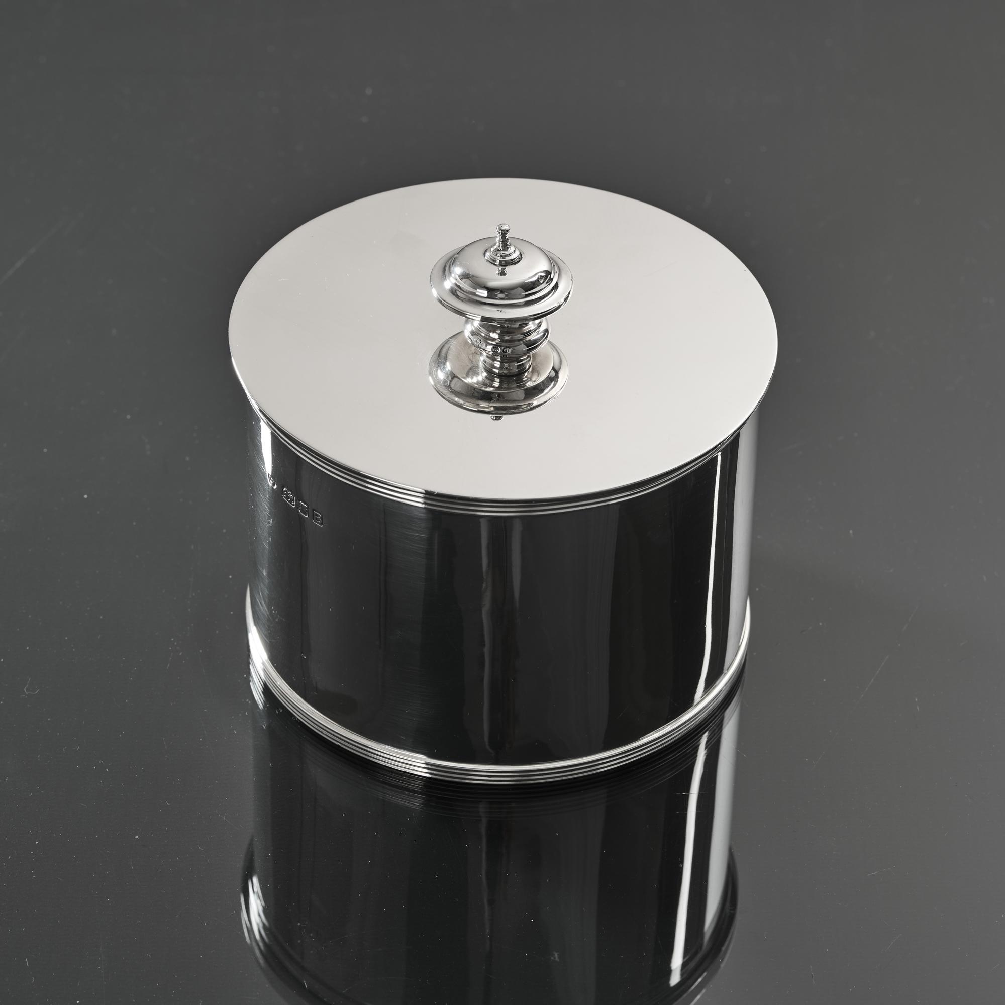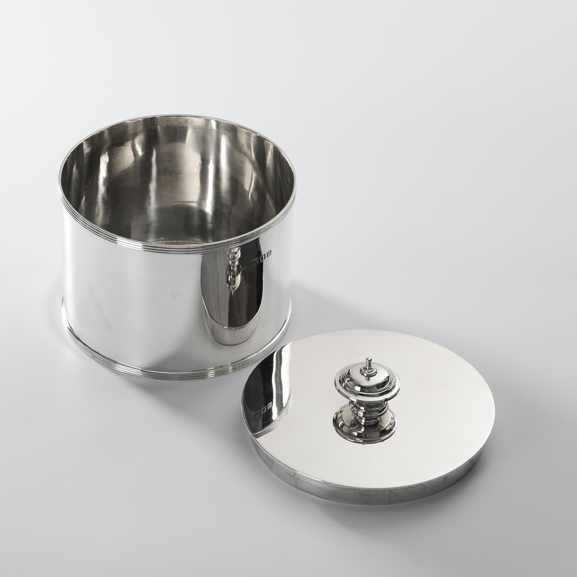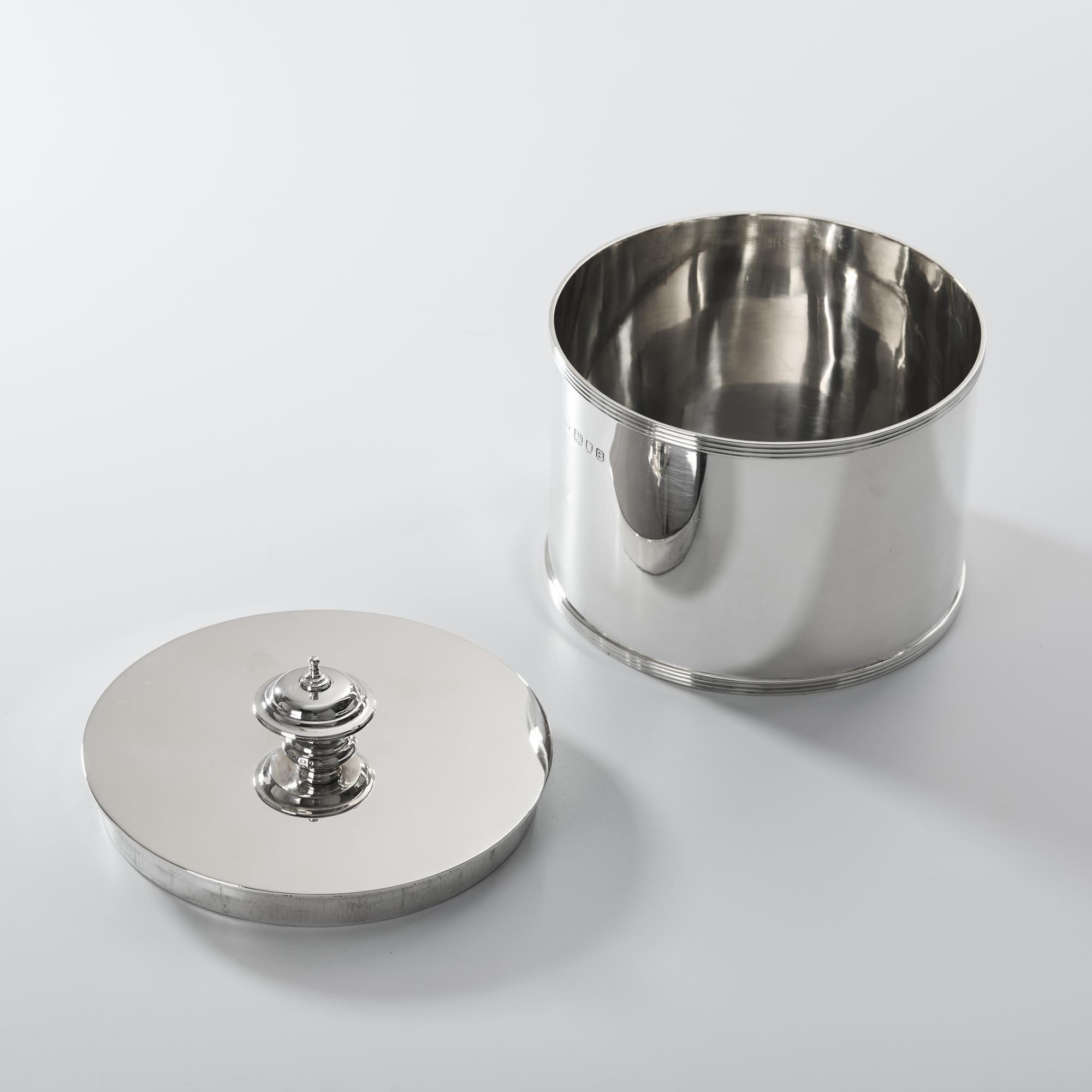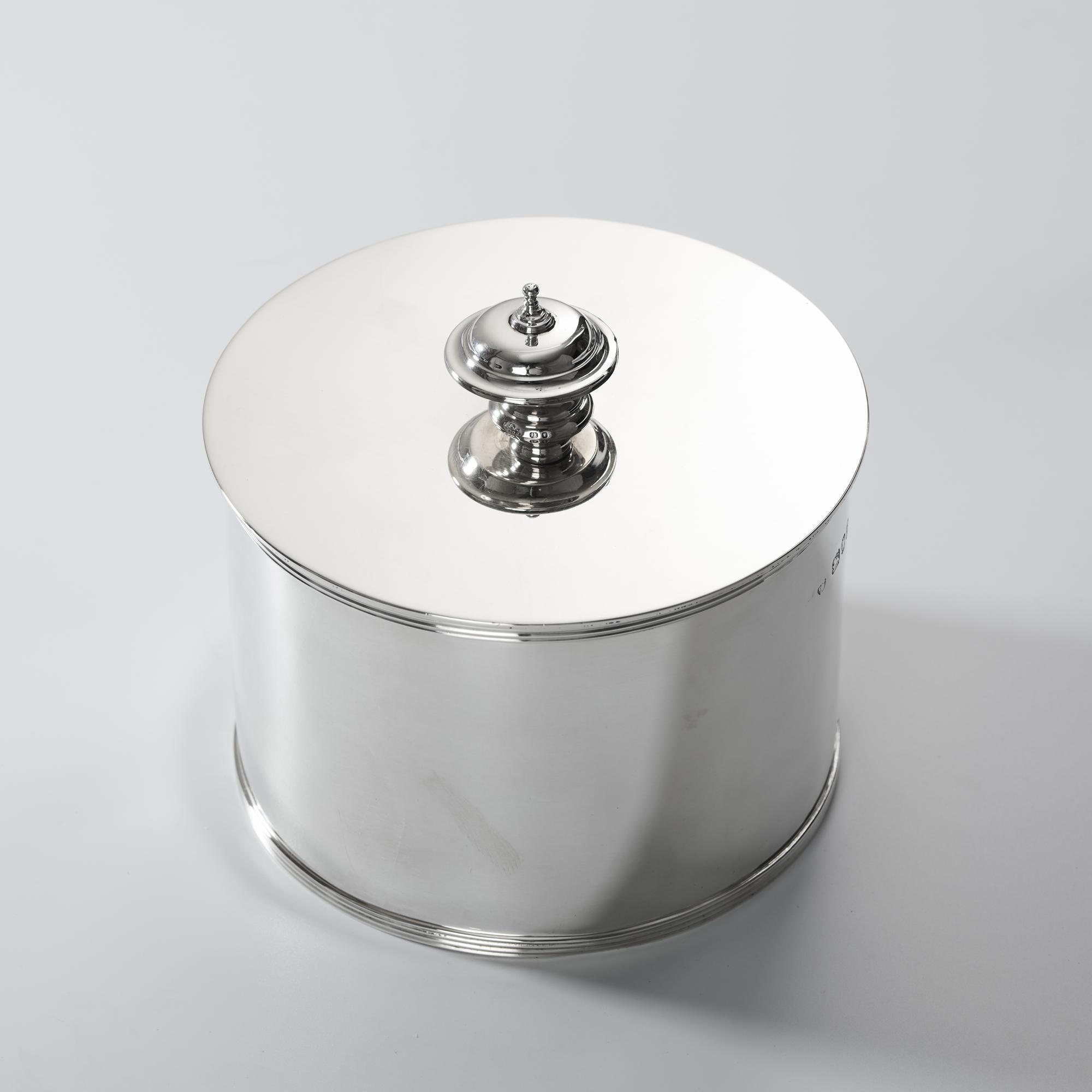 Simple 1930s sterling silver biscuit box with a pull-off cover surmounted by a comfortable bun-shaped finial. The box's simplicity is gently enhanced with applied reed & ribbon pattern silver borders to the rim and base.