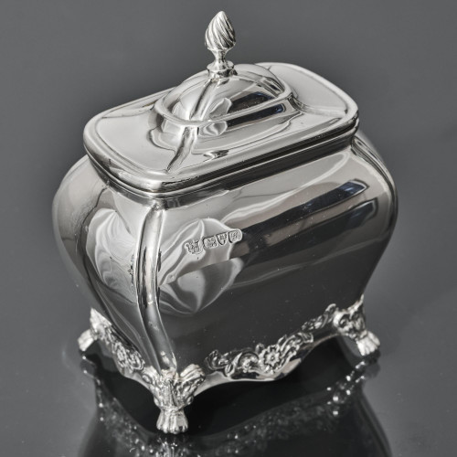 This pretty oval silver jewellery box was made at the turn of the 20th century by William Comyns of London. The lid is finely hand-engraved with floral decoration and has cast flower and scroll borders. The cast legs are set amongst a delicate openwork cape of leaves and flowers and the interior is re-lined in blue velvet with gold-plate in the lid.