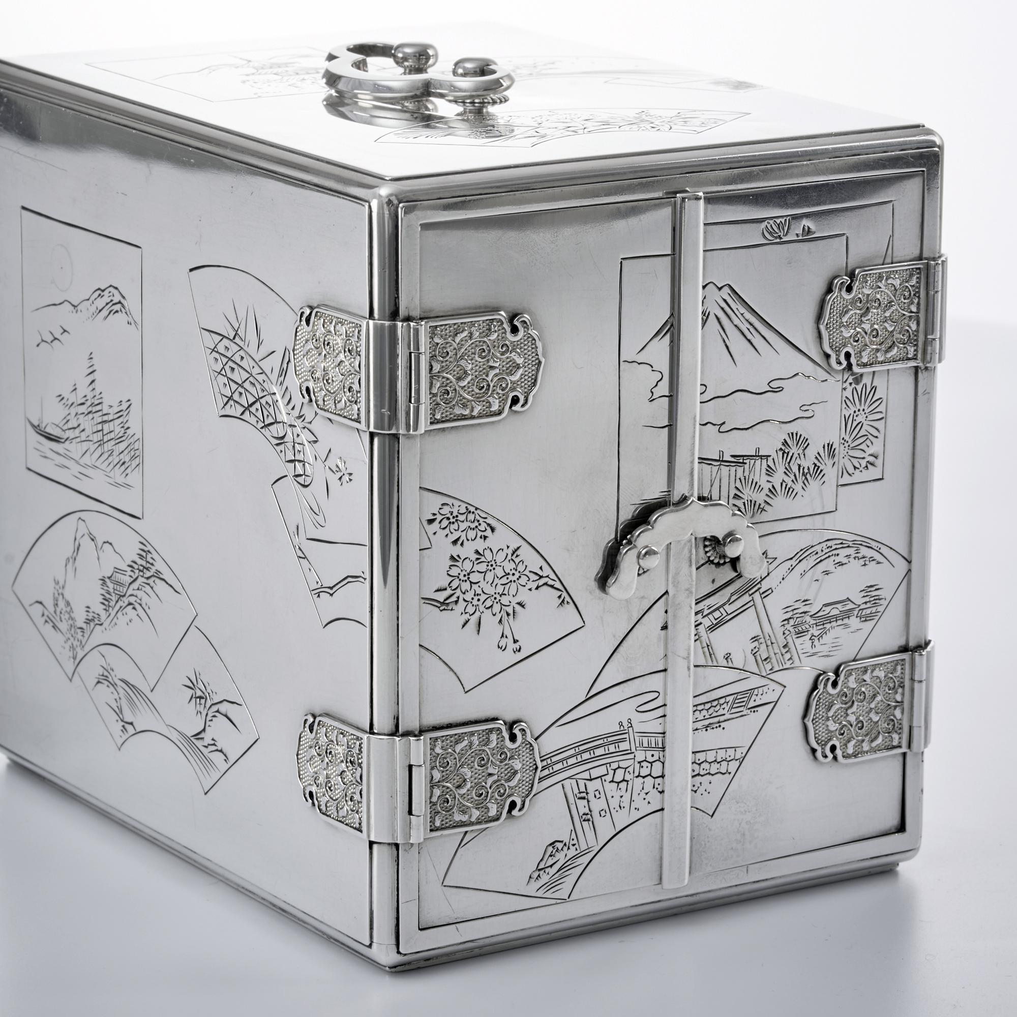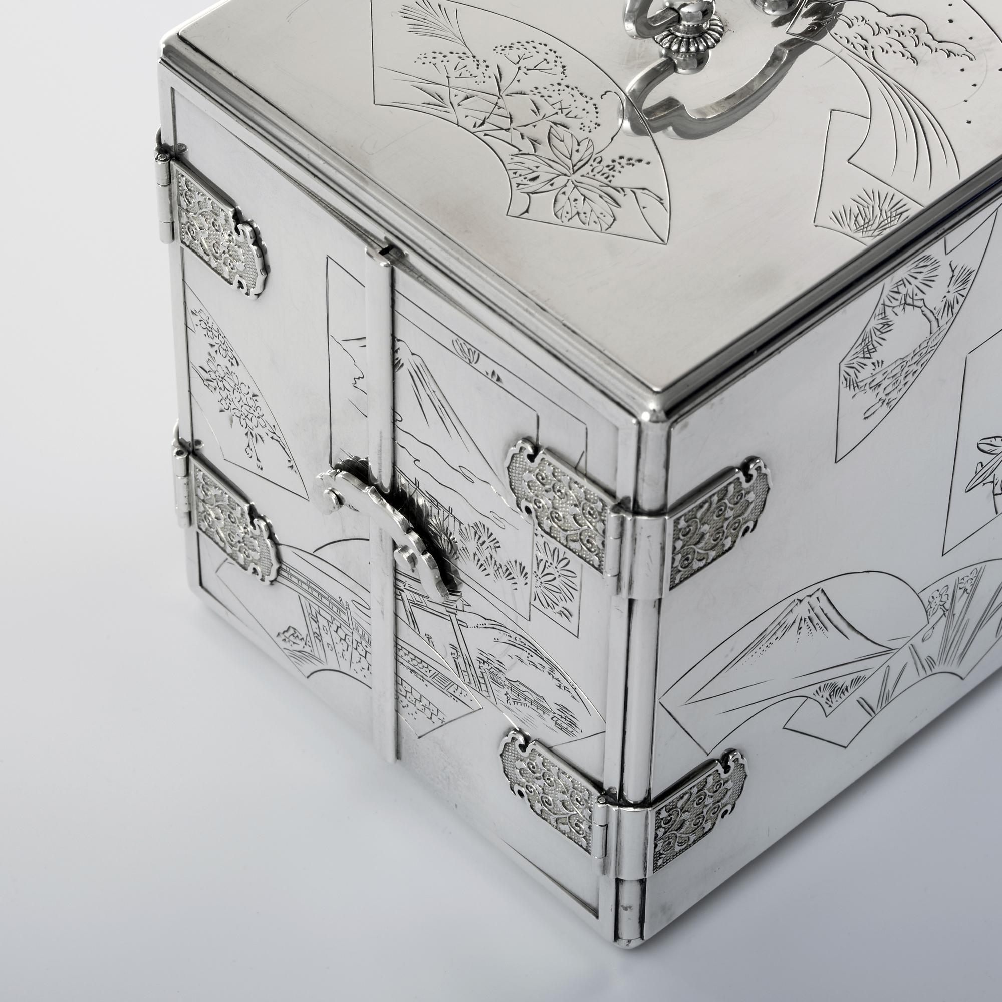 From the Meiji period (1868- 1912), this is a marvellous antique Japanese silver and lacquered wood jewel box, handmade in Japan and finely engraved with a variety of classical Japanese design motifs that include snow-topped mountains, cherry blossom, bamboo, wasen (traditional boat), minka (traditional house), pagodas, iris, cranes.