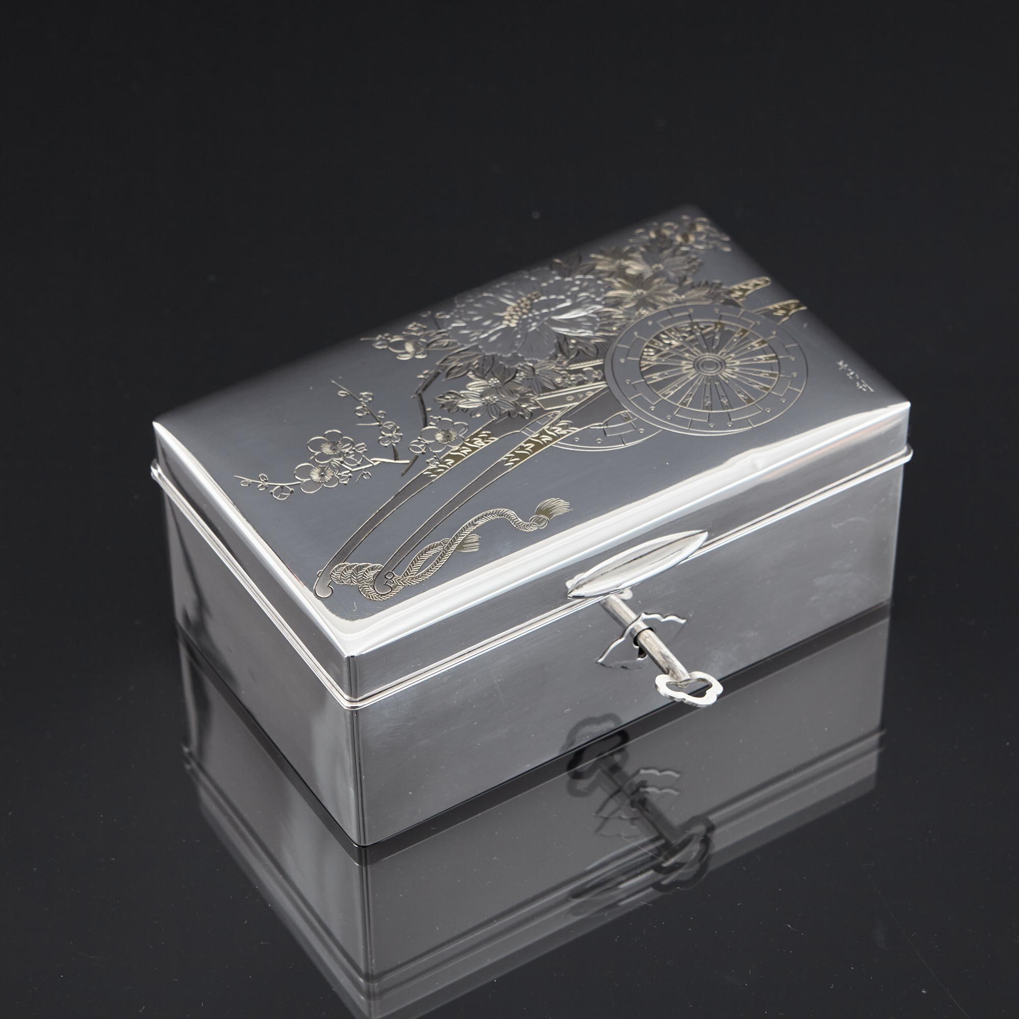 Charming first quality Japanese silver (950/1000) jewel box beautifully engraved with an image of a traditional wooden cart brimming with a profusion of chrysanthemums and cherry blossom - familiar Japanese artistic motifs - and delicately highlighted with gold. The maker has used 950 standard silver to make this silver box; a higher grade than sterling silver.