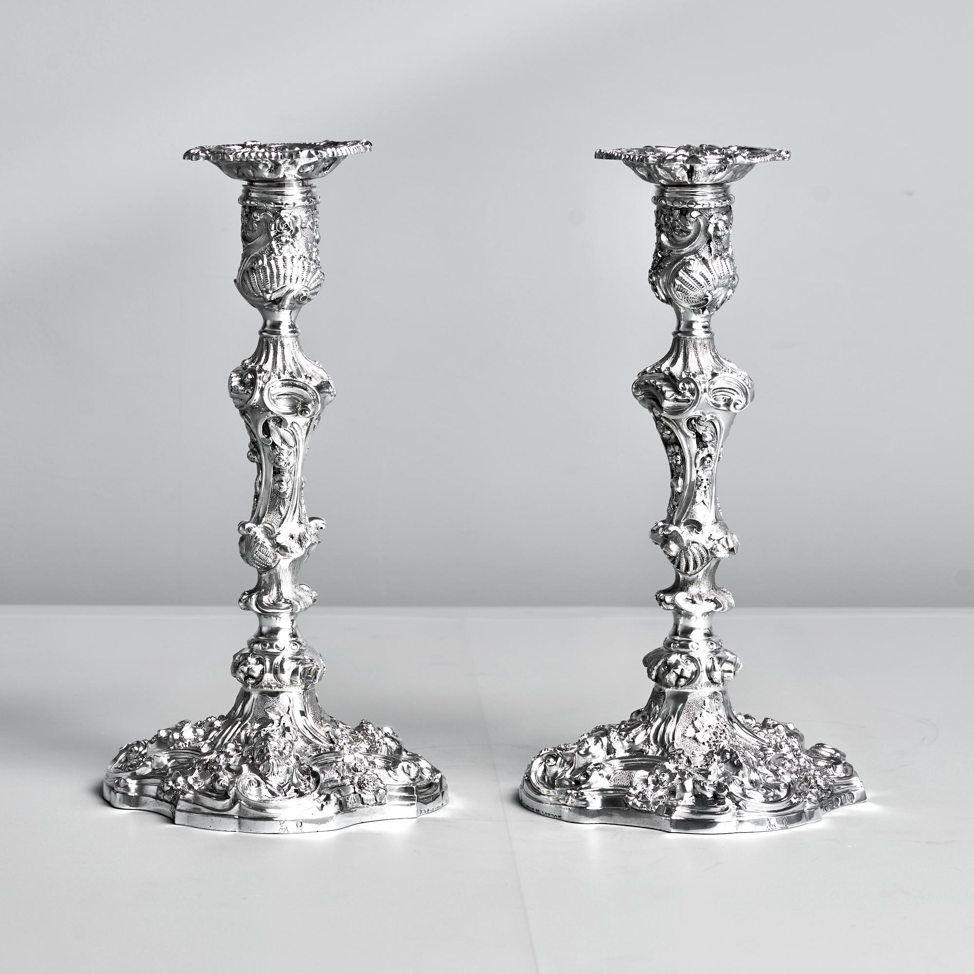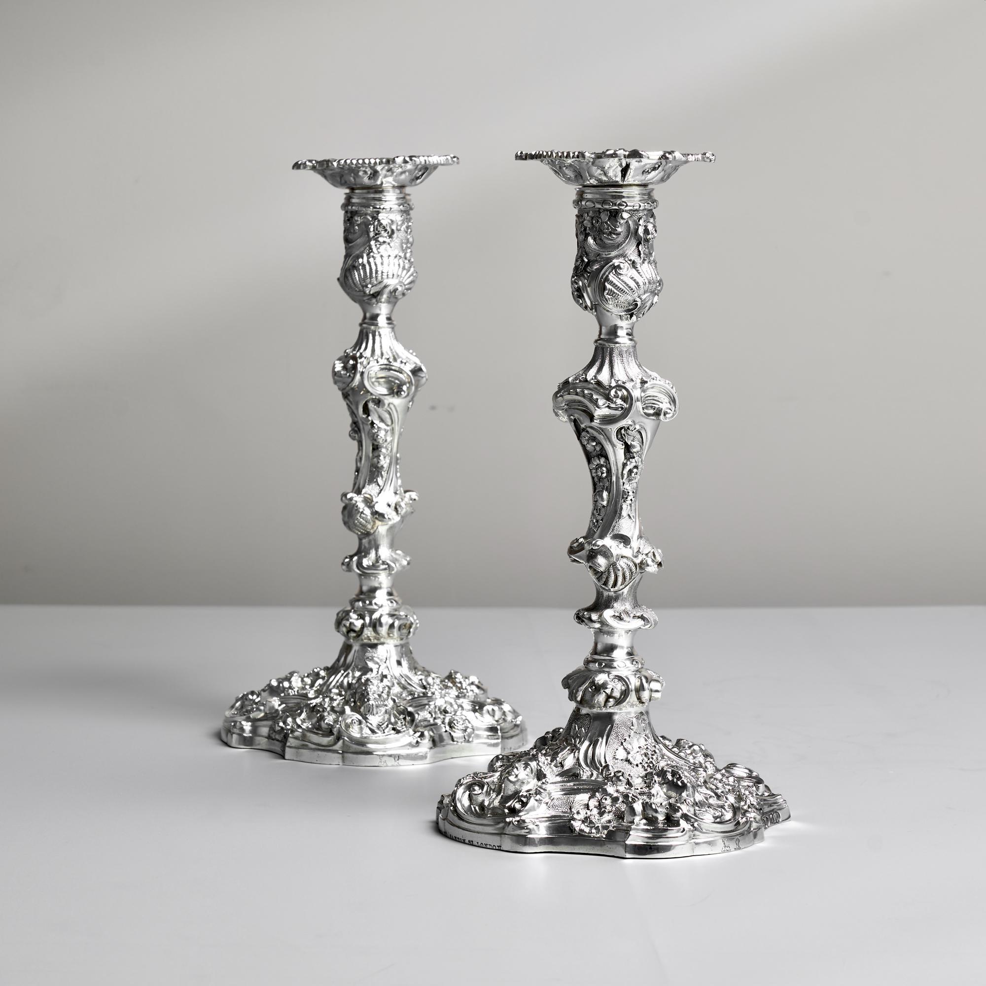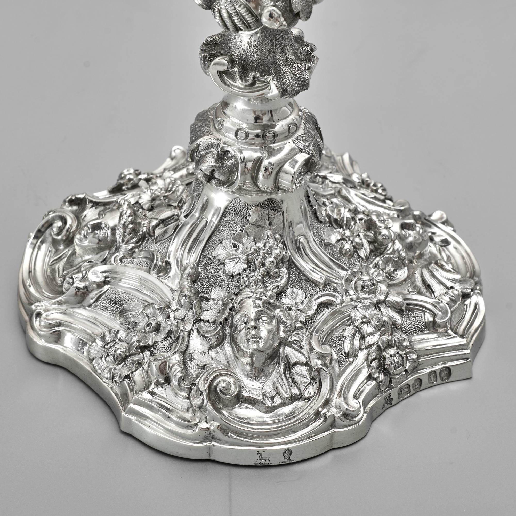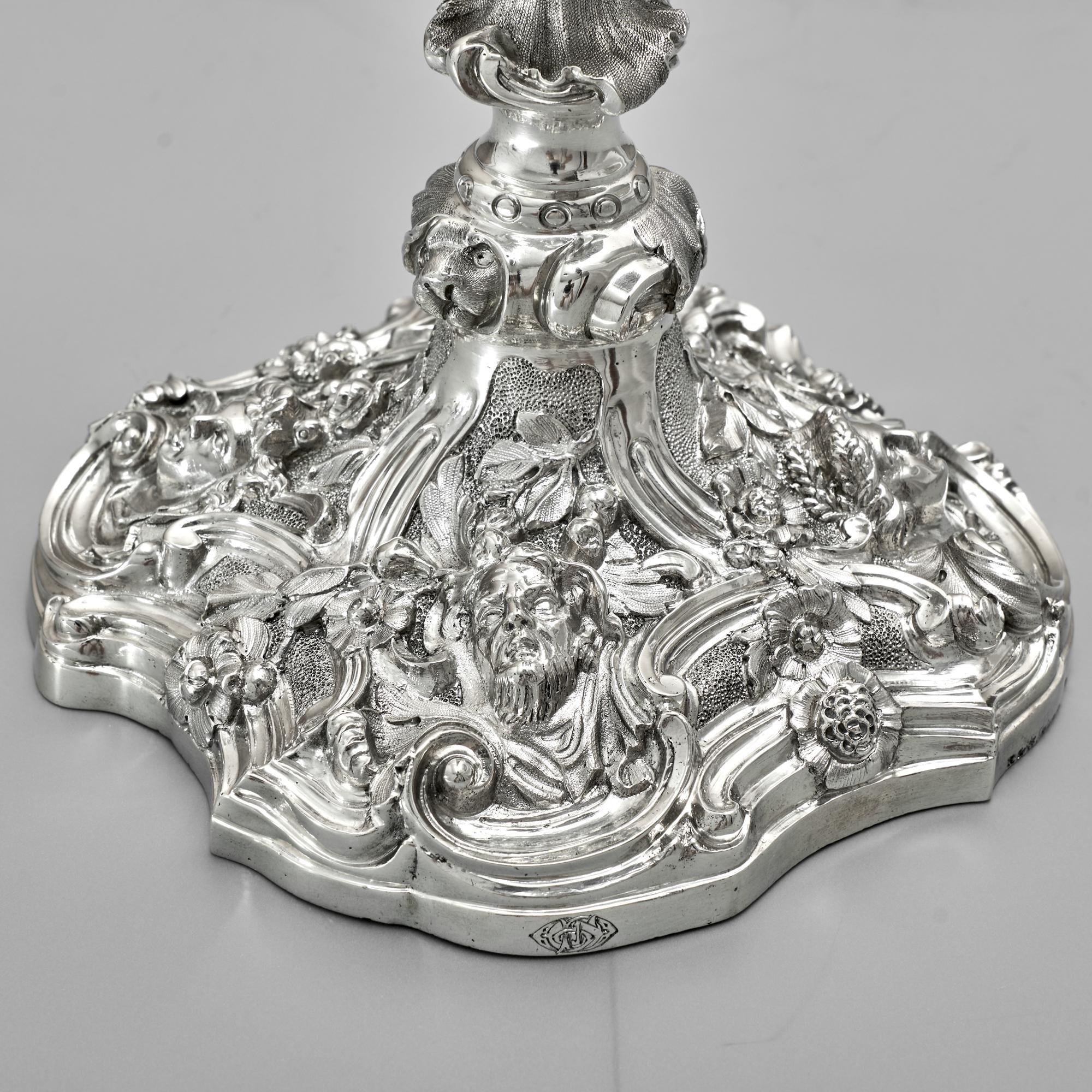 Magnificent pair of cast and hand chased silver candlesticks of superior quality.  Made by royal silversmith to Queen Victoria, Robert Garrard II of London, one of the leading silversmiths of the era, the rococo design incorporates finely detailed masks in high relief, representing the four seasons, as well as featuring scrollwork, fruit, berries, grapes, foliage and flowers - all set against a mottled background.