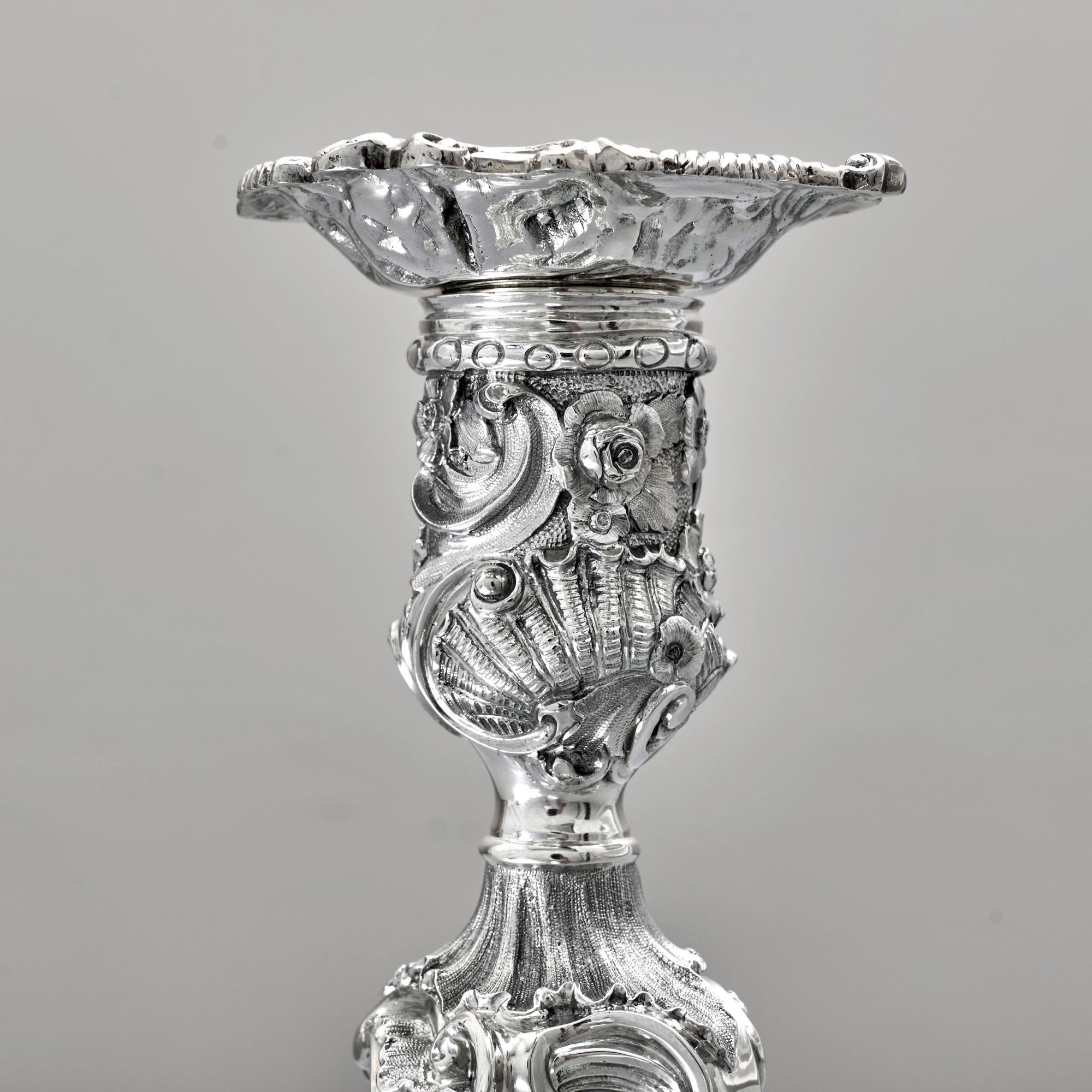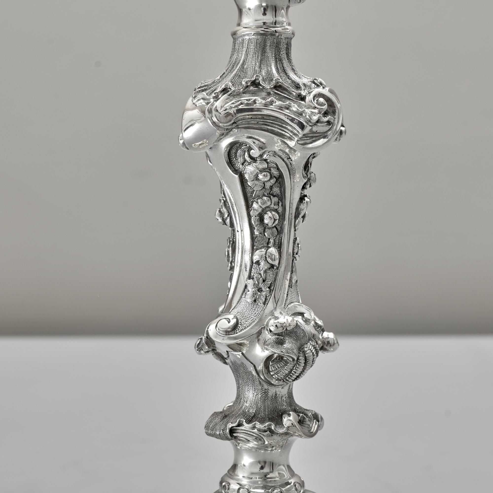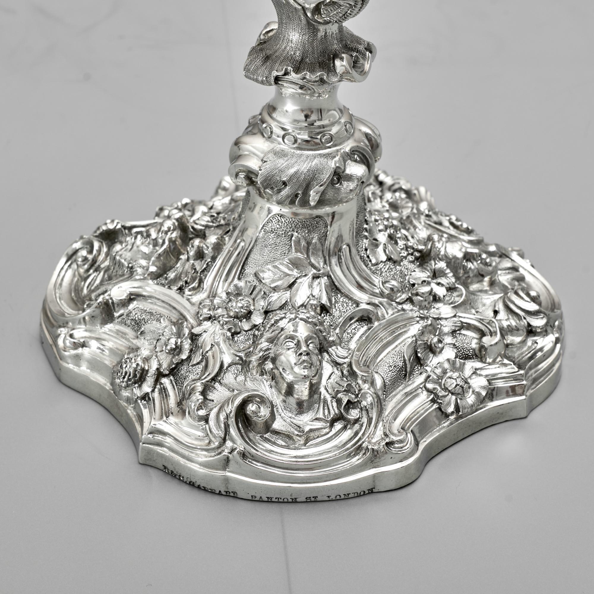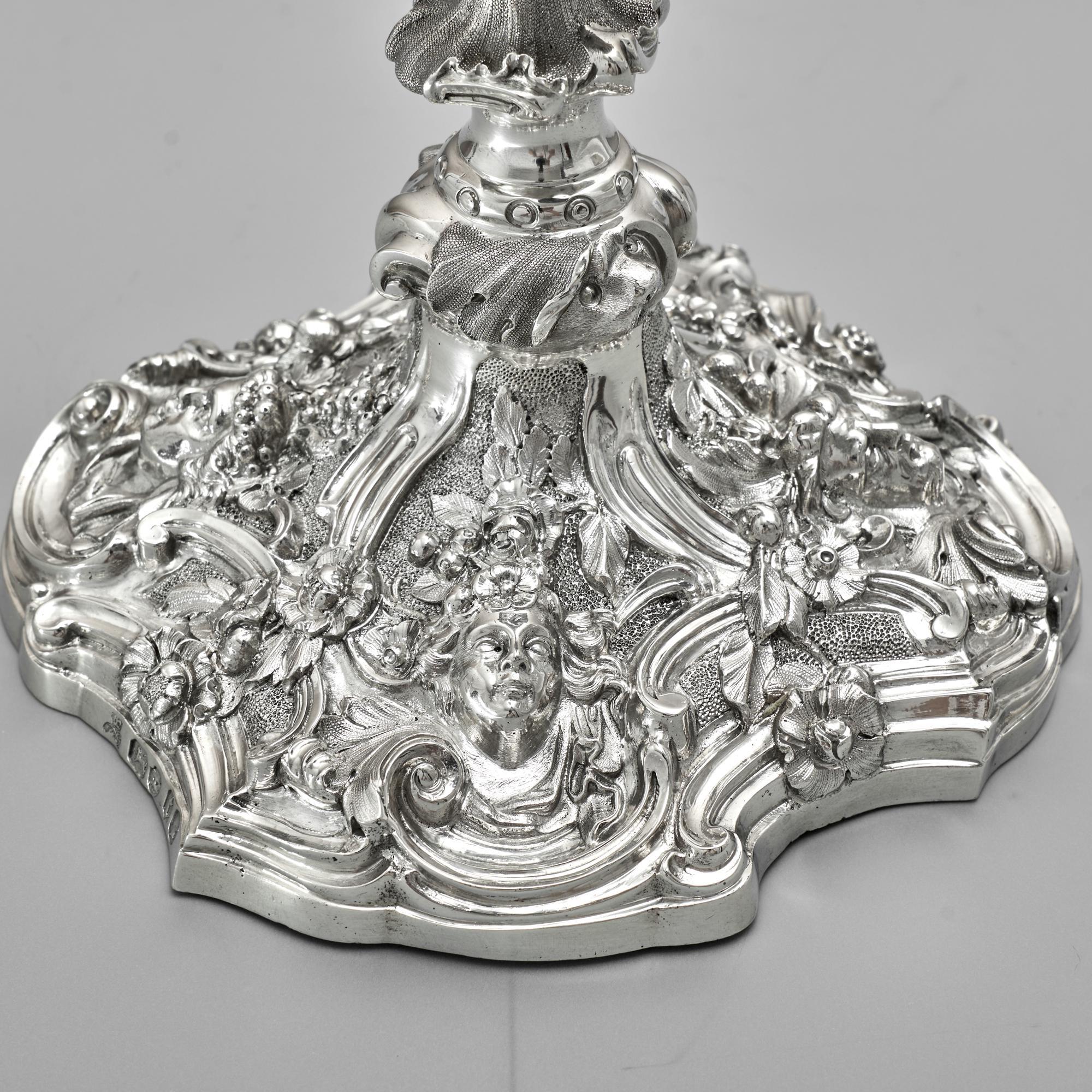 Magnificent pair of cast and hand chased silver candlesticks of superior quality.  Made by royal silversmith to Queen Victoria, Robert Garrard II of London, one of the leading silversmiths of the era, the rococo design incorporates finely detailed masks in high relief, representing the four seasons, as well as featuring scrollwork, fruit, berries, grapes, foliage and flowers - all set against a mottled background.