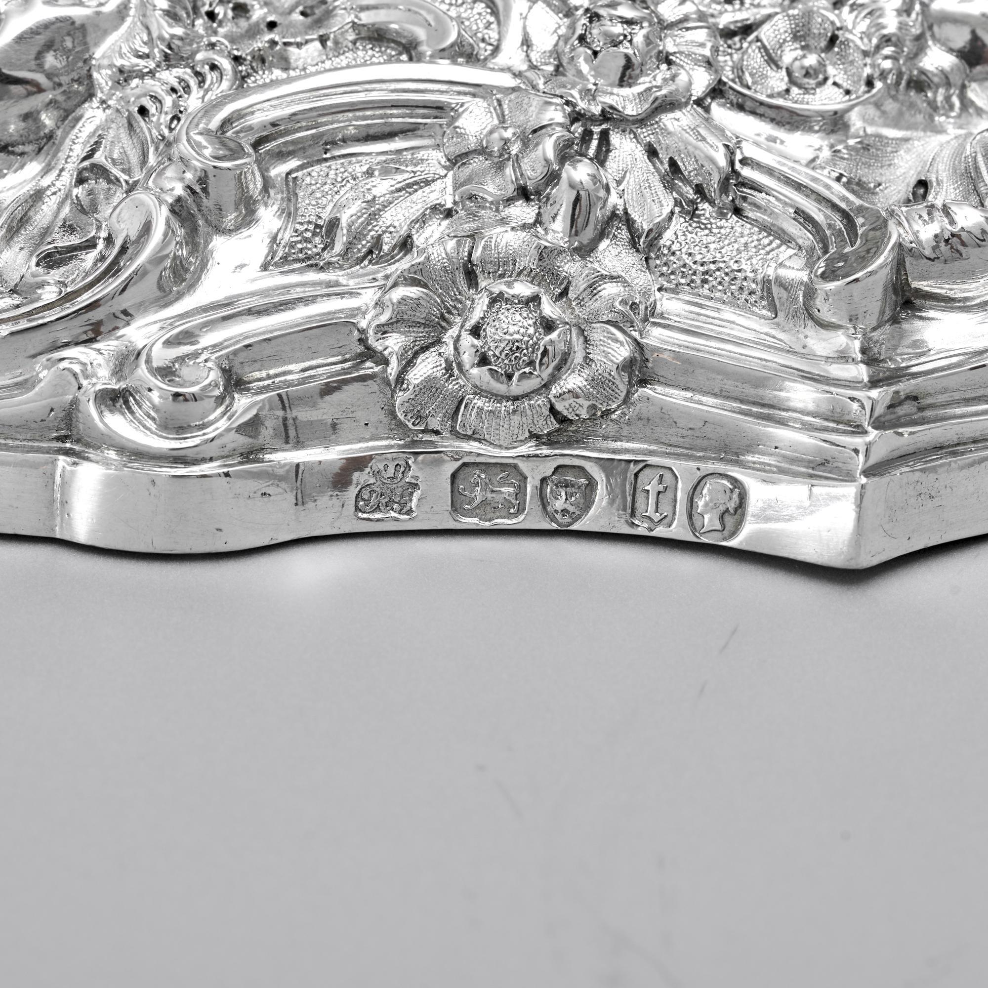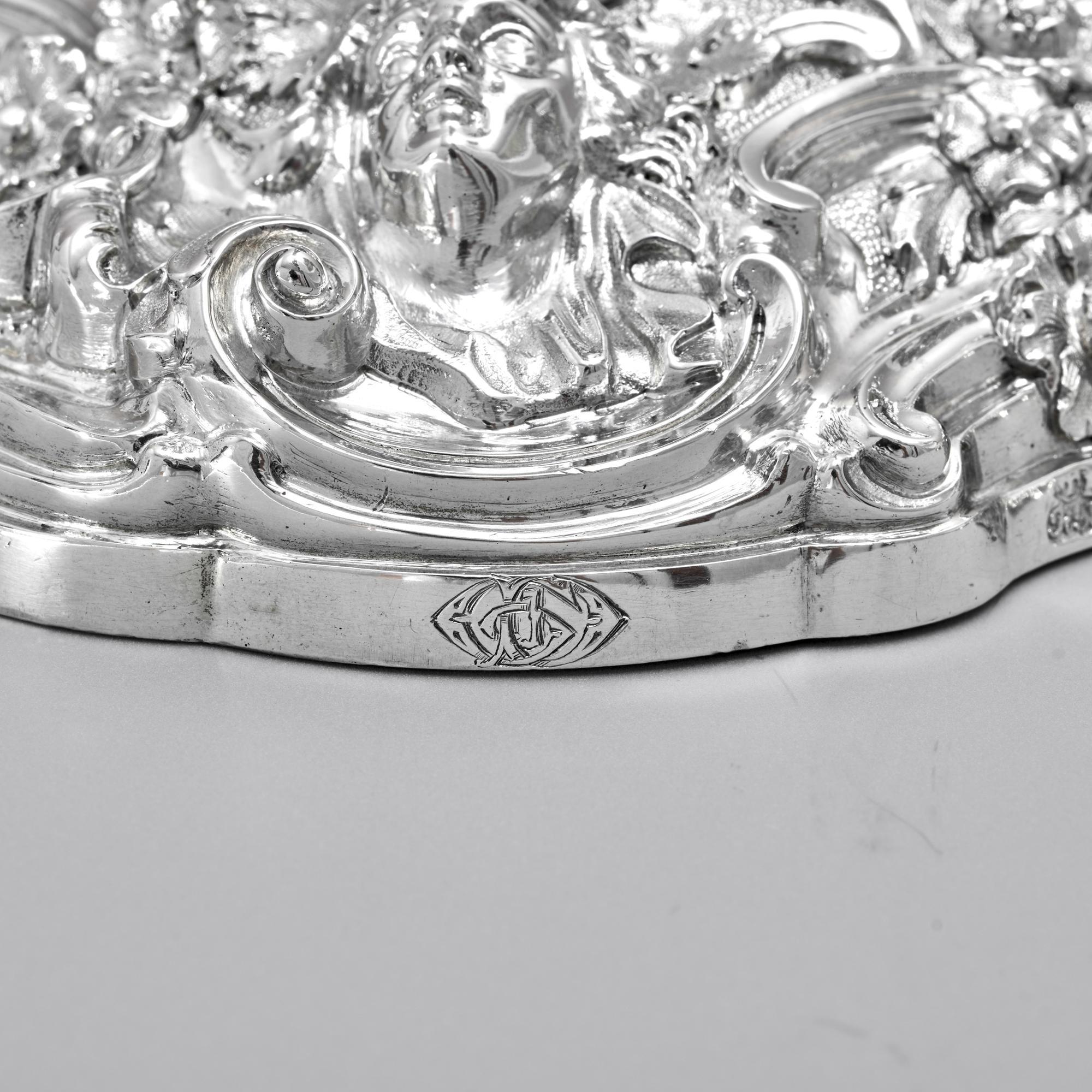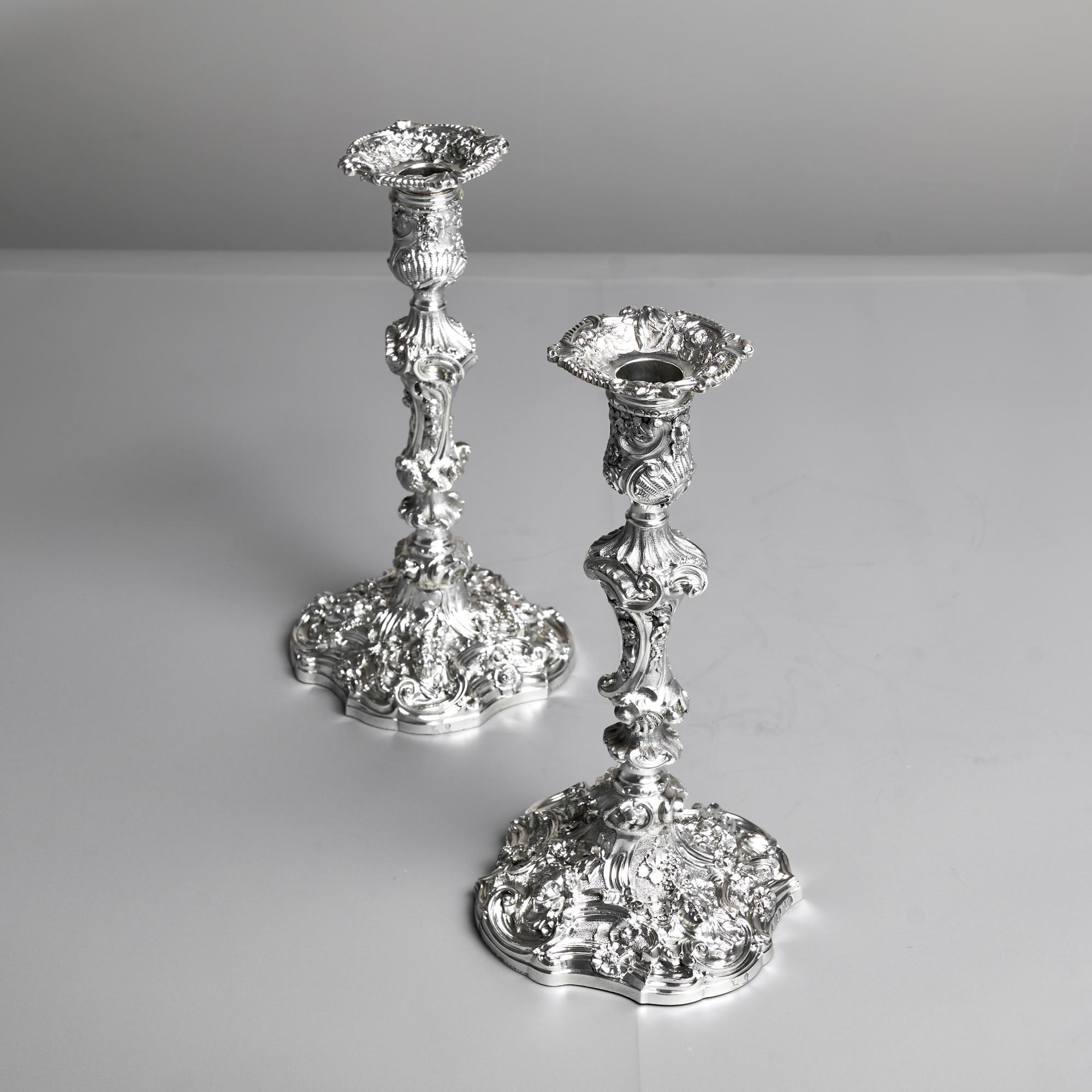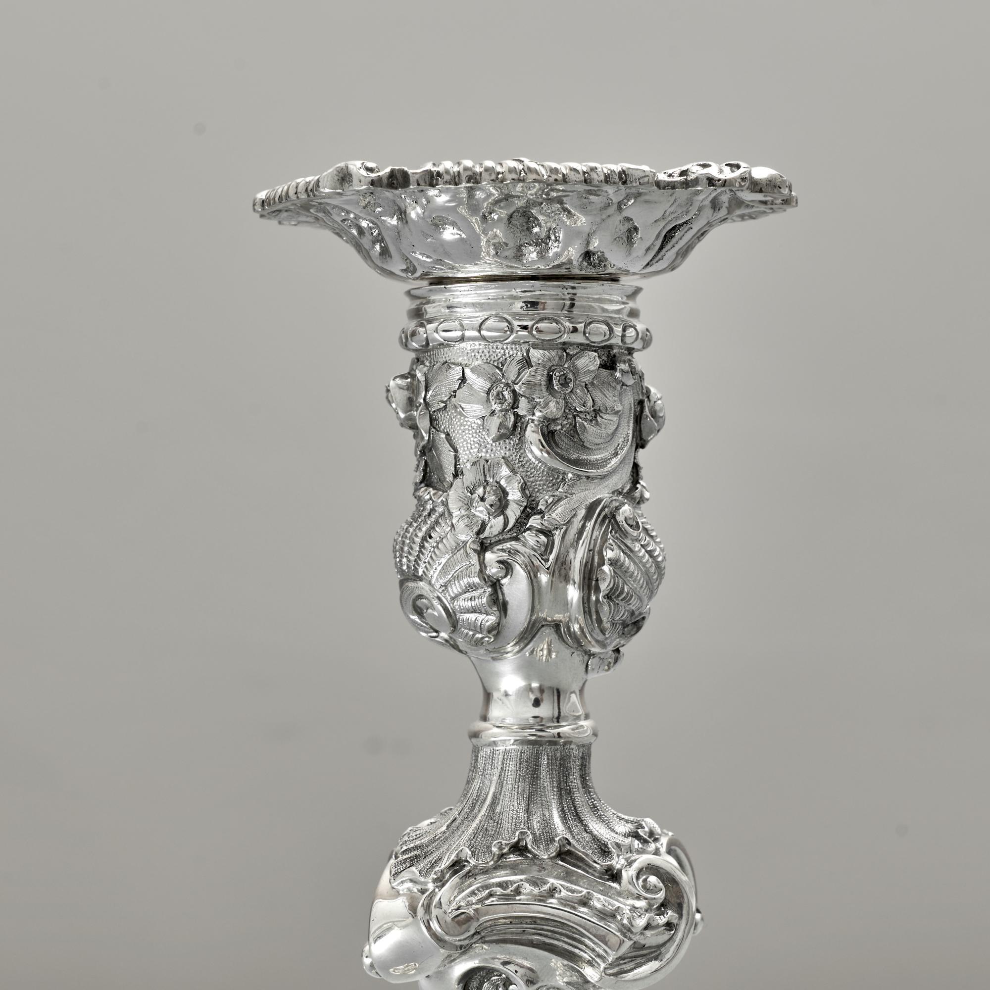 Magnificent pair of cast and hand chased silver candlesticks of superior quality.  Made by royal silversmith to Queen Victoria, Robert Garrard II of London, one of the leading silversmiths of the era, the rococo design incorporates finely detailed masks in high relief, representing the four seasons, as well as featuring scrollwork, fruit, berries, grapes, foliage and flowers - all set against a mottled background.