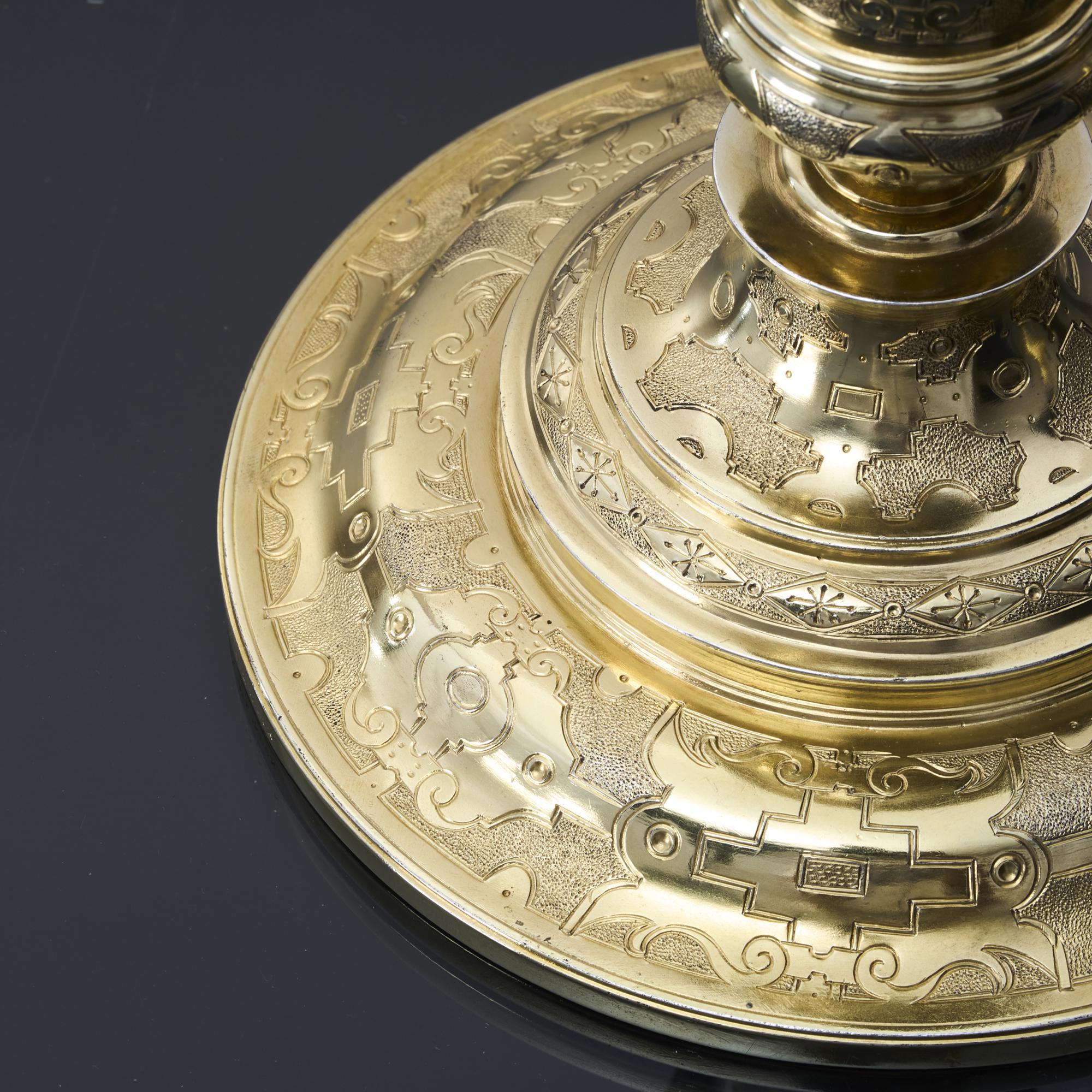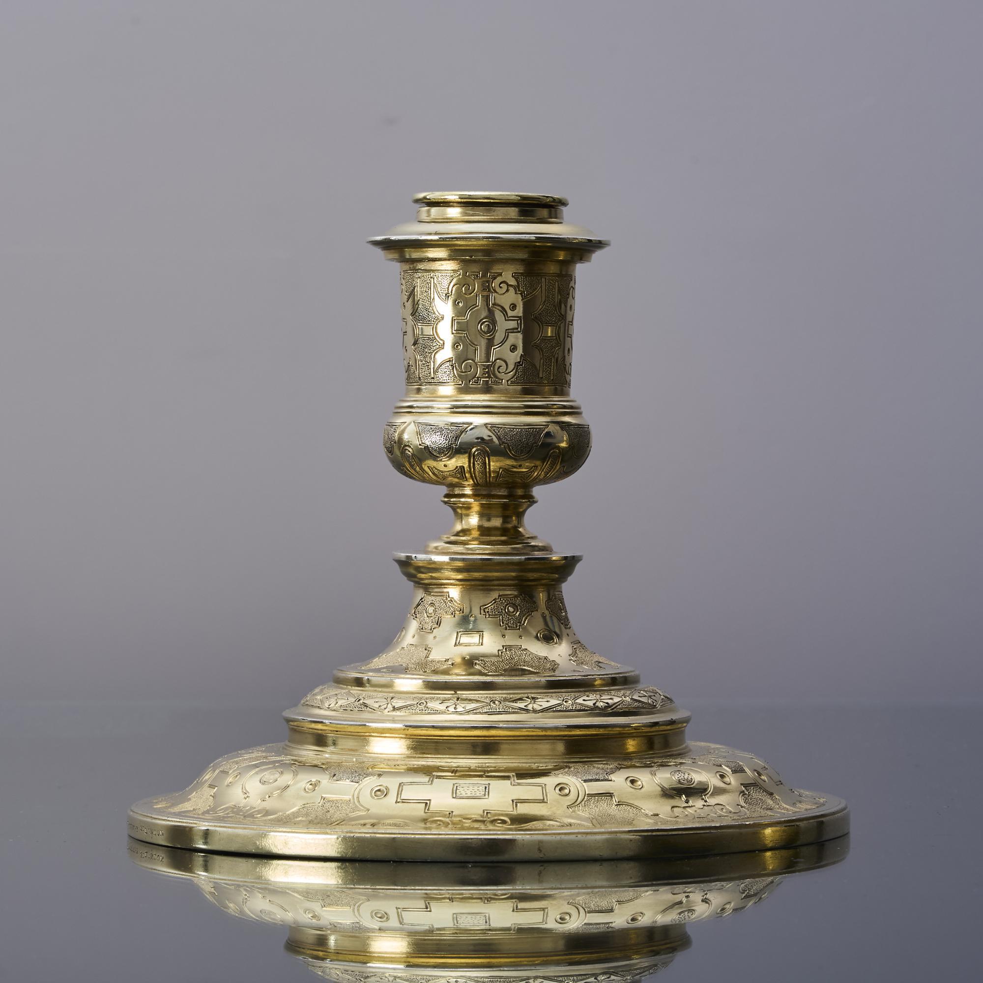 This unusual and fine pair of Victorian silver candlesticks was crafted with wide bases which make them ideal for use on board your yacht. They are beautifully proportioned and have fine hand-chased decoration with the original gold-plated finish. The decoration features scrolls and arabesques with an attractive combination of polished and textured backgrounds.