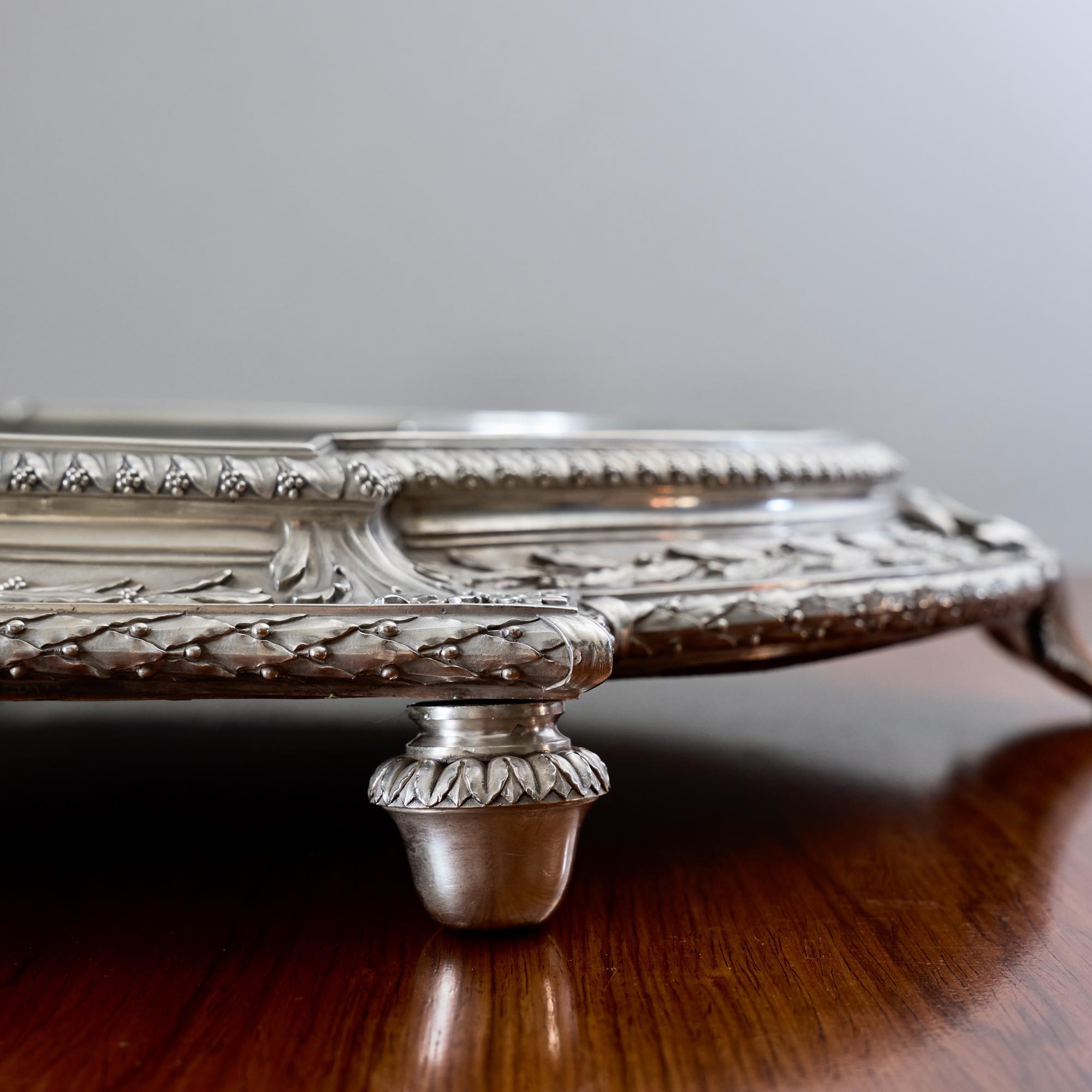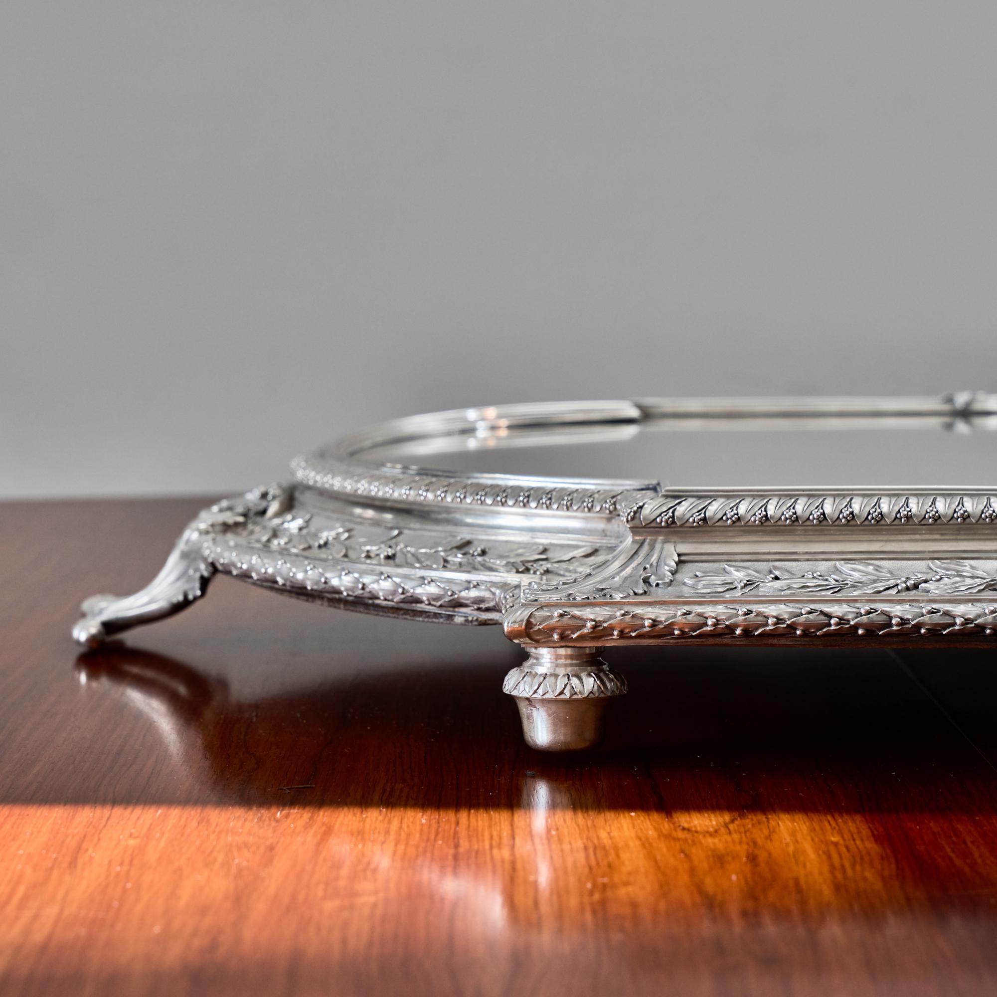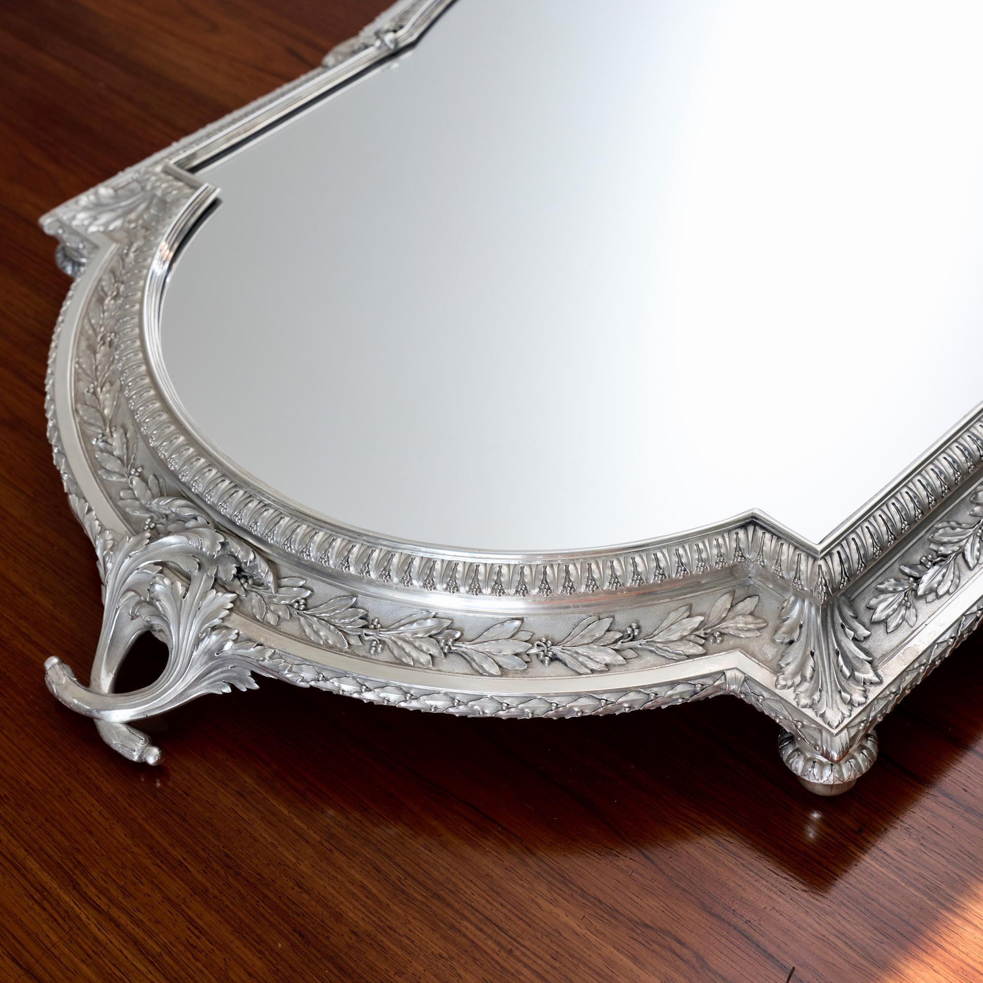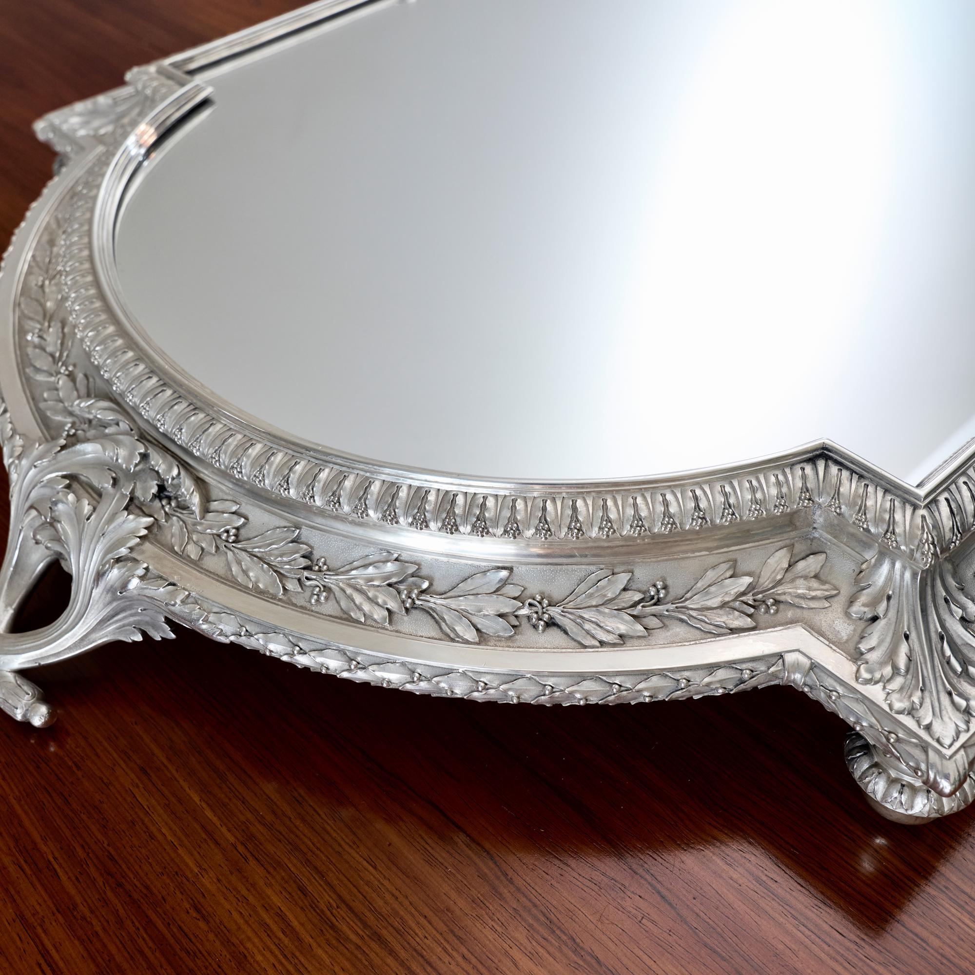 This fabulous antique French mirrored silver plateau was made by the great Parisian silversmiths, Maison Odiot, employing 1st standard French silver (950/1000). The plateau is of exceptional quality with finely cast detail of laurel leaves and berries on a textured background and laurel leaf borders above and below.