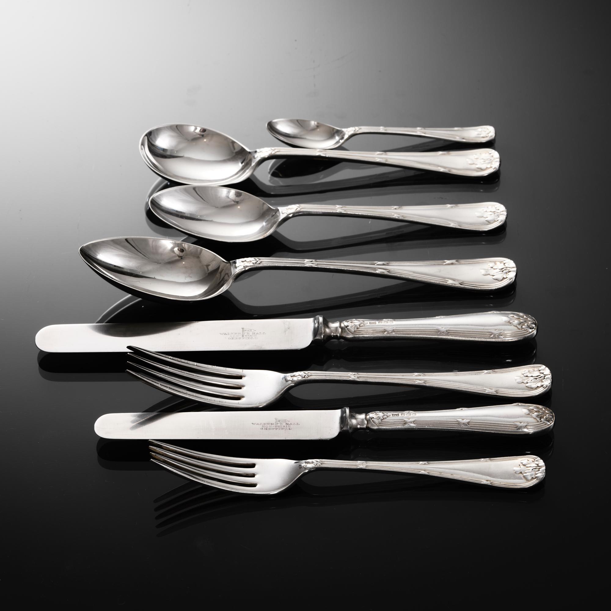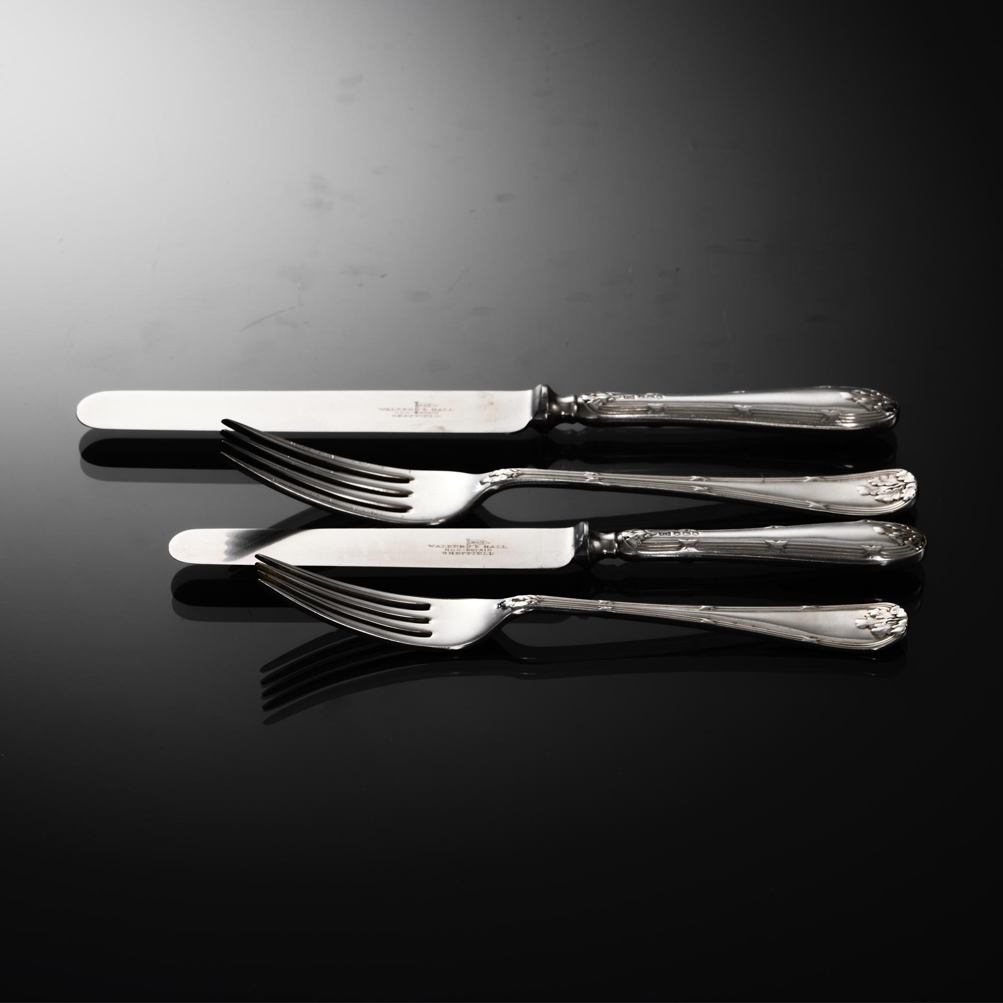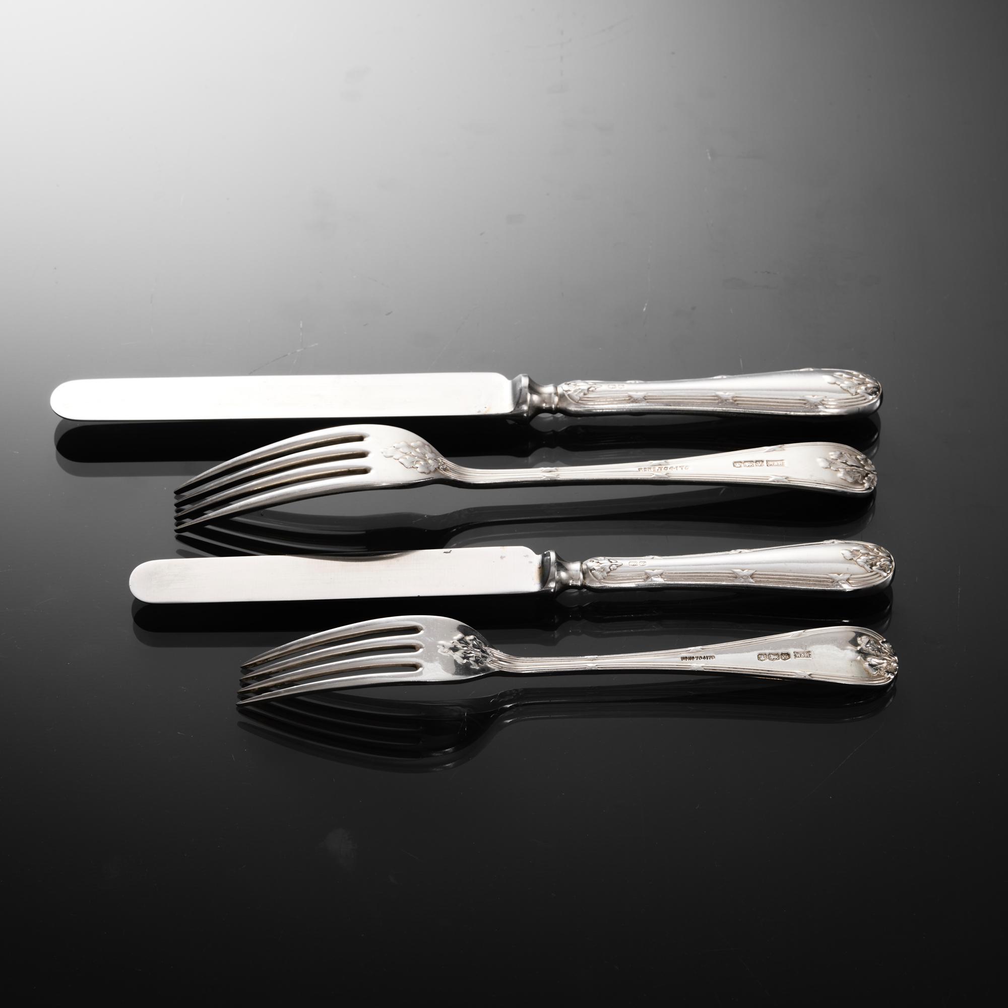 Comprehensive set of sterling silver cutlery in the Ribbon, Reed & Oakleaf pattern for 12 people, including the original knives, all fitted in a lined, three-drawer wooden canteen. Double struck - meaning that the pattern is created on both sides of the pieces - in a heavy gauge of silver, the set is in excellent and original condition. The knives are fitted with stainless steel blades soldered to hollow silver handles - the finest quality knife construction - making them suitable for cleaning in the dishwasher