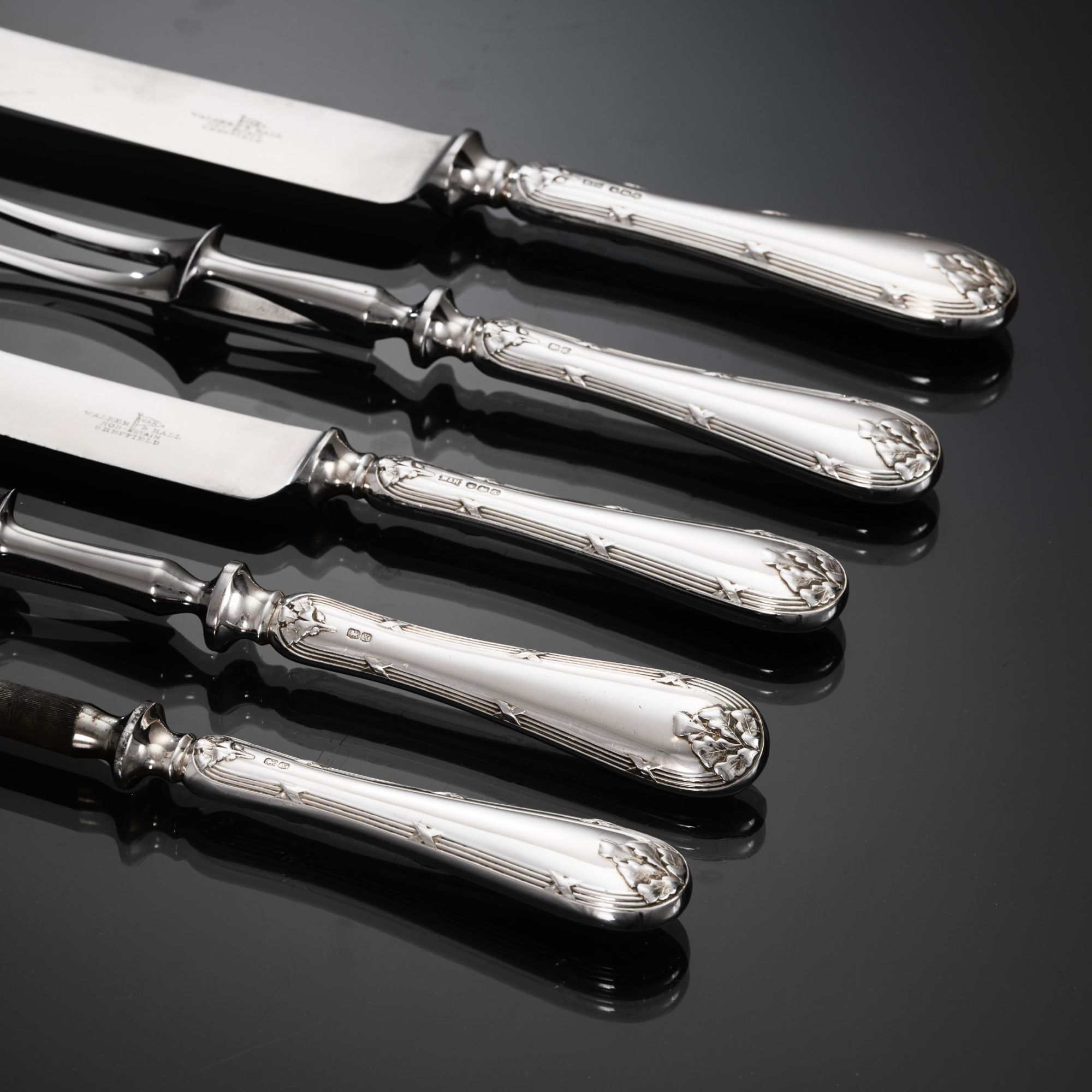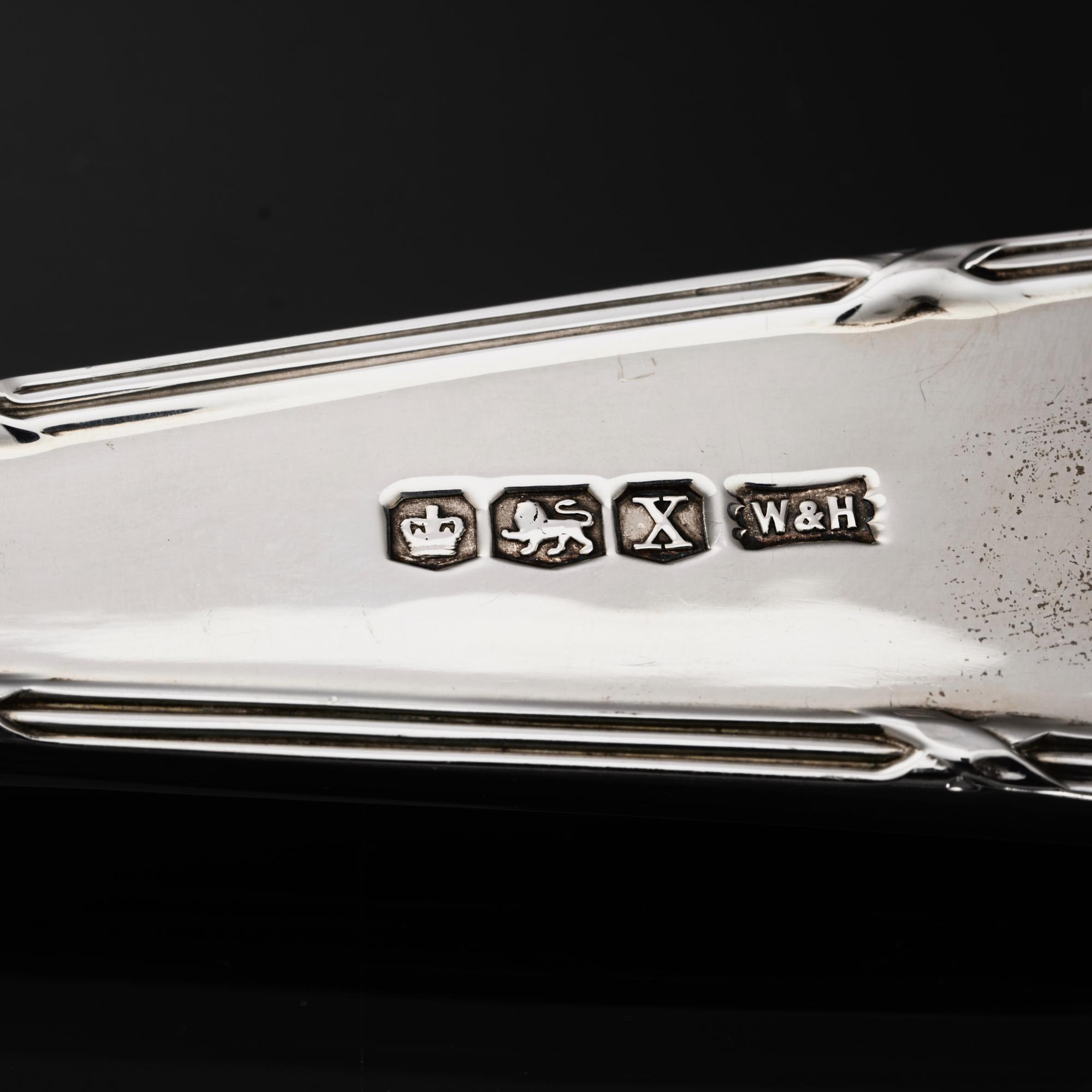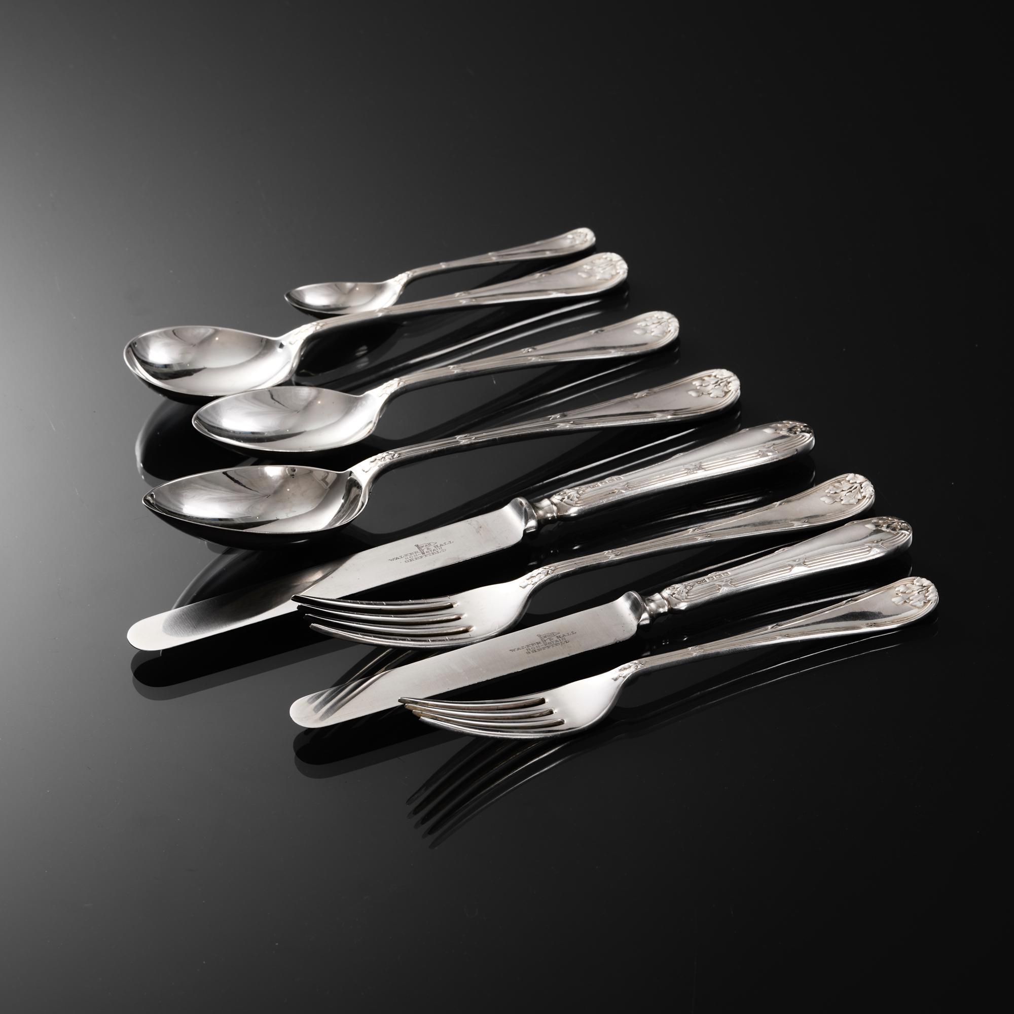 Comprehensive set of sterling silver cutlery in the Ribbon, Reed & Oakleaf pattern for 12 people, including the original knives, all fitted in a lined, three-drawer wooden canteen. Double struck - meaning that the pattern is created on both sides of the pieces - in a heavy gauge of silver, the set is in excellent and original condition. The knives are fitted with stainless steel blades soldered to hollow silver handles - the finest quality knife construction - making them suitable for cleaning in the dishwasher