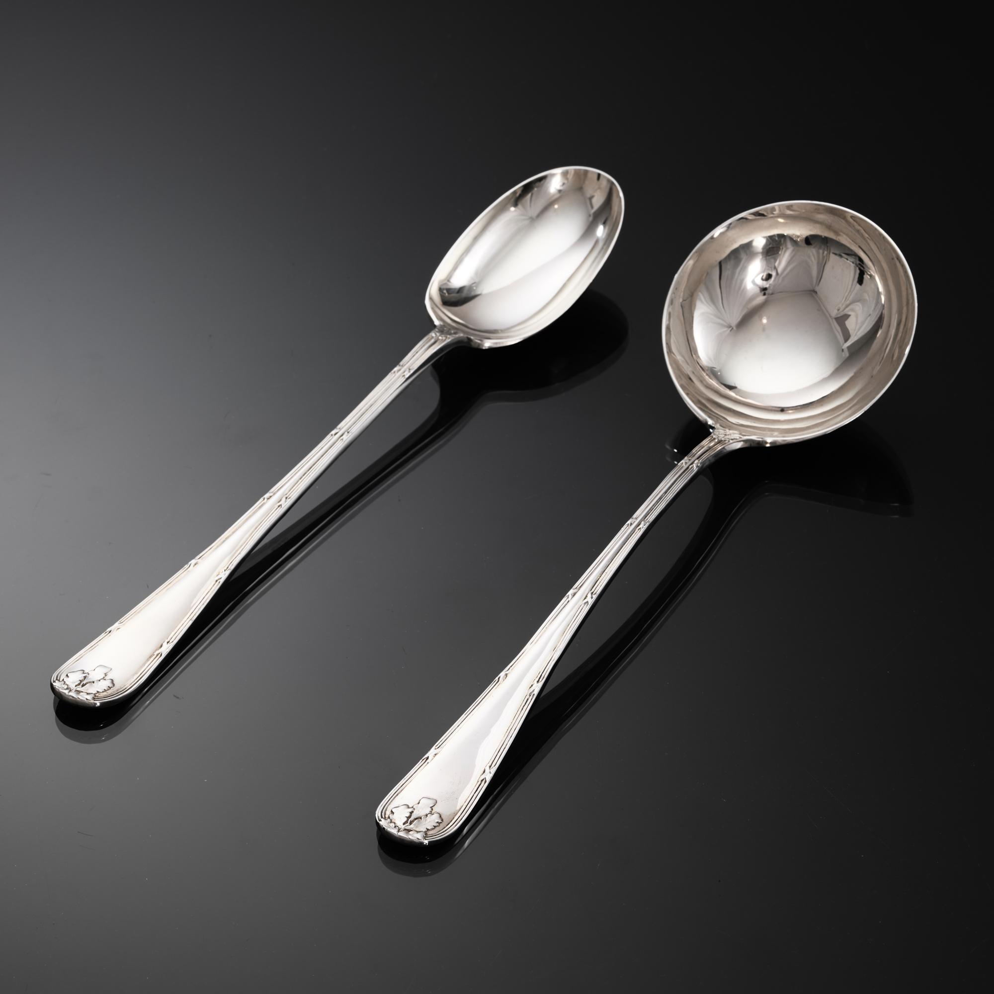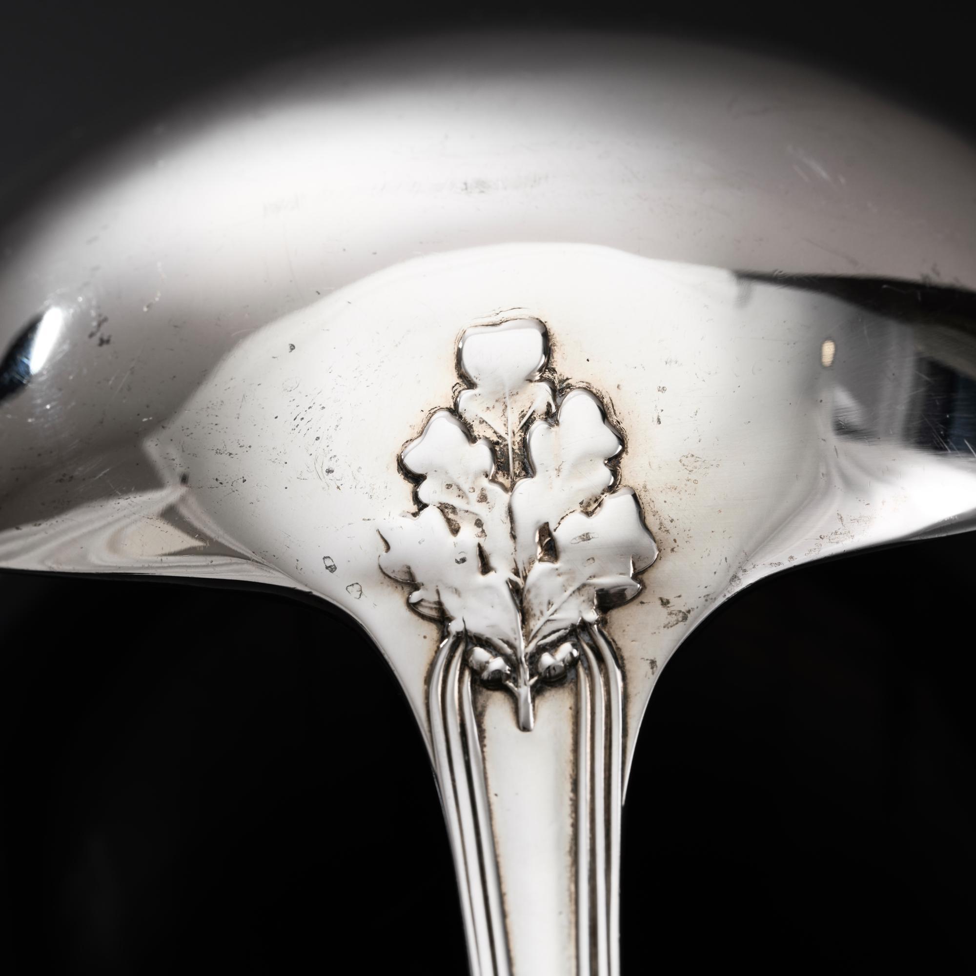 The "ribbon, reed & oak leaf" pattern is a variation of classic European cutlery designs, combining elements from the enduring English Reed & Ribbon and King's patterns. The design elements date back to the late 18th and early 19th centuries, a time when elaborate, ornate styles became popular in aristocratic and later middle class dining.