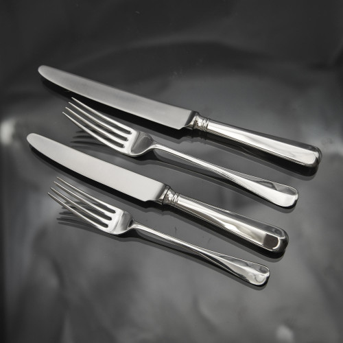 Since antique knives rarely survive, we have included 12 new pairs of silver table and dessert knives with rattail handles as in these photographs, or traditional pistol-shaped handles. All are made with stainless steel handles making them safe for putting in the dishwasher.