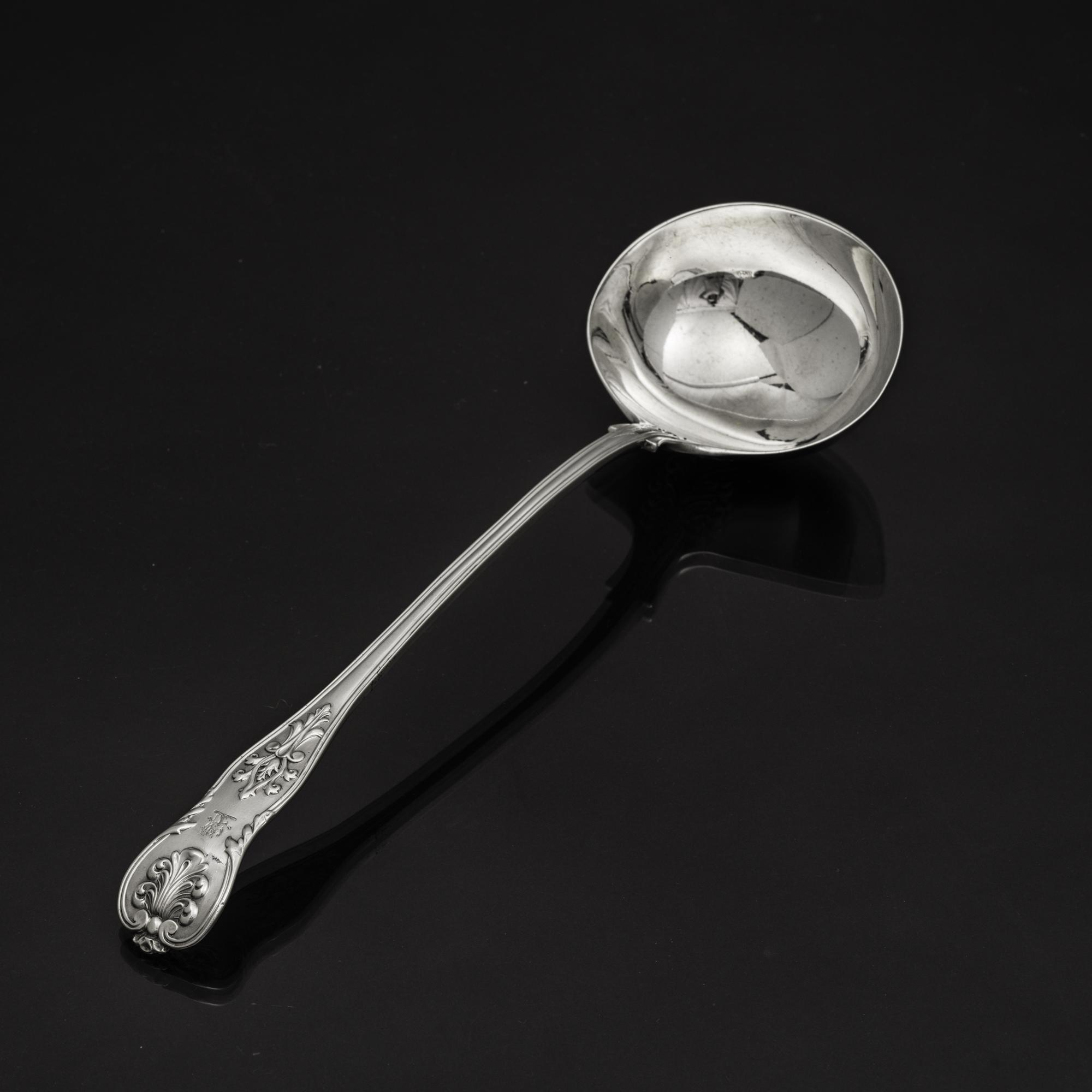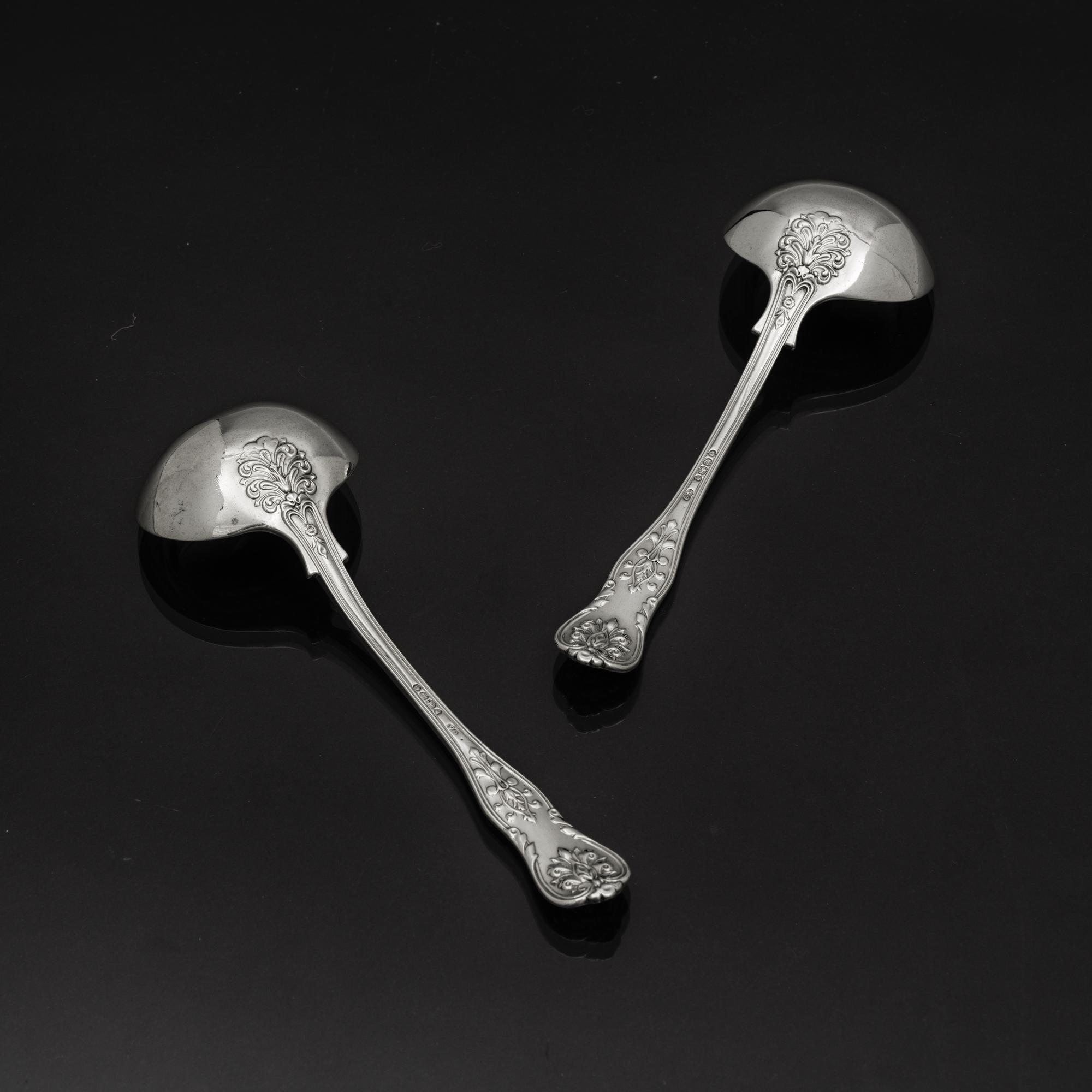 Since antique silver knives rarely survive, the service is completed with 12 pairs of modern knives with silver handles the complementary Queen's pattern. The knives are fitted with stainless steel blades making them suitable for putting in the dishwasher.
