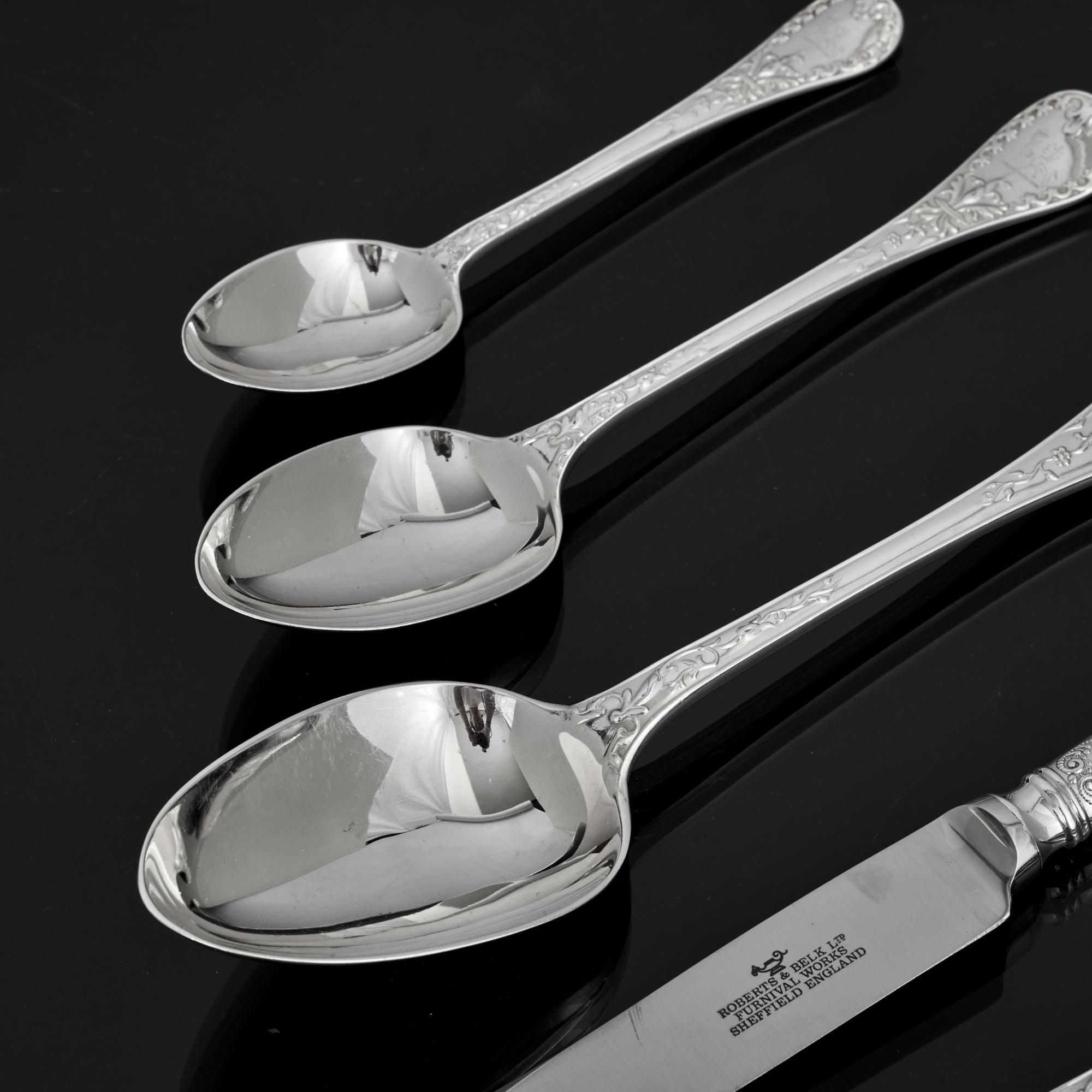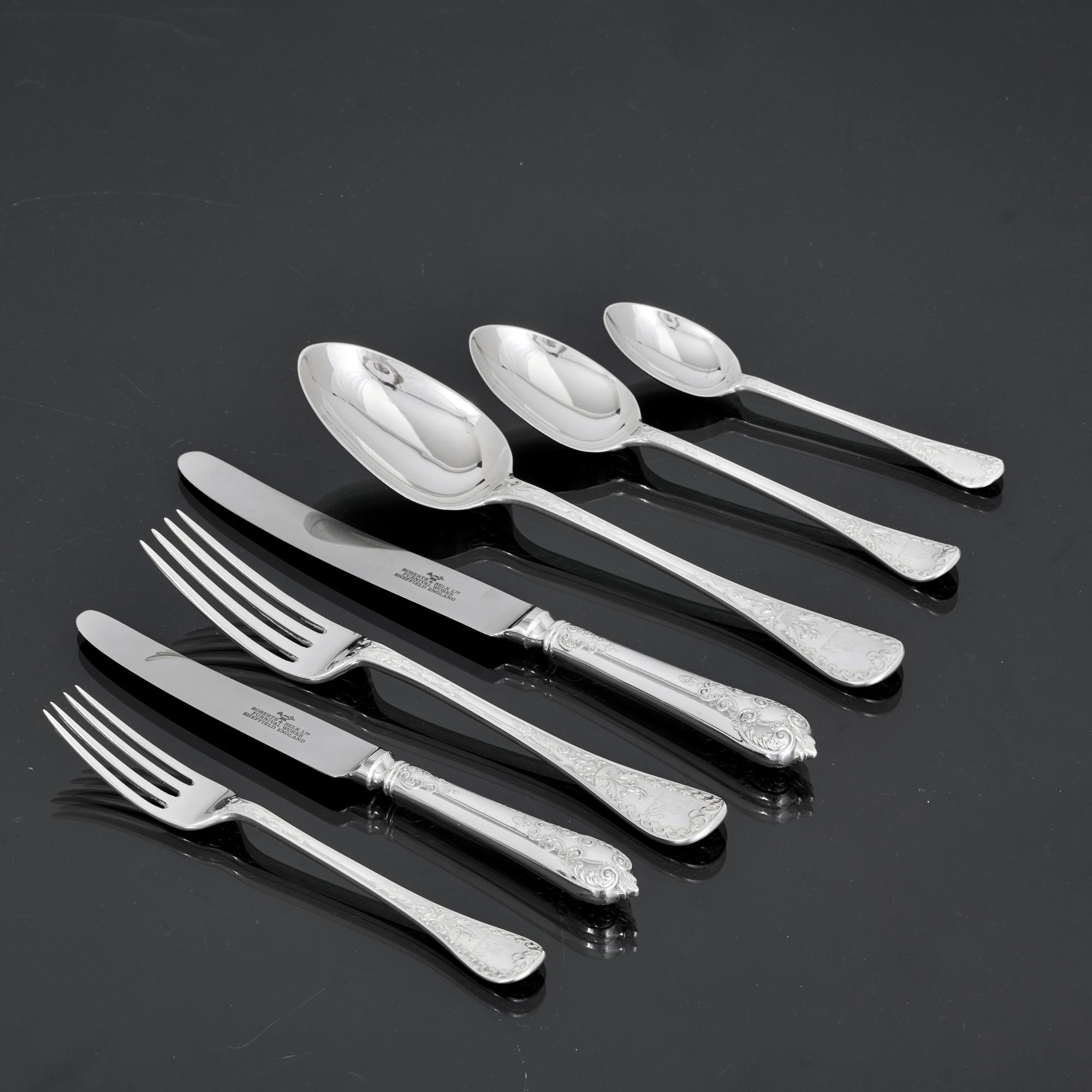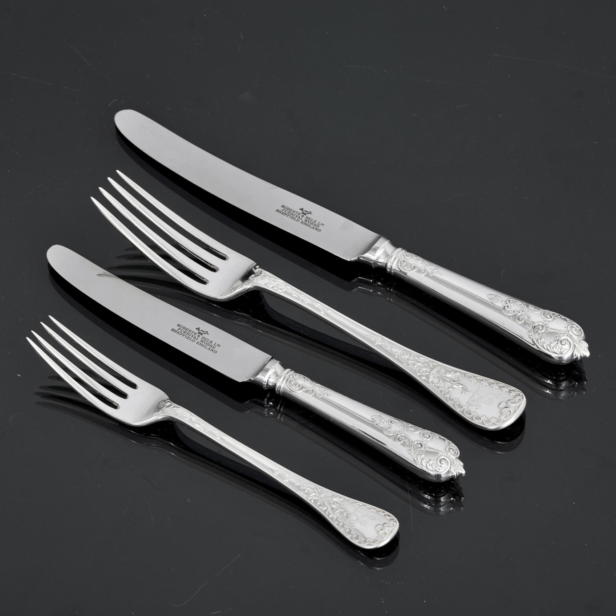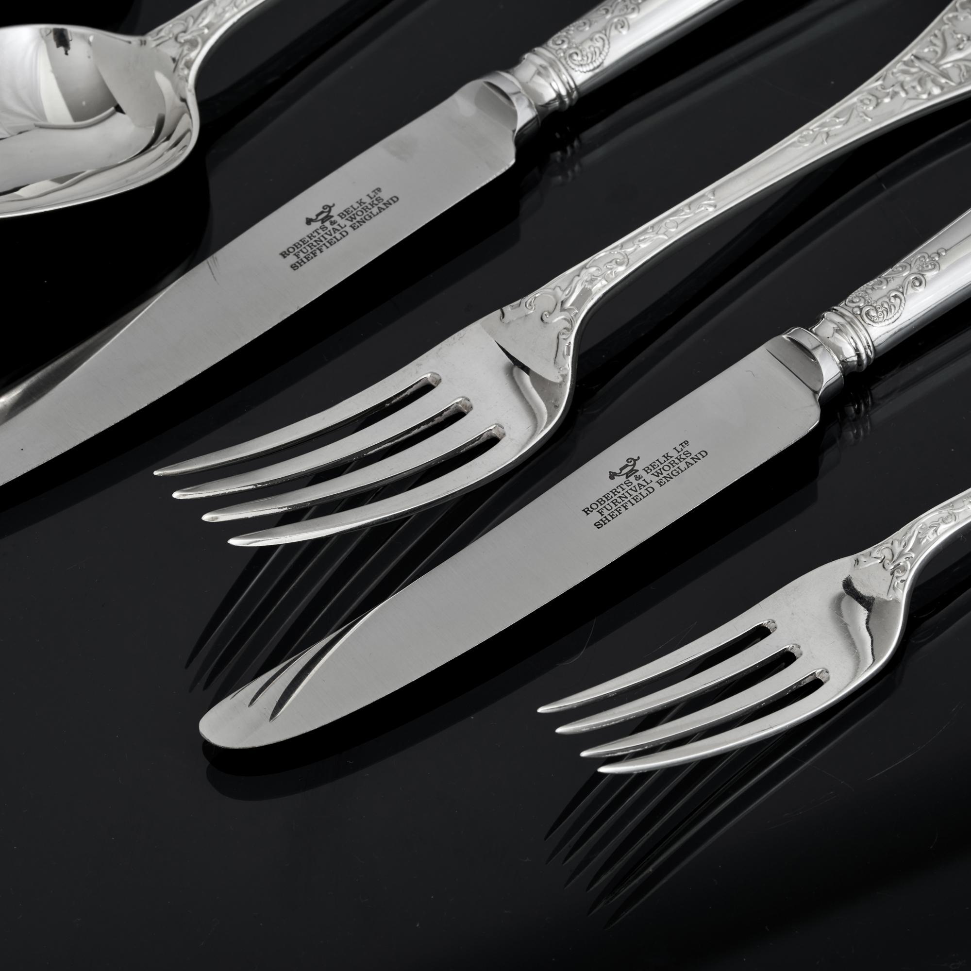 Antique knives in any antique cutlery set rarely survive. We have completed this service with 12 pairs of modern silver table and dessert knives in the Charles II Laceback pattern which are a good complementary match to the set. Fitted with stainless steel blades, they are dishwasher safe.