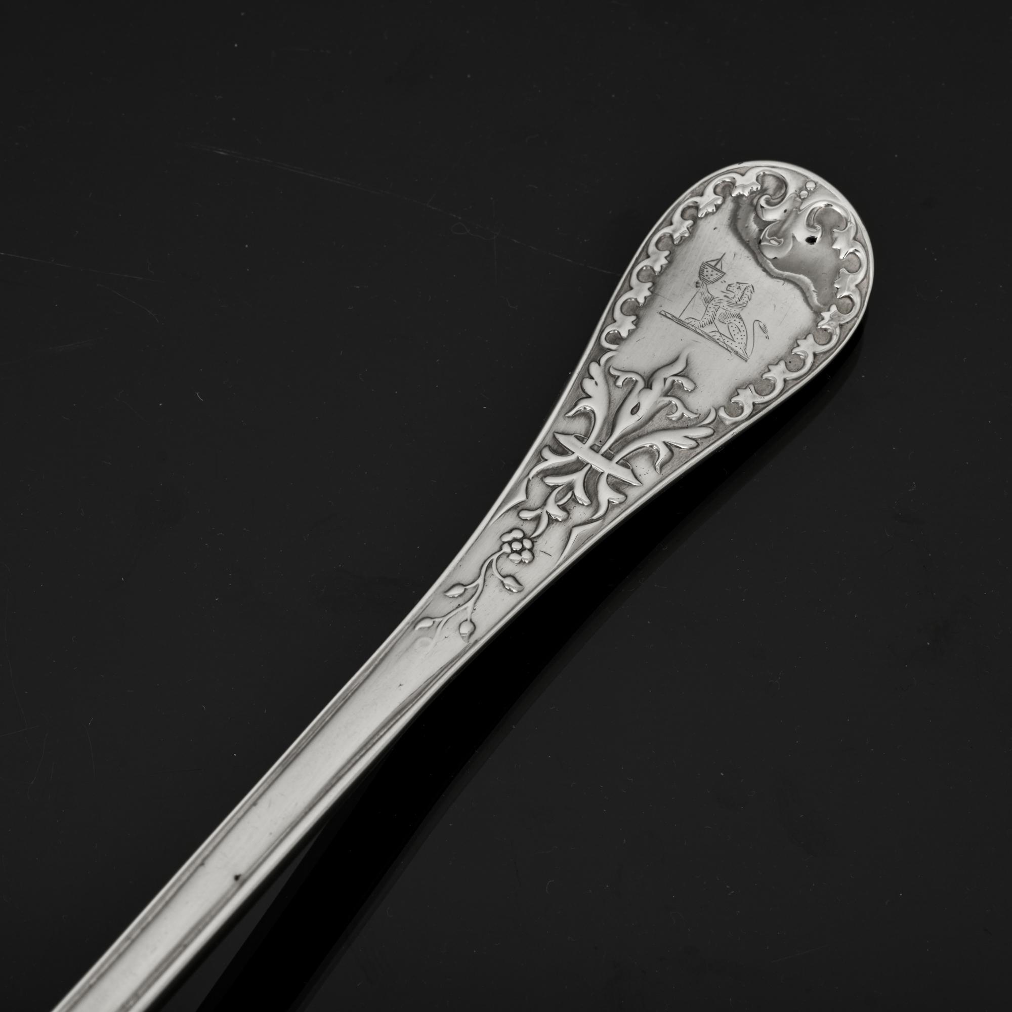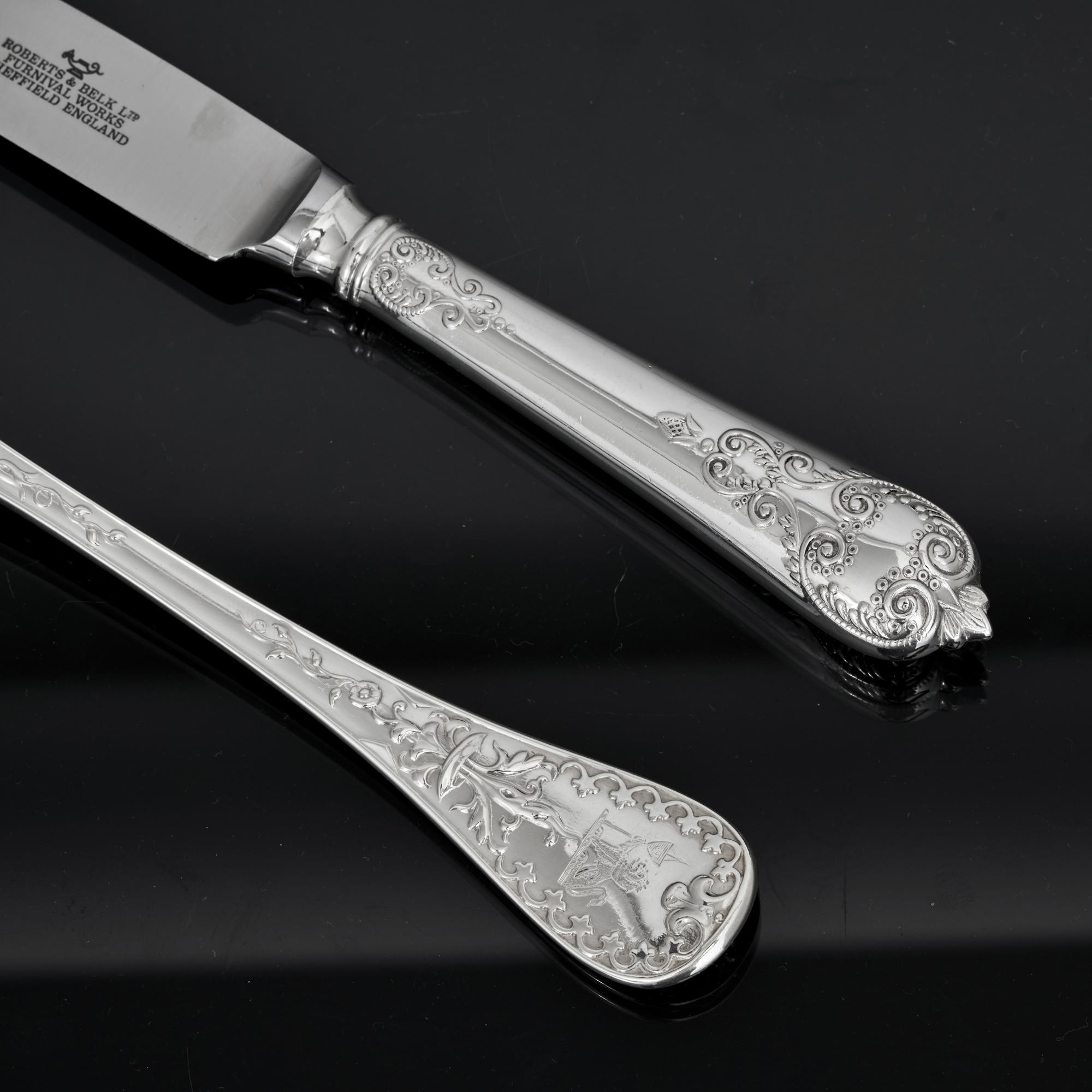 The Paxton pattern reflects life as a gardener and features a central flower with trailing and scrolling foliage that forms a shield, surrounded by a gothic border. An unidentified crest sits inside the shield. All pieces are double-struck, meaning the pattern is forged on both sides which and is a sign of superior quality.