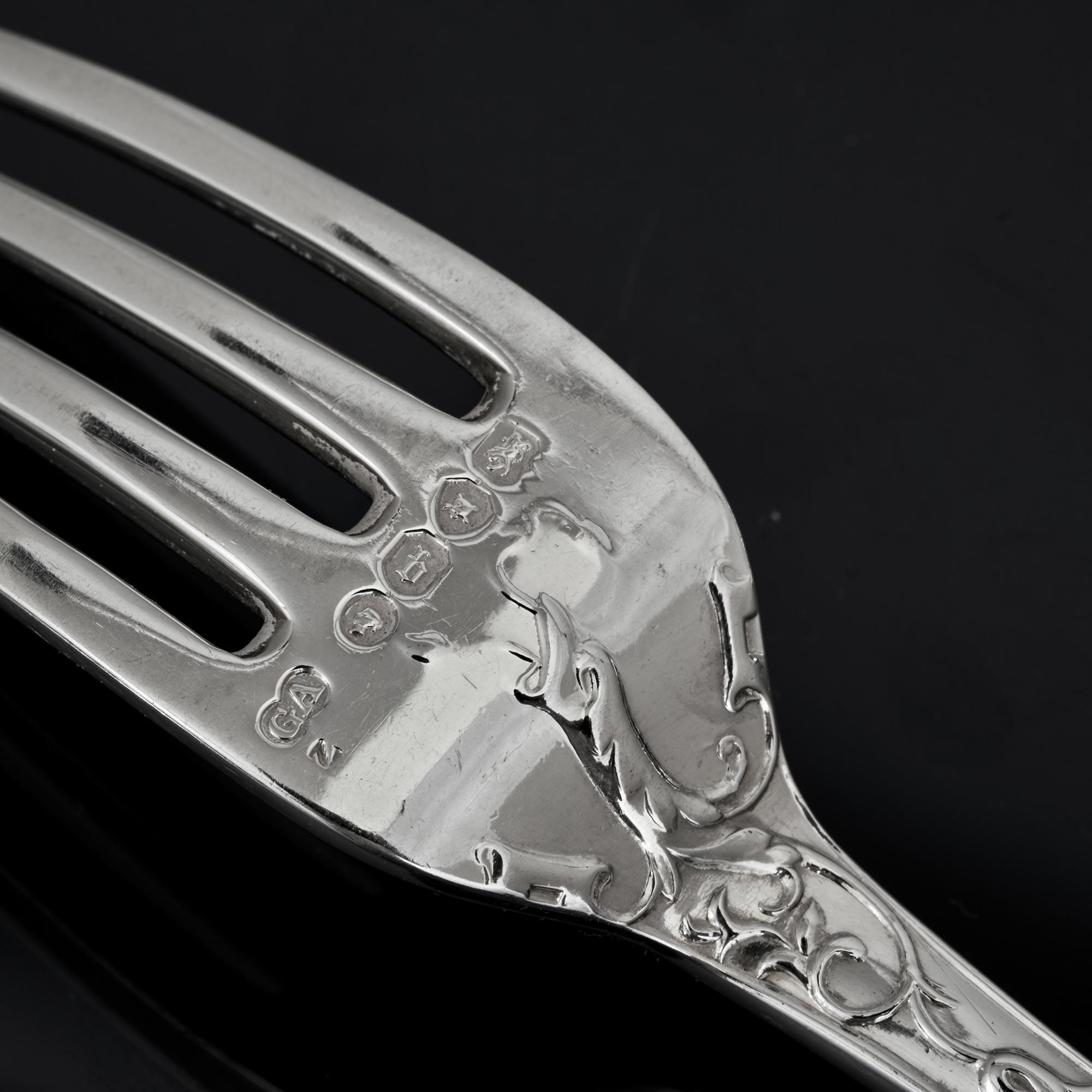 In a very rare 19th century design named after Sir Joseph Paxton, this is a lovely hand-forged antique set of silver cutlery for 12 people made by George Adams, the premier silver flatware maker of the Victorian era.
