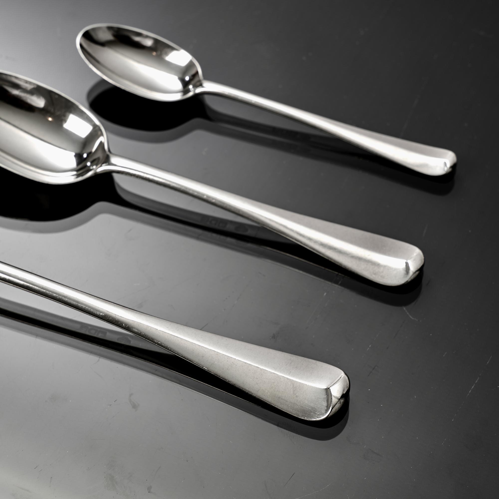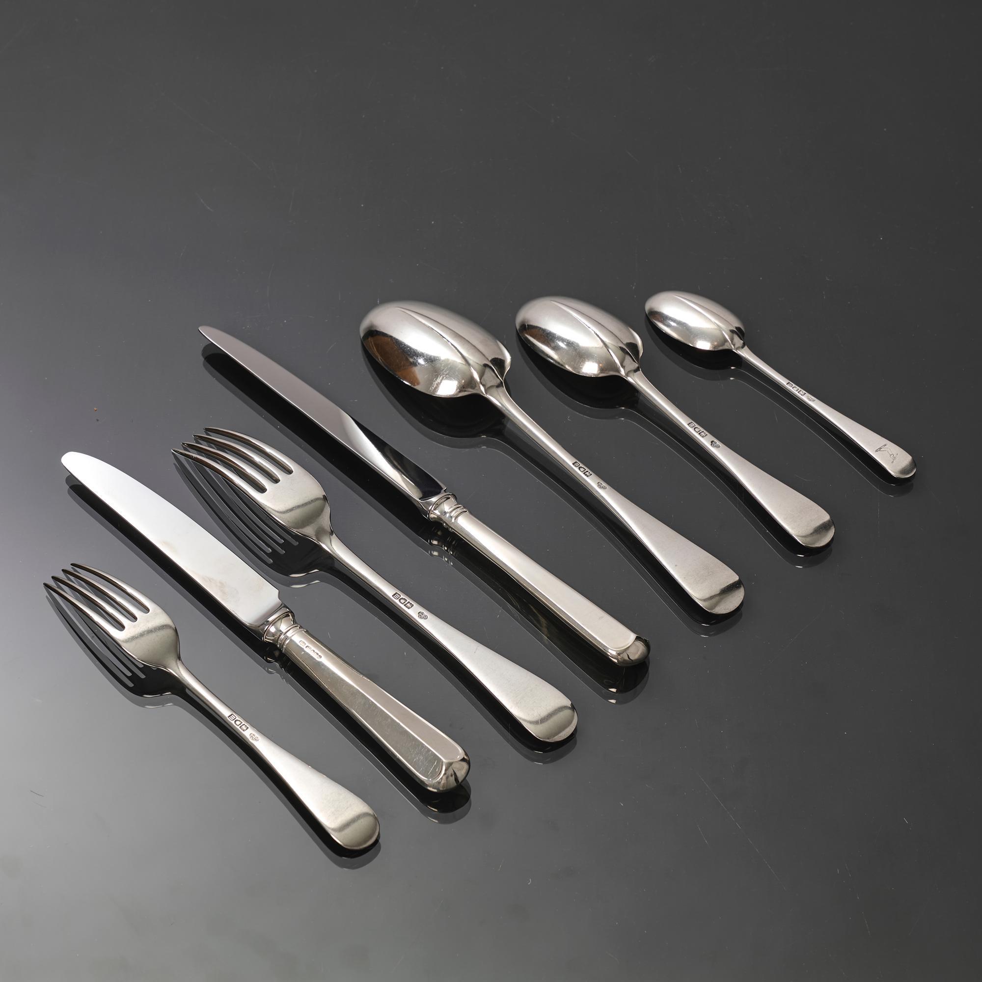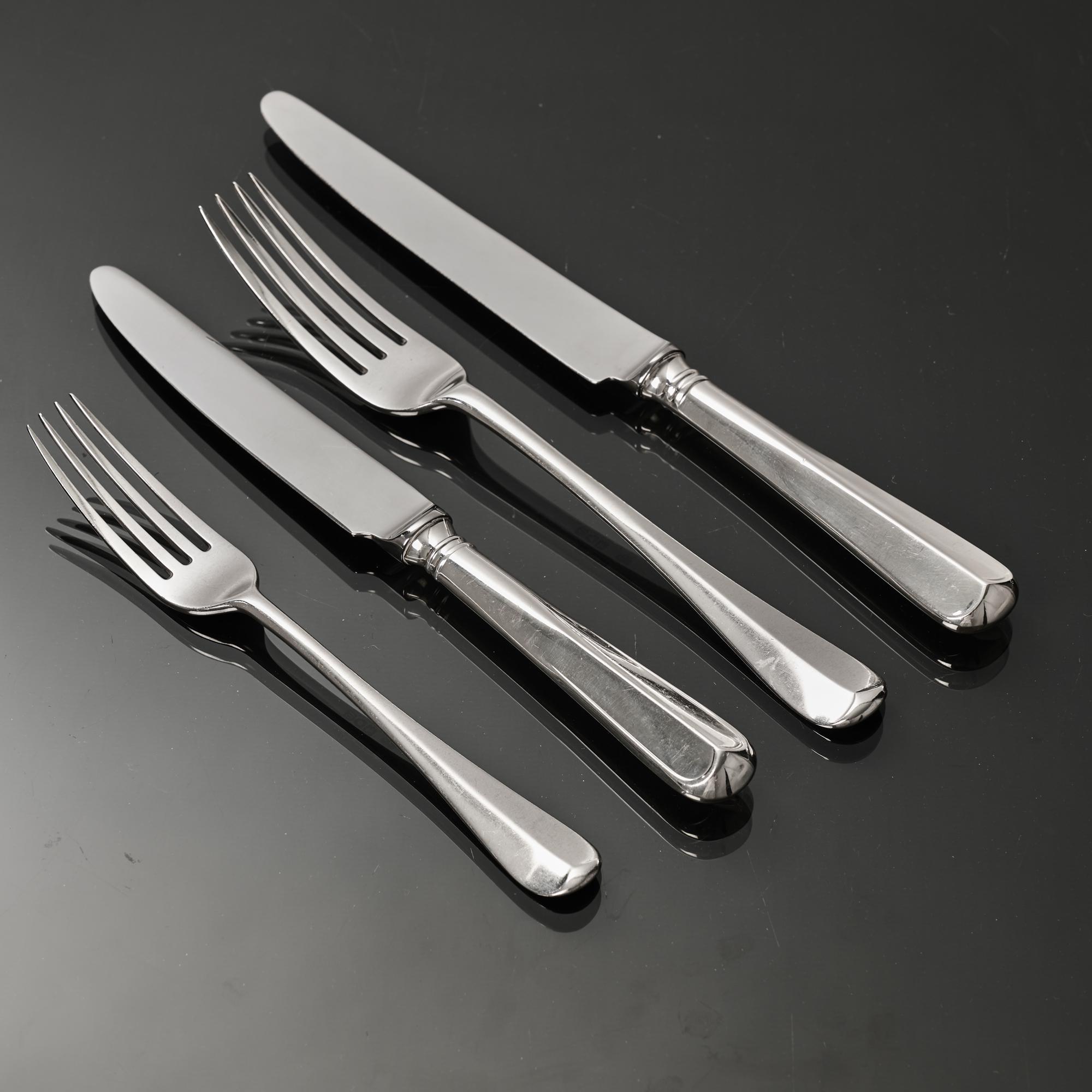 - Set of antique Edwardian hand-forged 4-prong Rattail pattern silver cutlery for 24