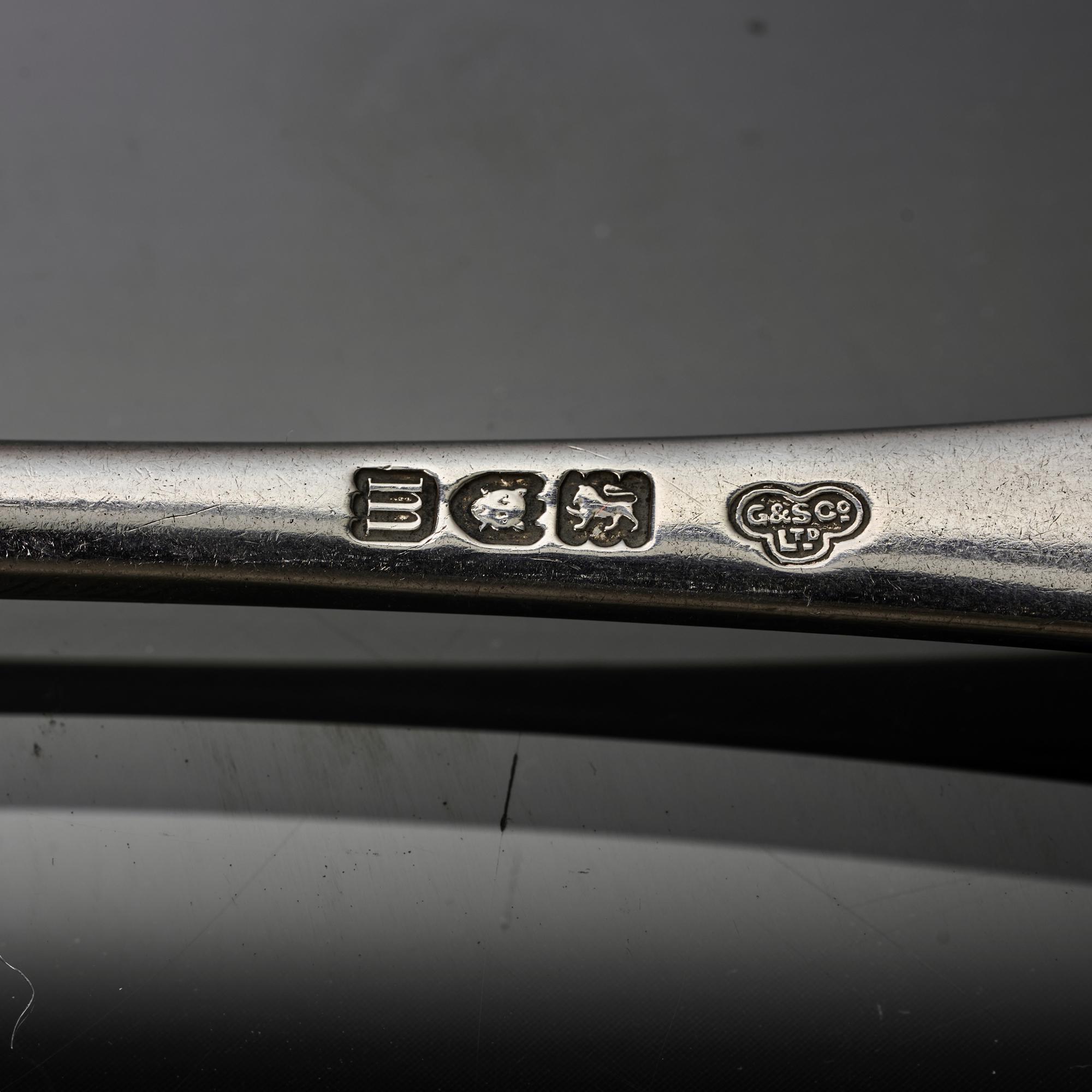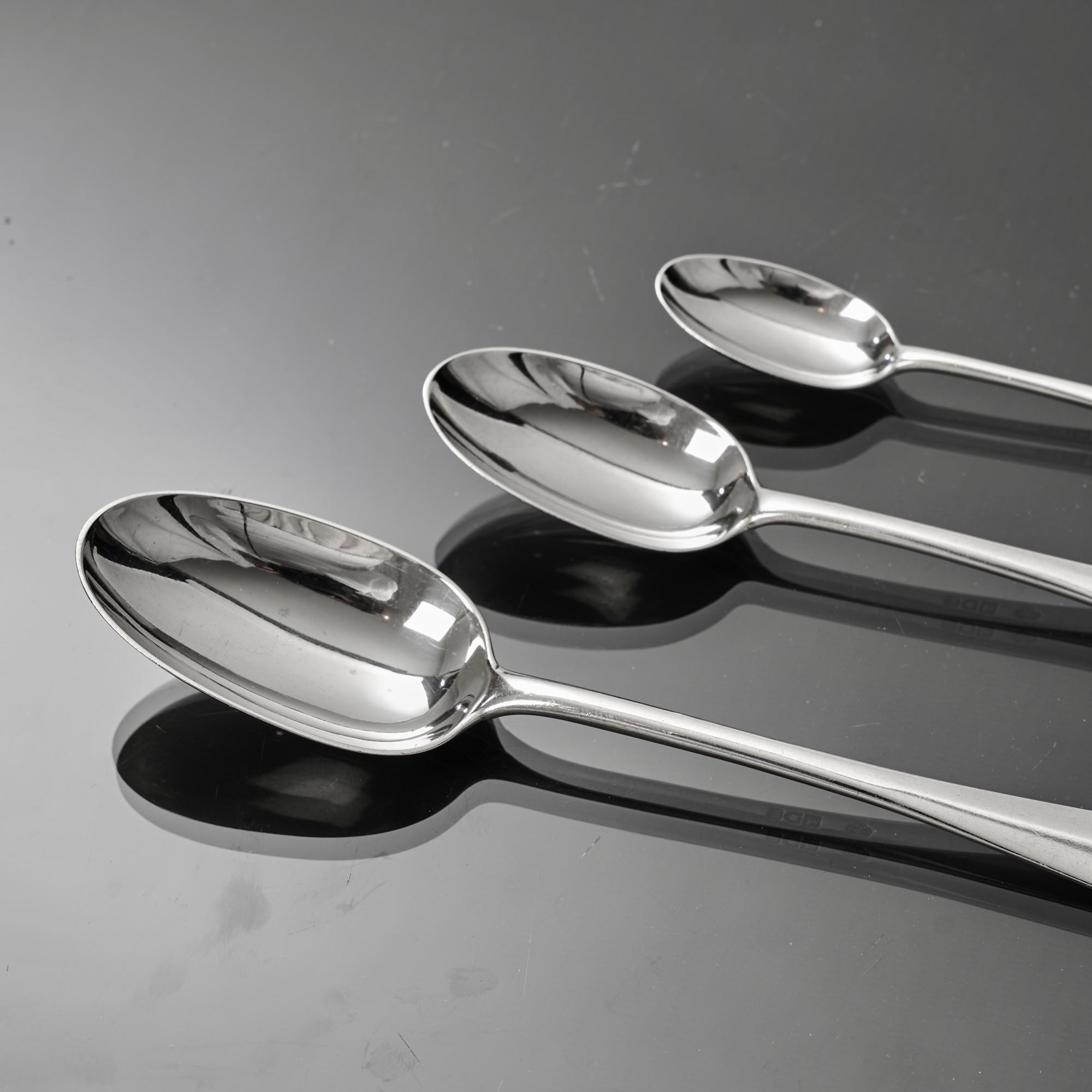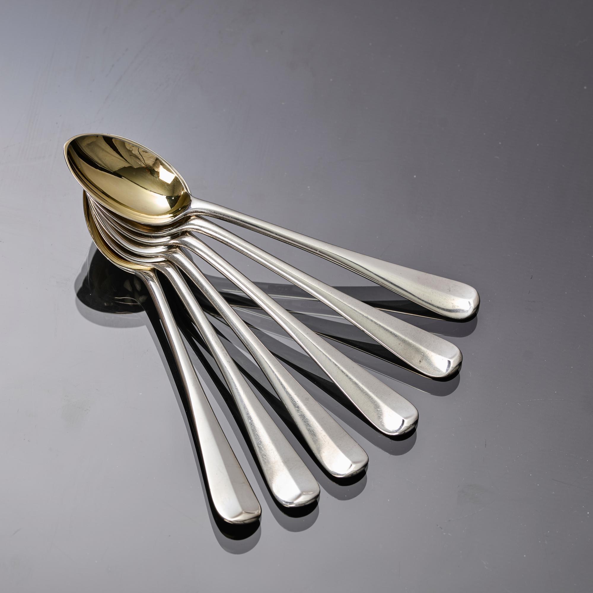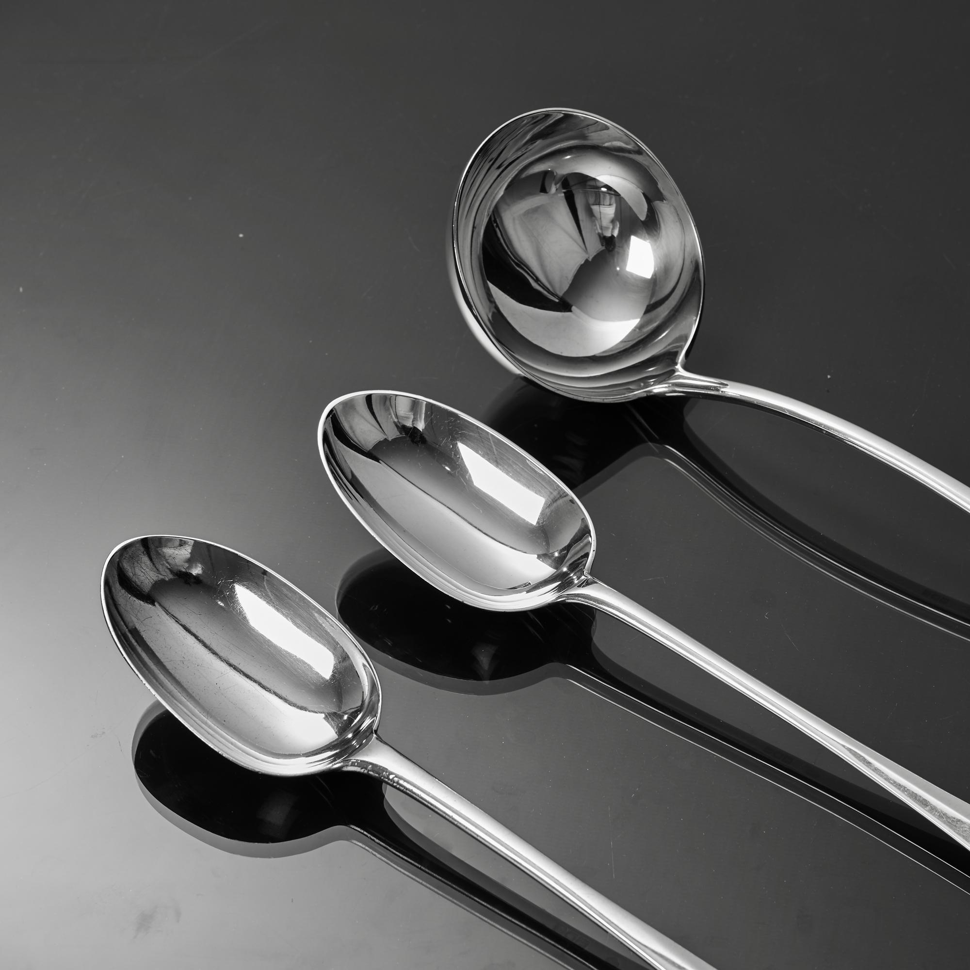 This set of hand-forged Rattail pattern silver cutlery was made by the Goldsmiths & Silversmiths Co of London in 1902-1907, and it is in excellent original condition. All pieces of flatware are of a heavy gauge of silver, so will provide at least another century of use, if looked after.