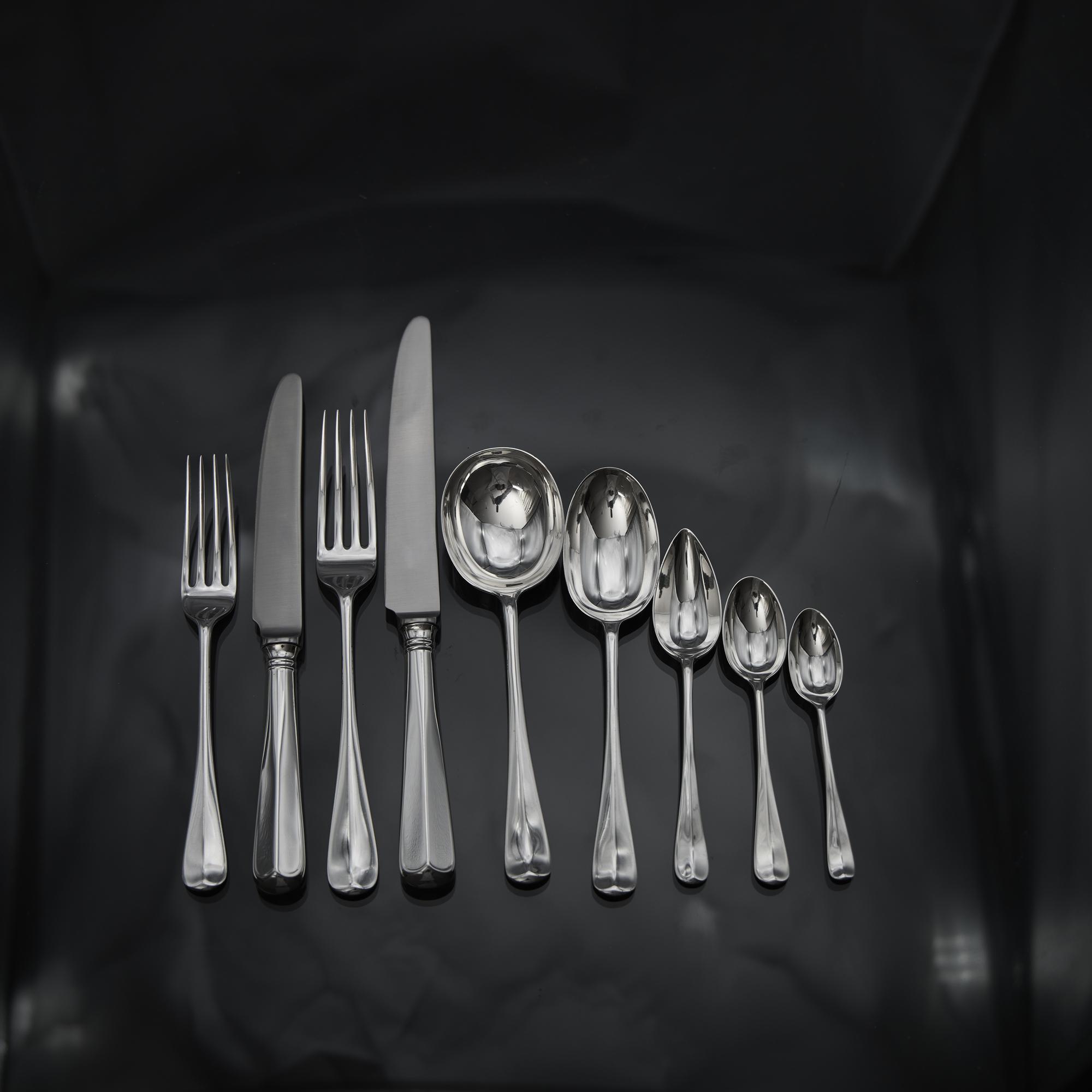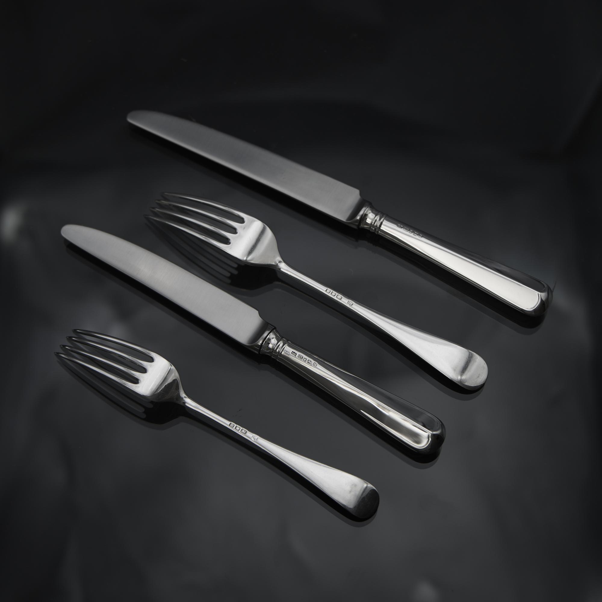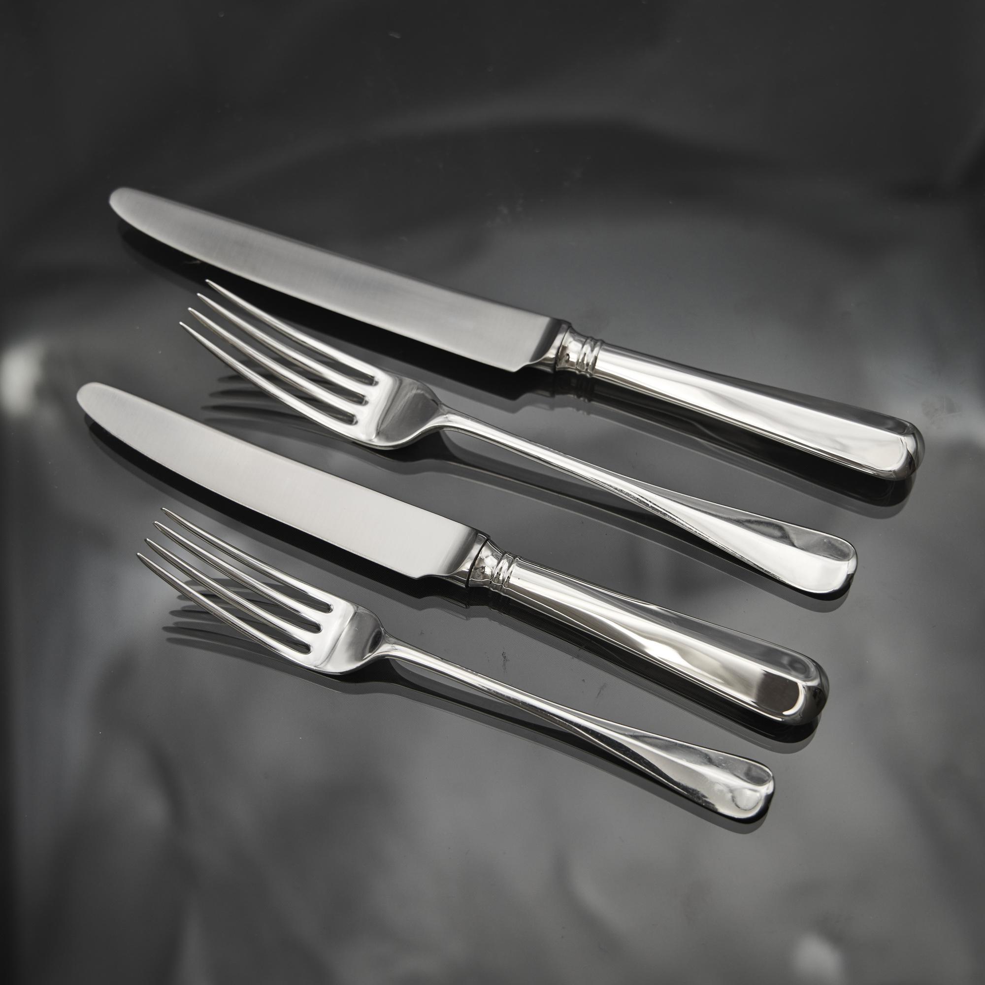 Since antique knives in any pattern rarely survive, this sterling silver cutlery set is completed with 12 pairs of modern matching table and dessert knives, with sterling silver handles fitted with stainless steel blades, making them safe to put in the dishwasher