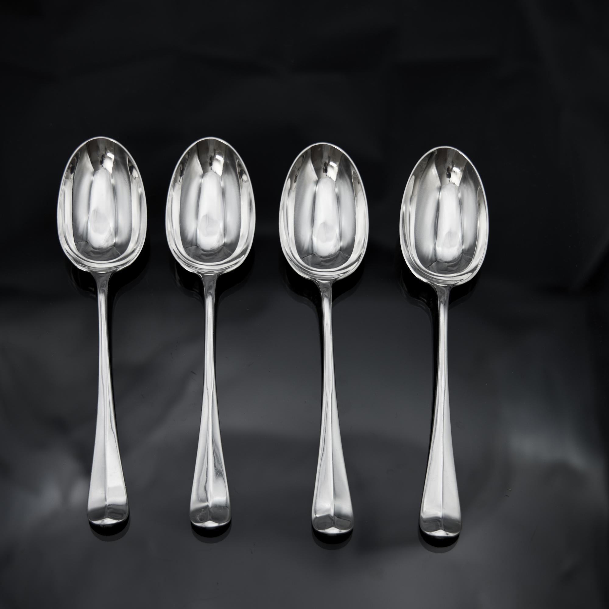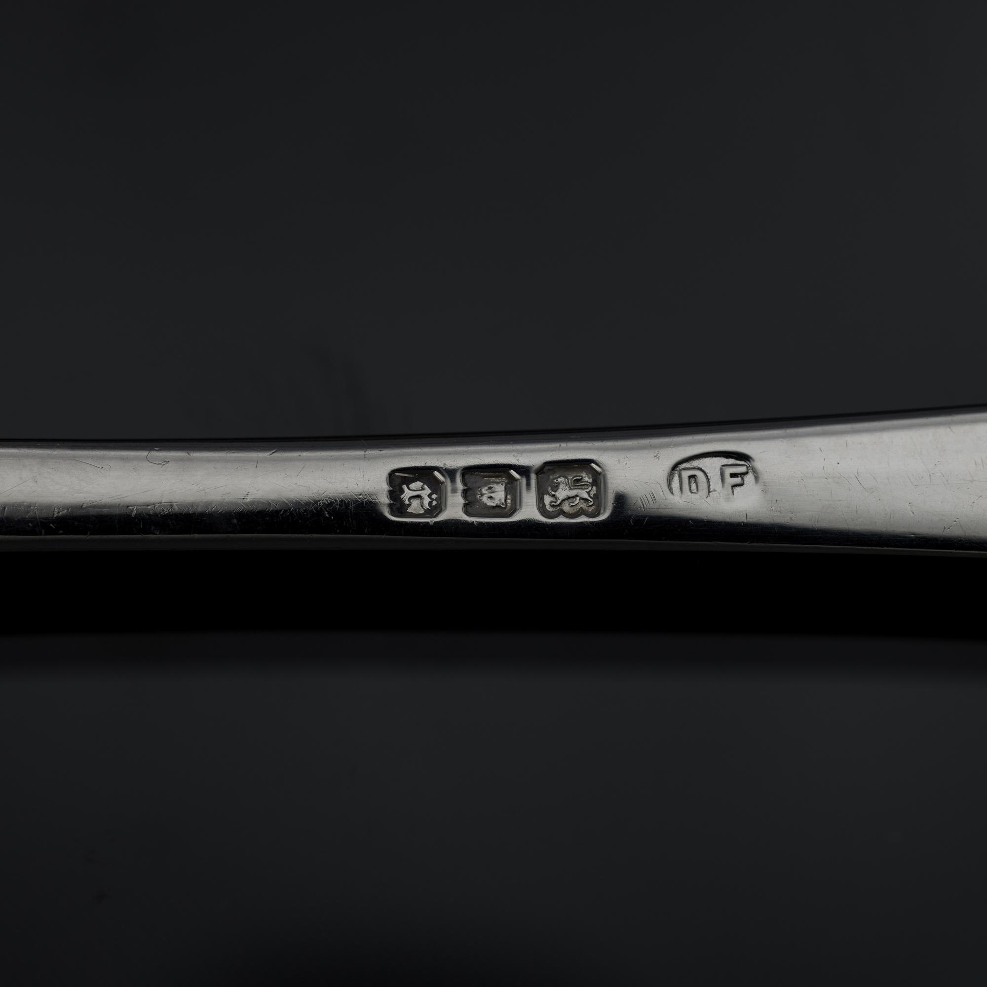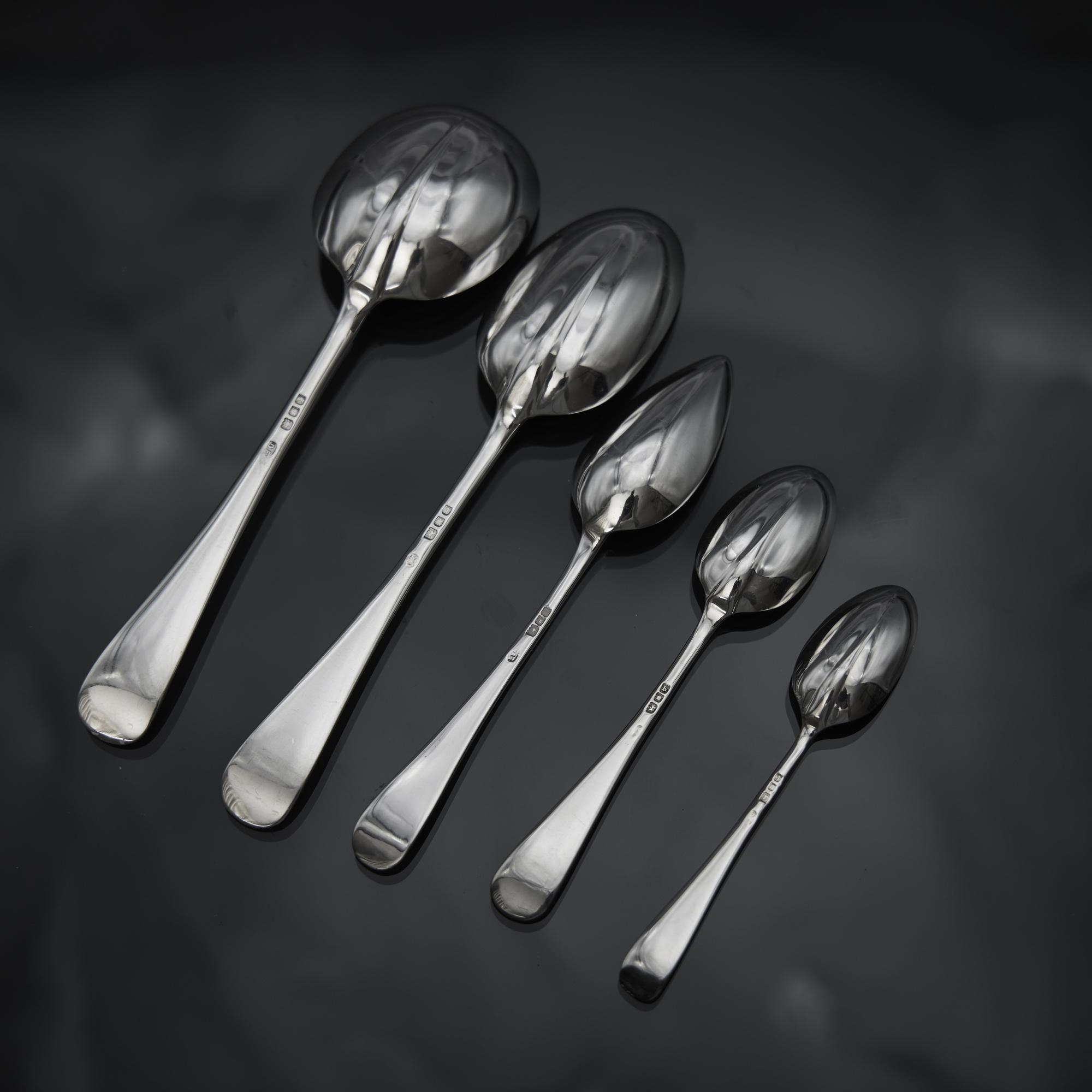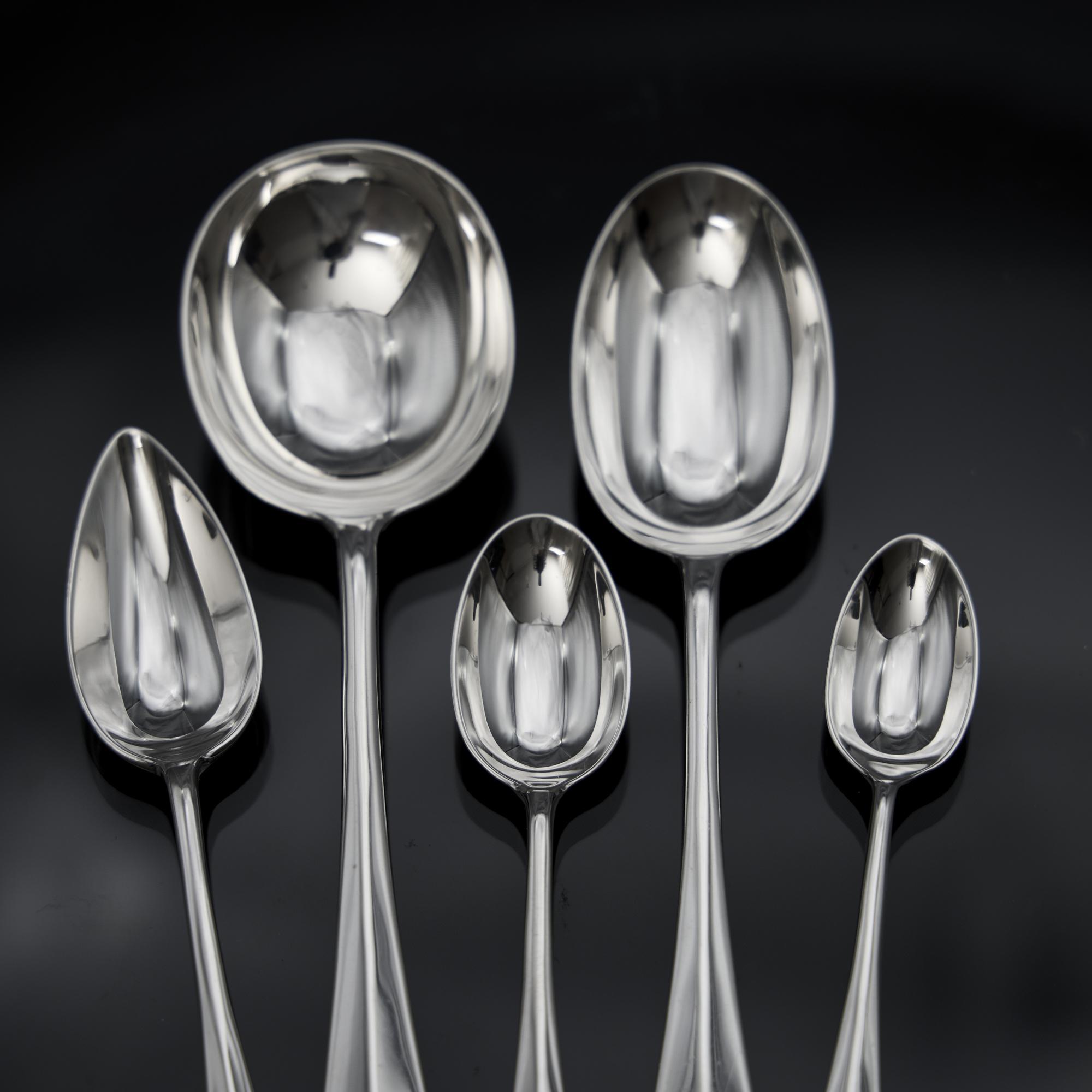 Since antique knives in any pattern rarely survive, this sterling silver cutlery set is completed with 12 pairs of modern matching table and dessert knives, with sterling silver handles fitted with stainless steel blades, making them safe to put in the dishwasher