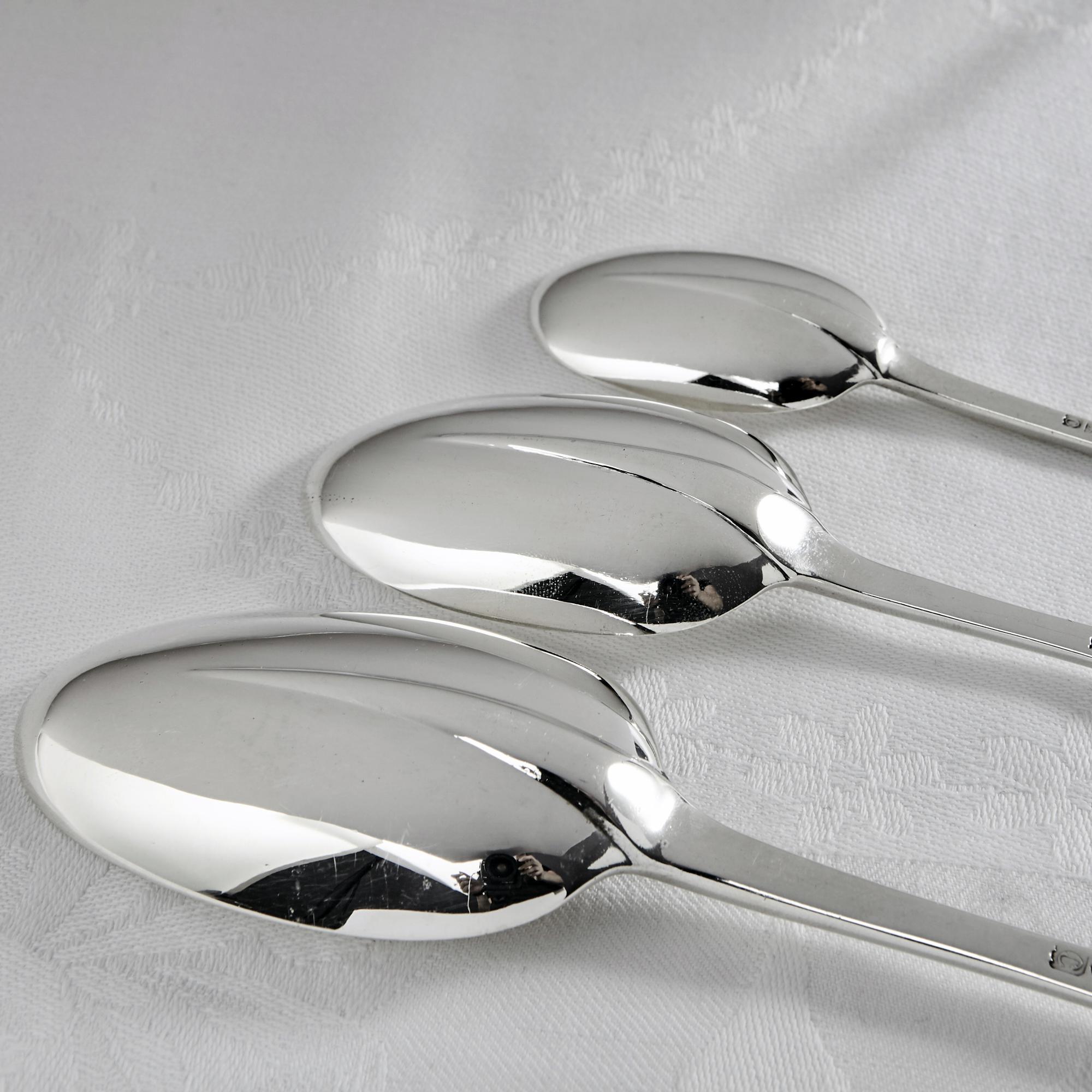 Hand-forged, one-date-and-maker set of sterling silver Rattail pattern cutlery made by George Lambert of London. It is a wonderfully heavy example of the classic four-prong Rattail pattern, in superb condition, and all original apart from one teaspoon which has been replaced.
