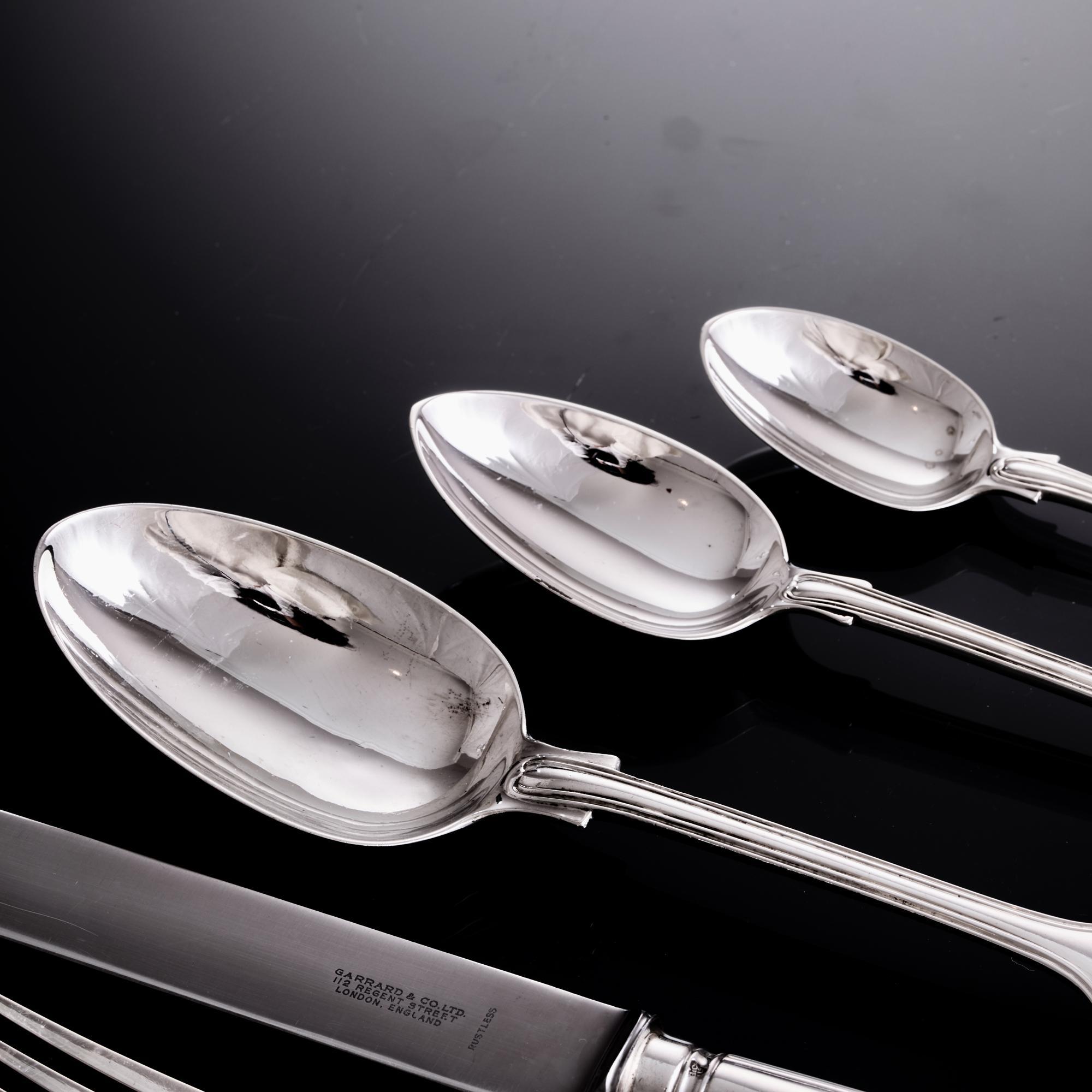 Original antique knives rarely survive. This 12 place setting set includes the finest hard-soldered silver knives in the complementary Old English Thread pattern, made by Garrard & Co in London 1961. With stainless steel blades, the knives are dishwasher-safe.
