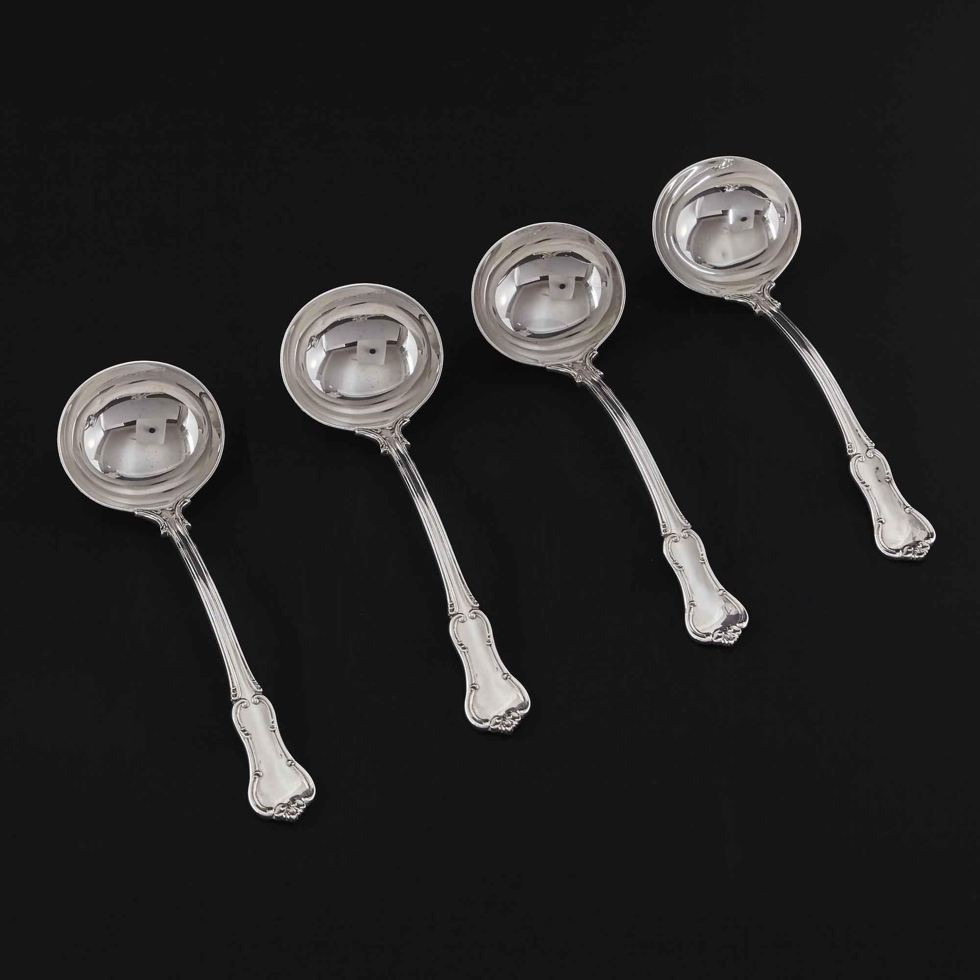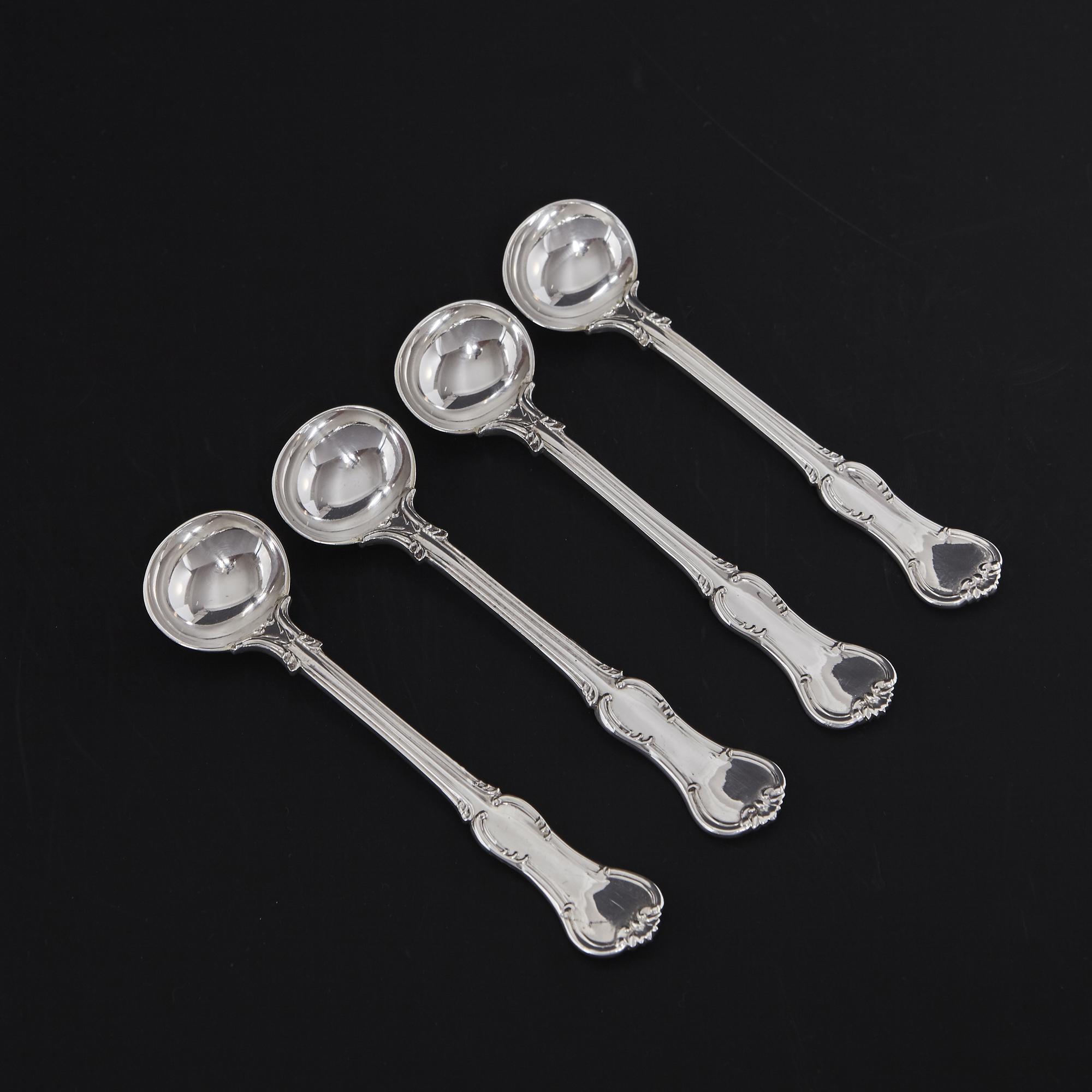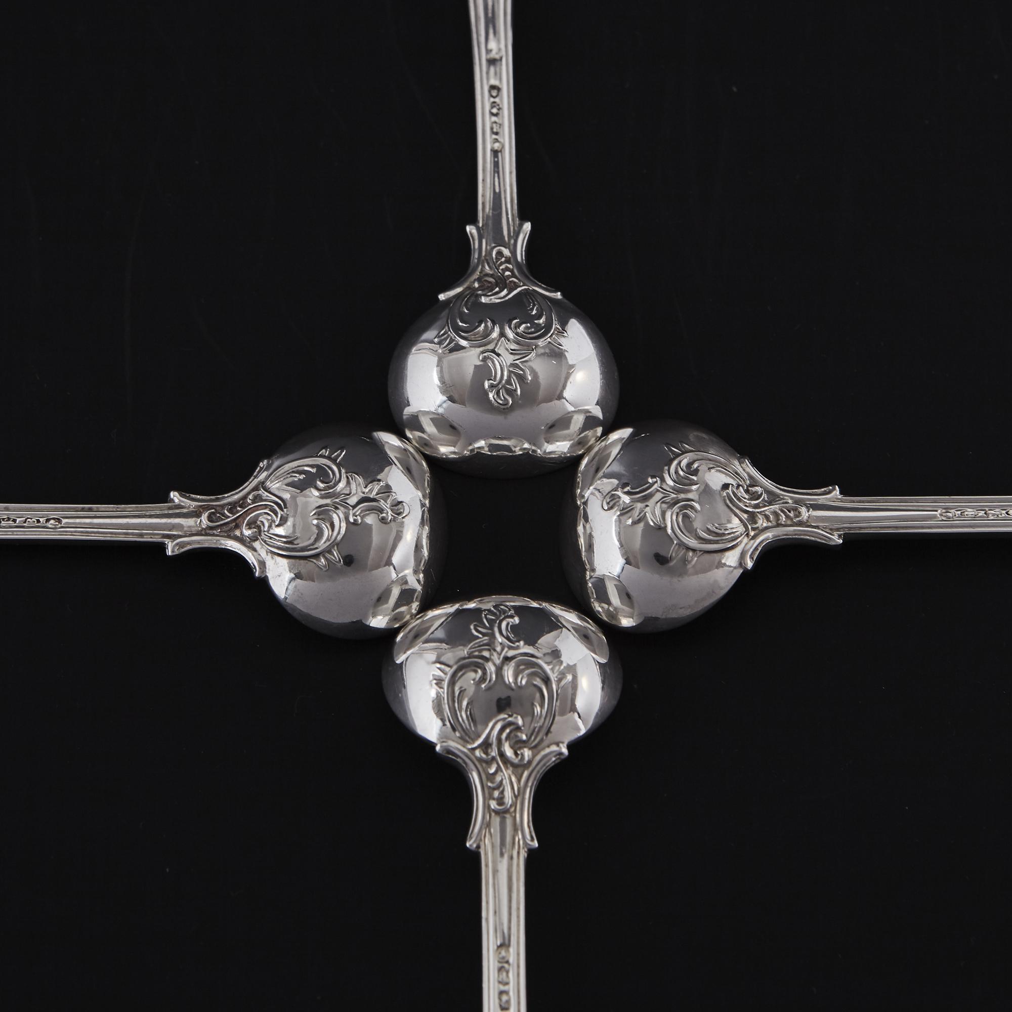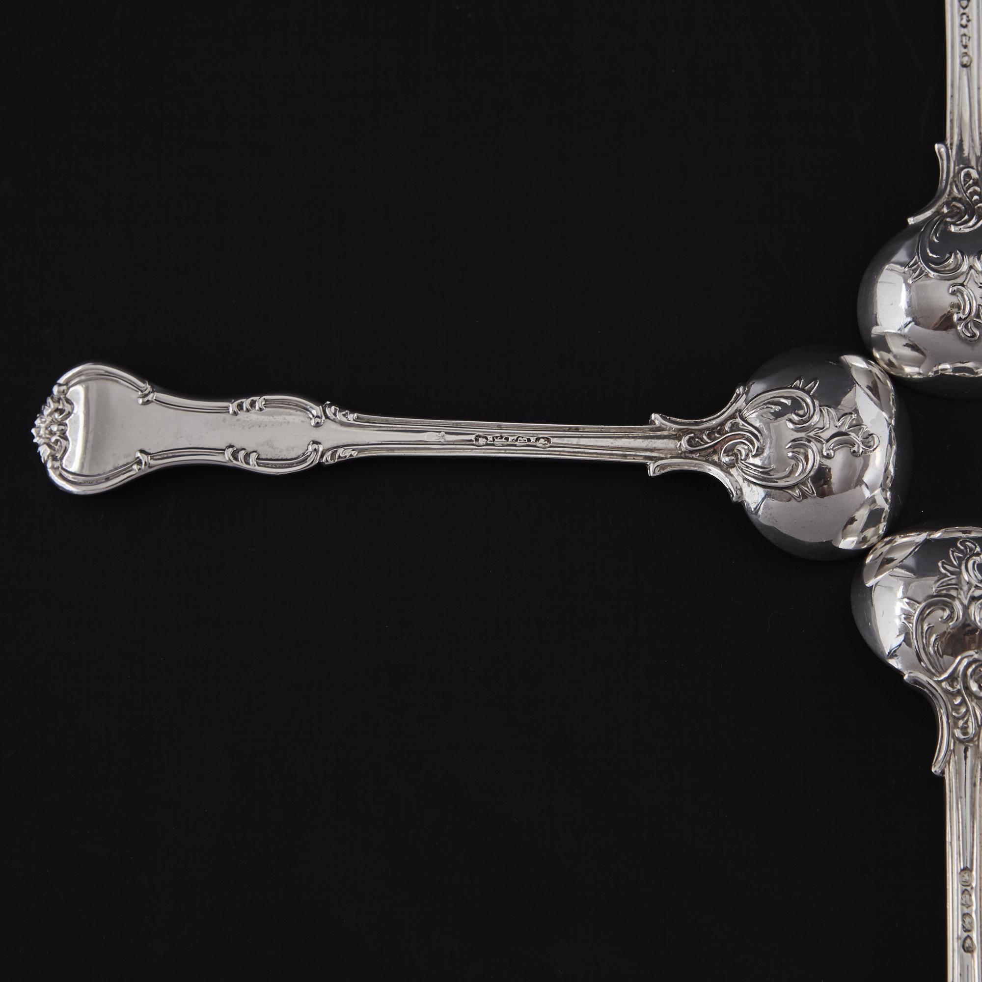 Since antique knives rarely survive, this fine silver cutlery set is completed with 24 modern matching silver table knives and 36 dessert knives in the Prince's pattern, with stainless steel blades, making them suitable for putting in the dishwasher.