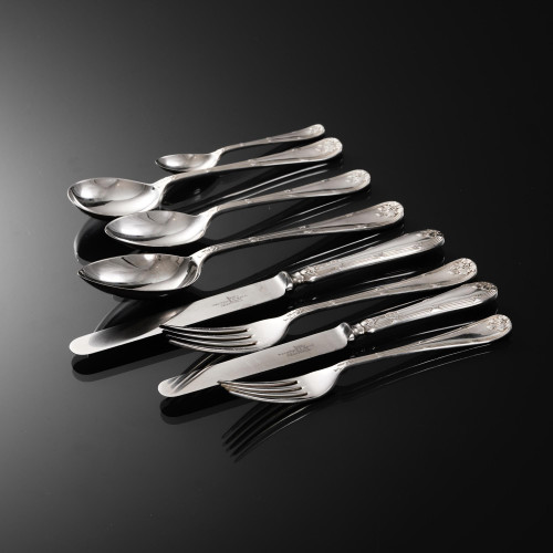 This thread decoration of this modern set of silver knives is a lovely variation of the Old English pattern, first made in the 1760s but becoming most popular in the mid 1780s. Its classic simplicity makes Old English Thread a consistently popular choice that complements traditional or contemporary table settings.