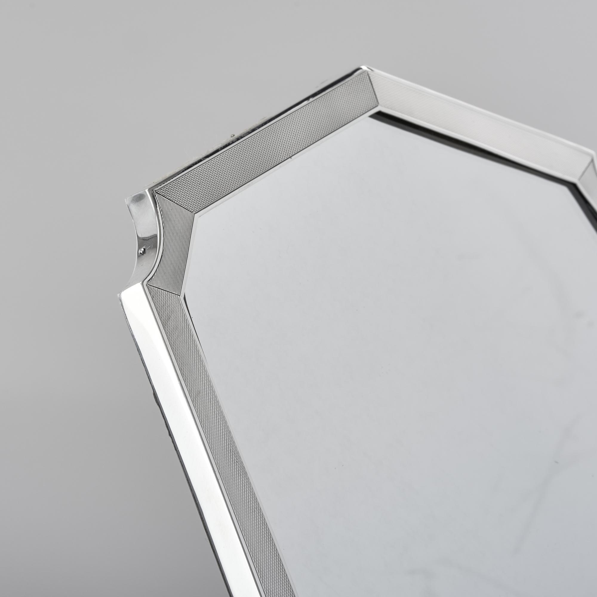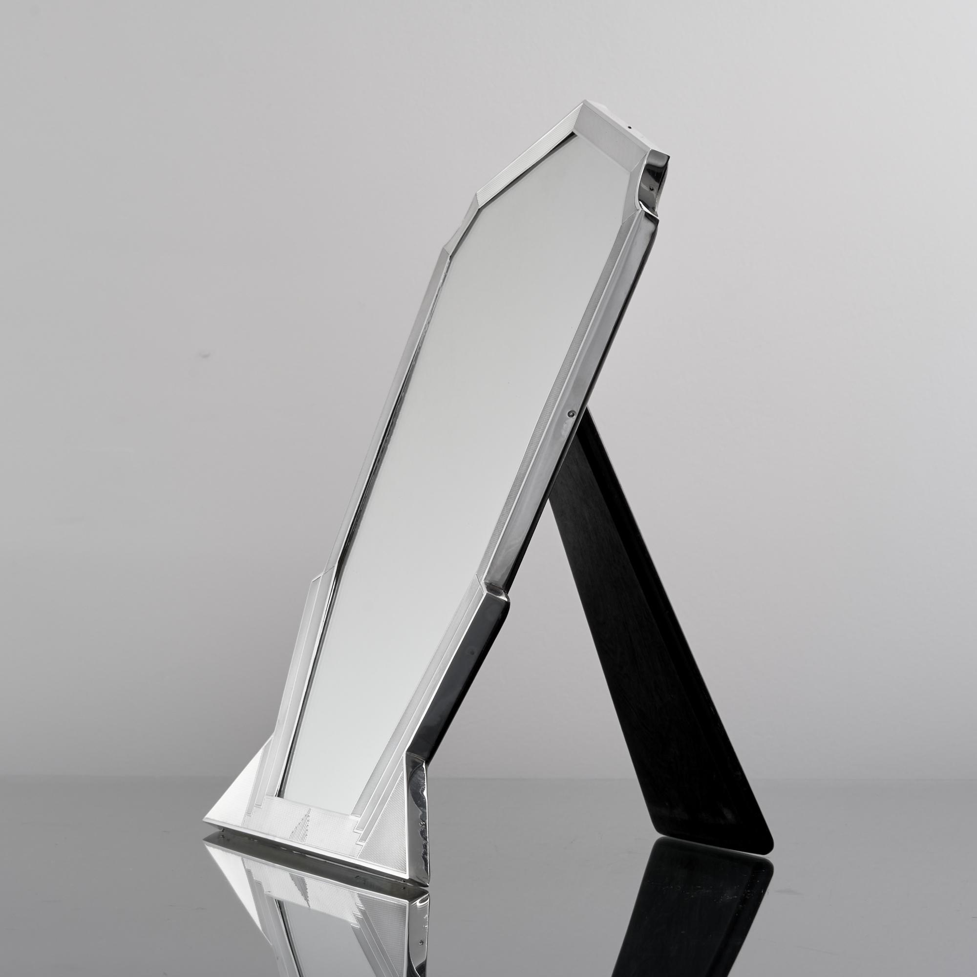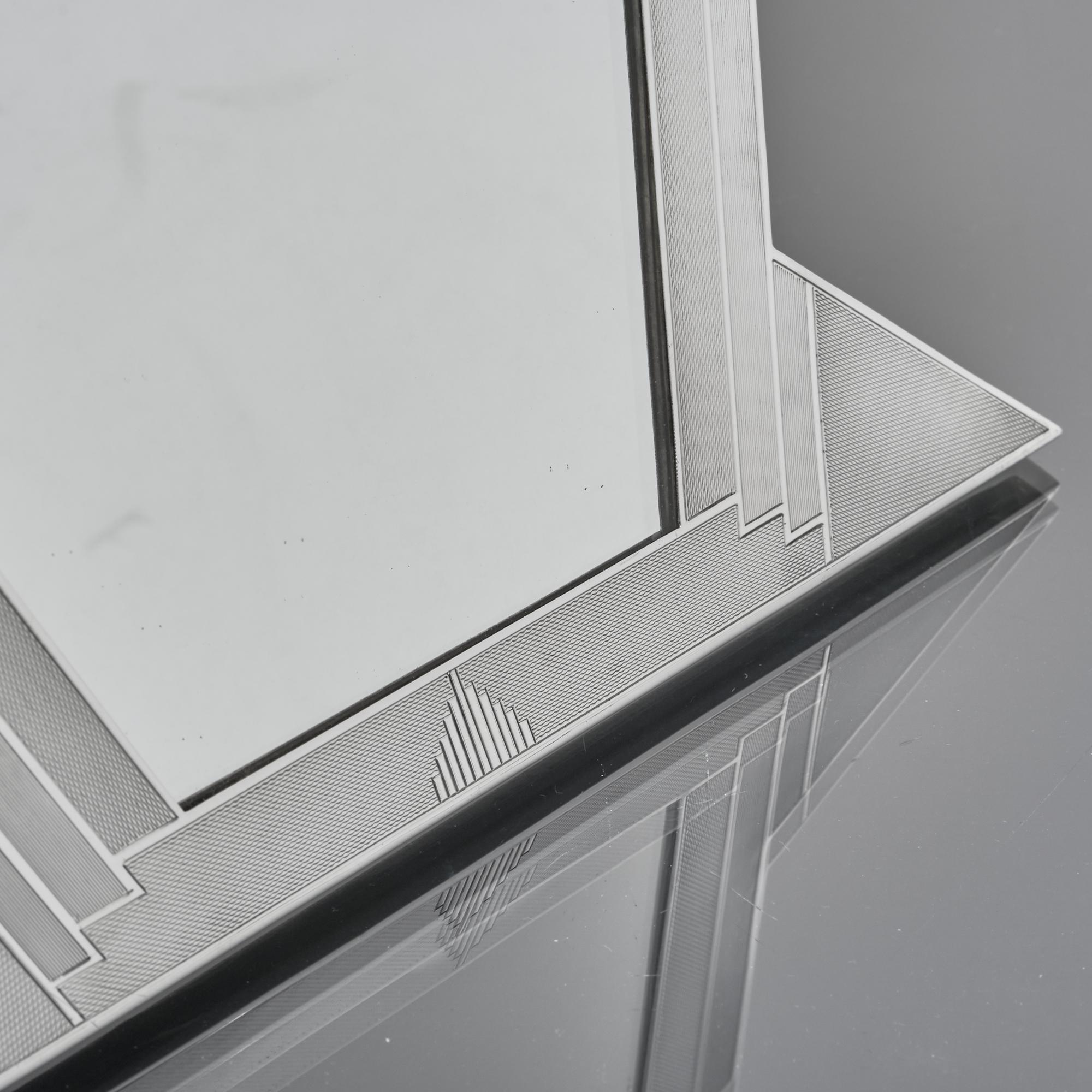 Highly stylised handmade silver mirror with its original wood back and easel in the Art Deco style. The design personifies the era with its geometric forms and engine-turned engraved patterns; the engine-turned engraving that is in exceptional and perfect order.