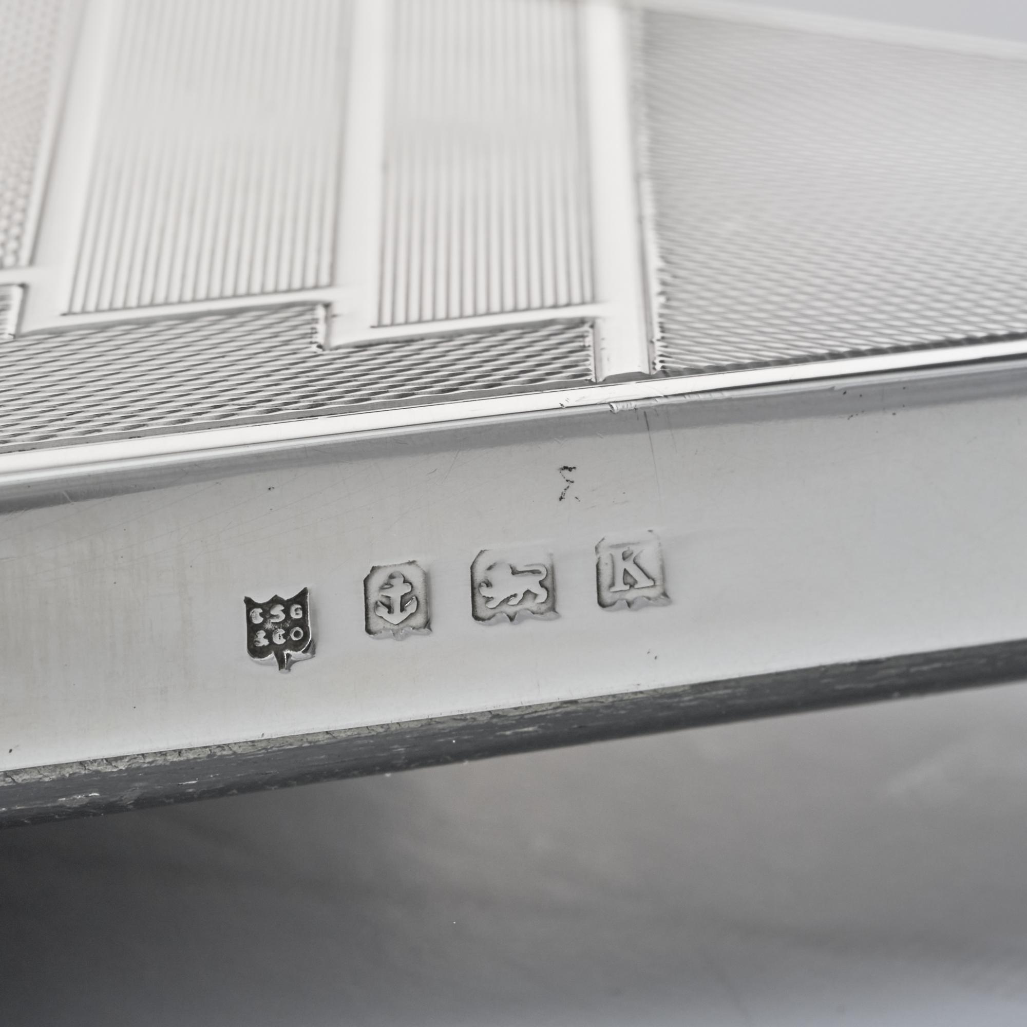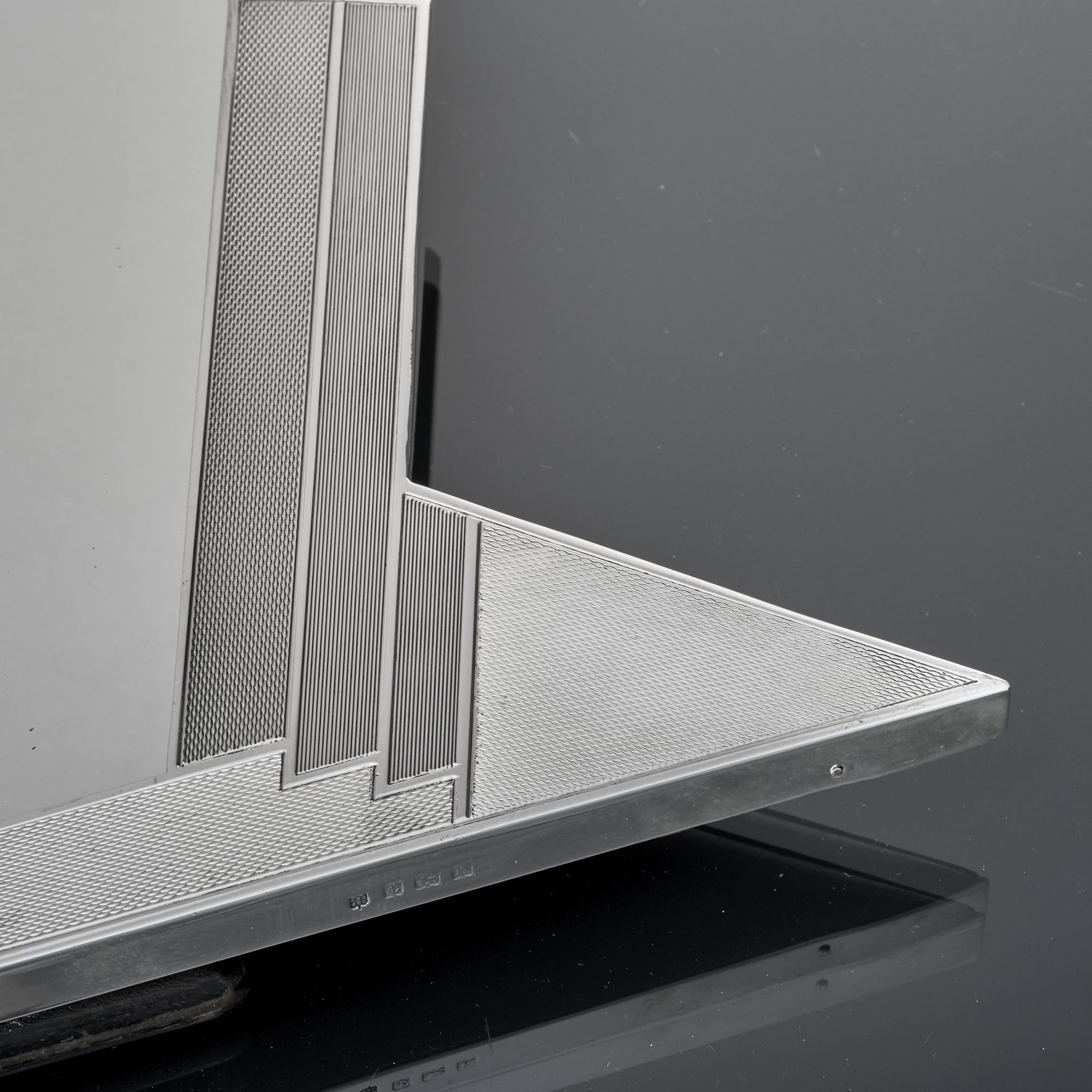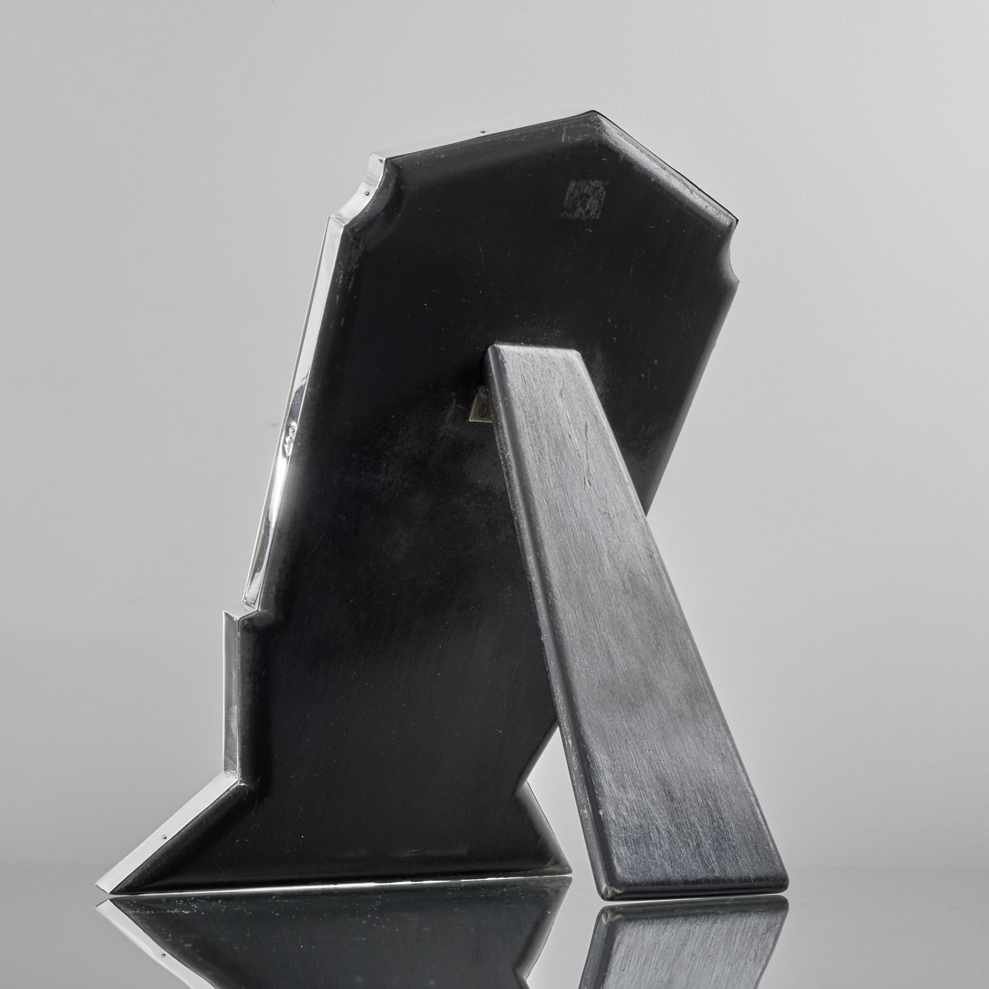 Highly stylised handmade silver mirror with its original wood back and easel in the Art Deco style. The design personifies the era with its geometric forms and engine-turned engraved patterns; the engine-turned engraving that is in exceptional and perfect order.