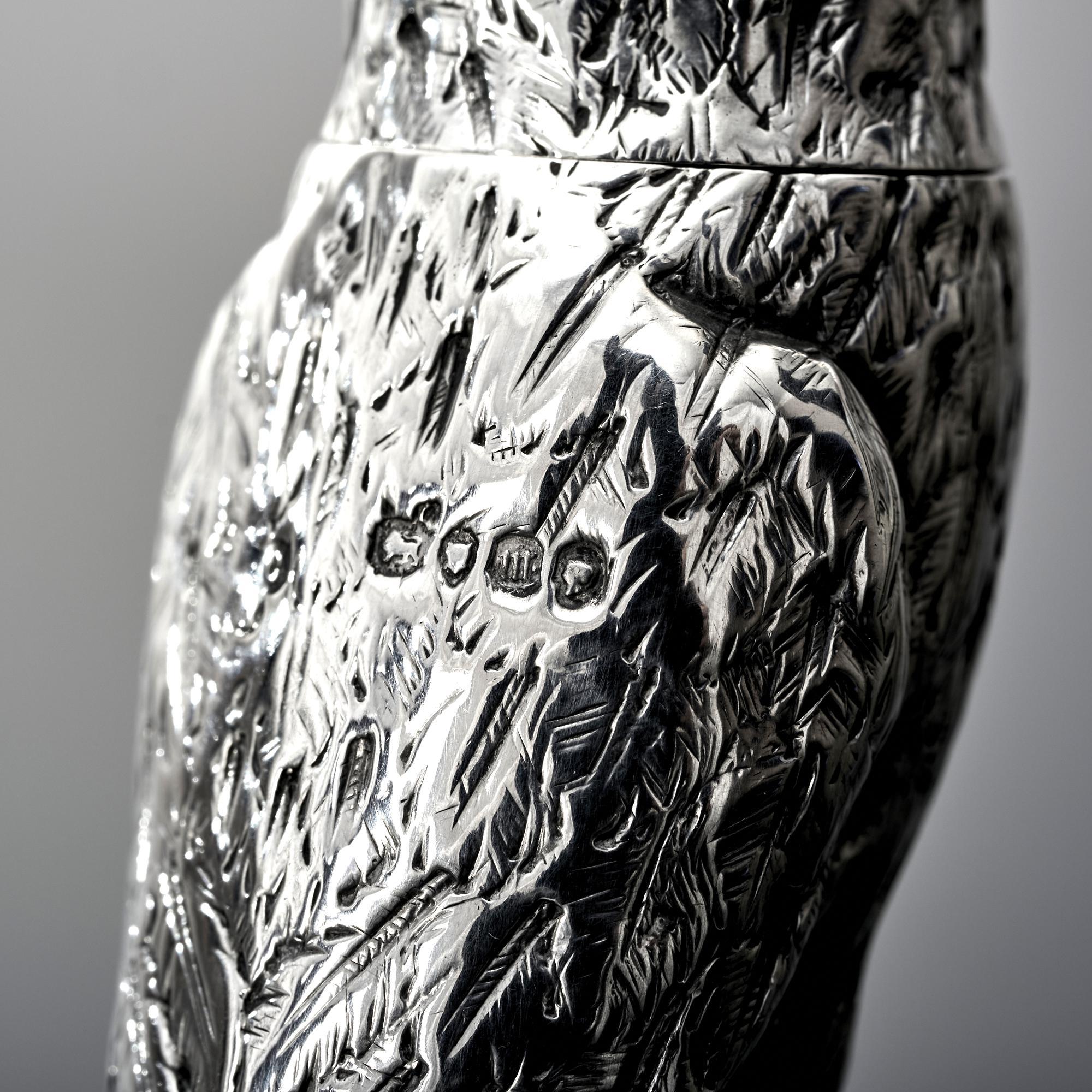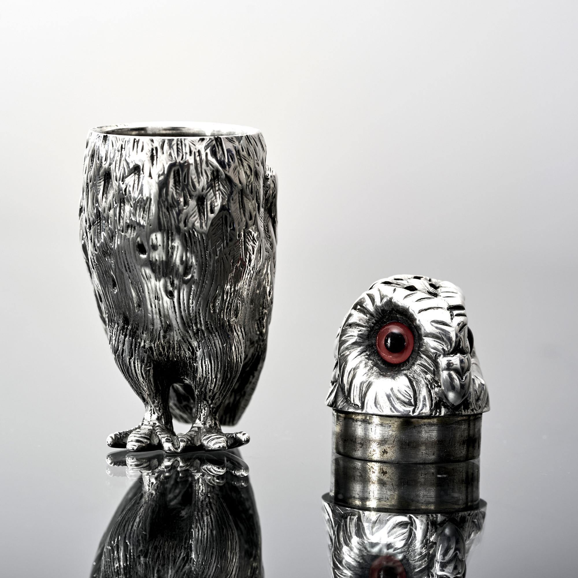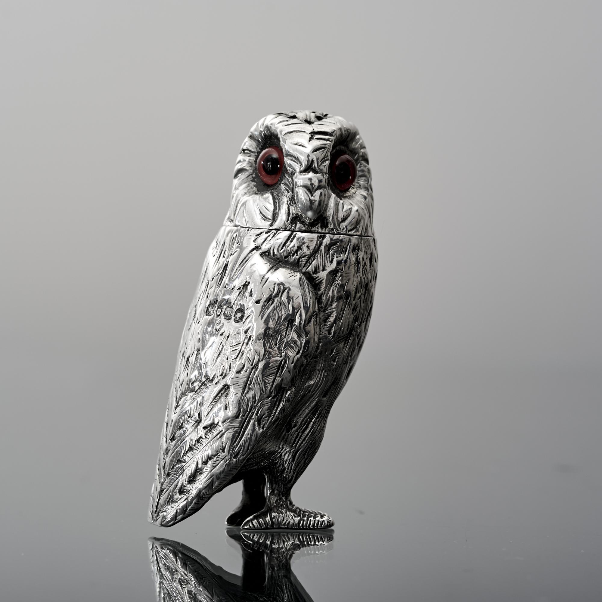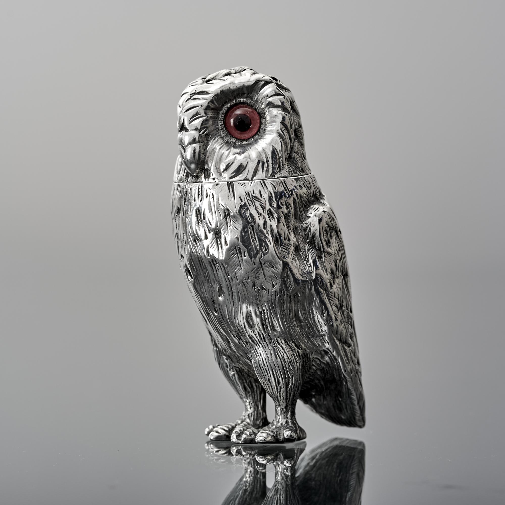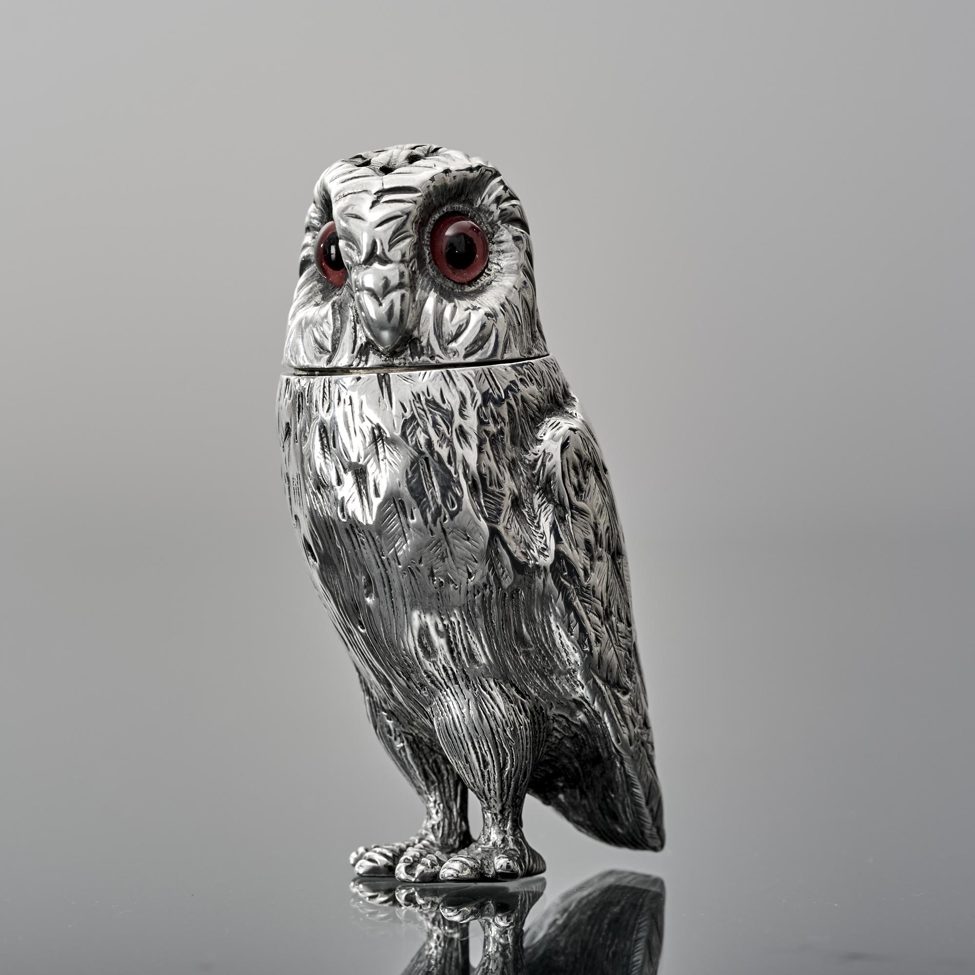 Antique, Victorian-era sterling silver pepper caster in the form of an owl. The piece has glass eyes inset and a hand-pierced head.