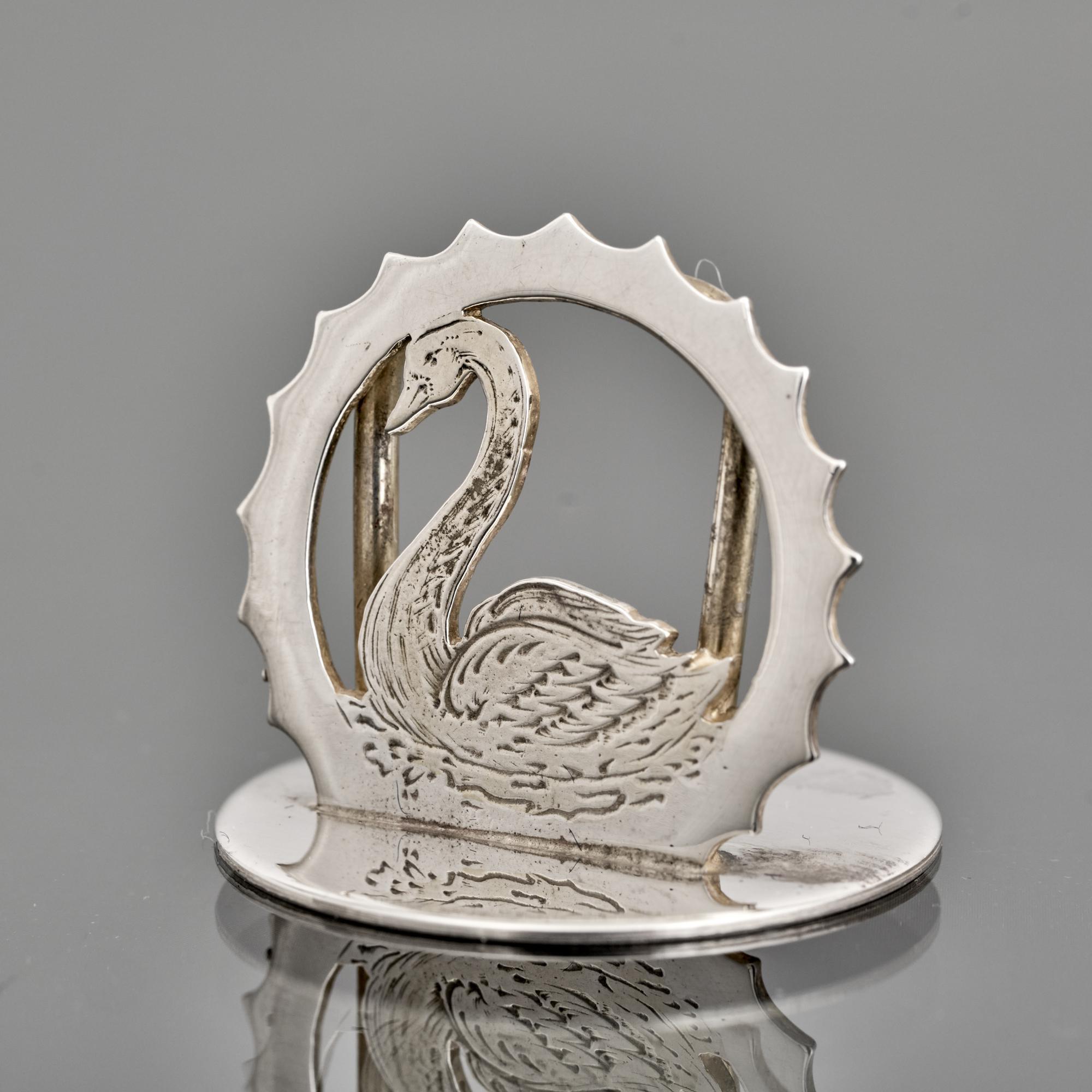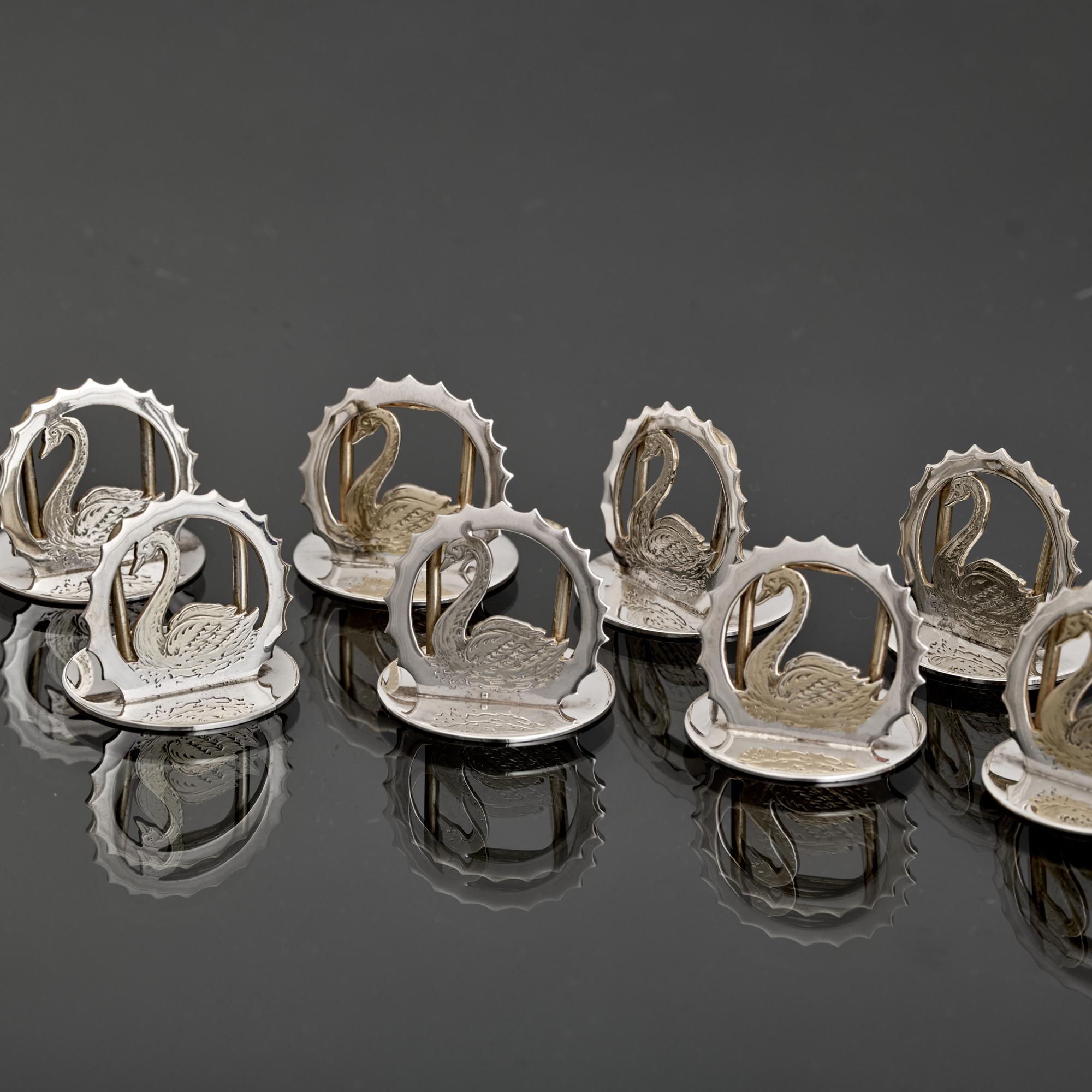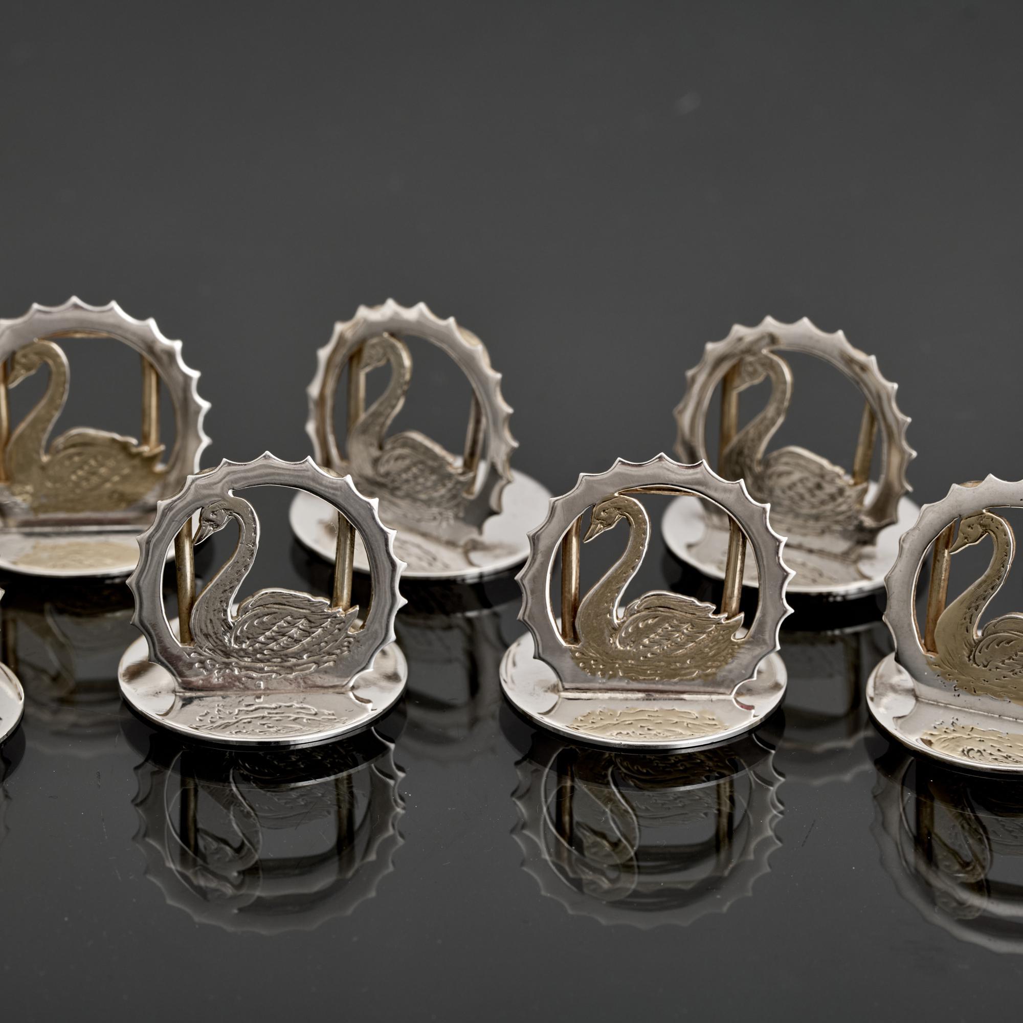 Matched set of twelve sterling silver place card or menu holders made by Asprey & Co in 1988 and 1990. They are classically styled as scallop-edged discs, each featuring a pierced and openwork figure of a swan. The swans are nicely engraved to show their feathering, water ripples and and are individually gilded to highlight the detail.