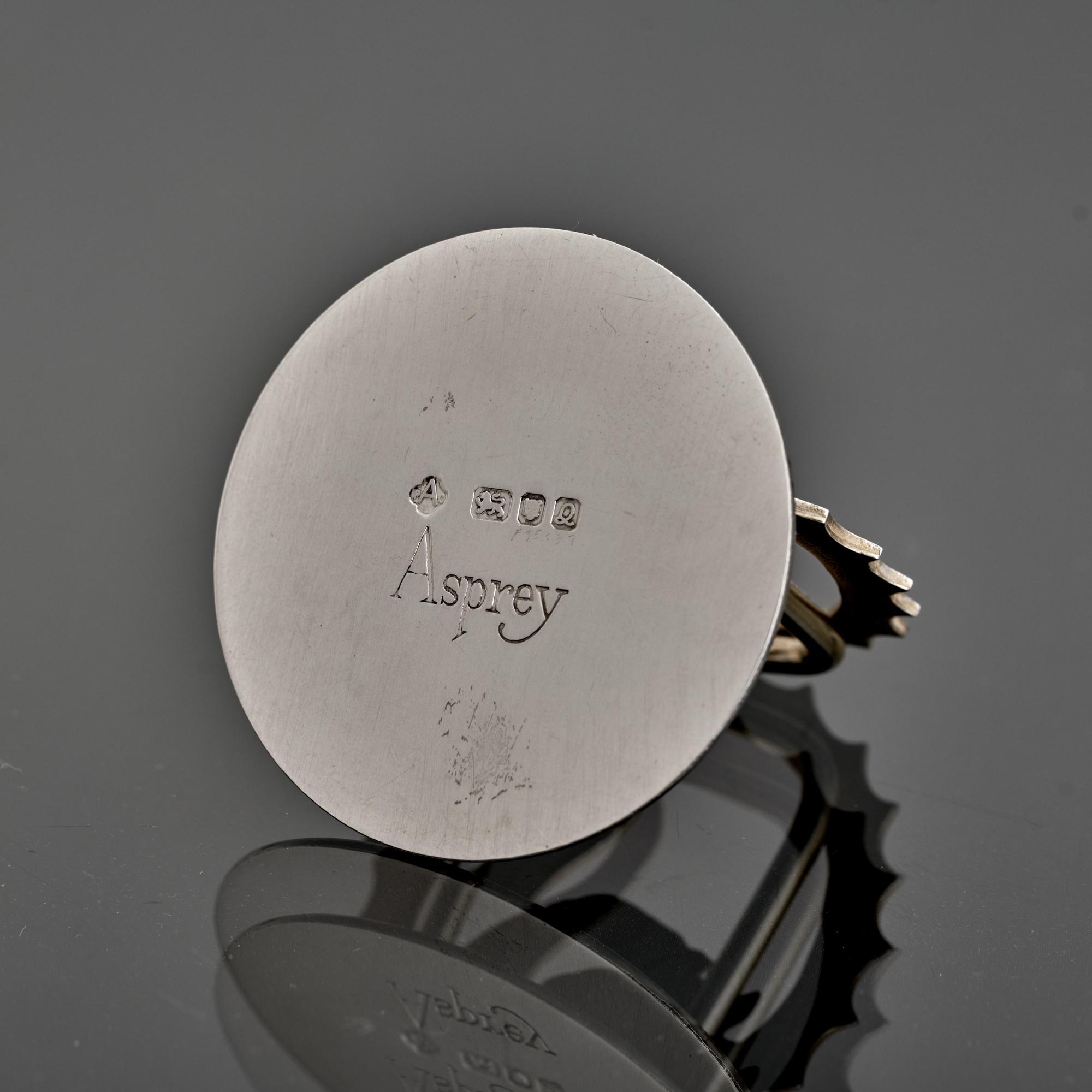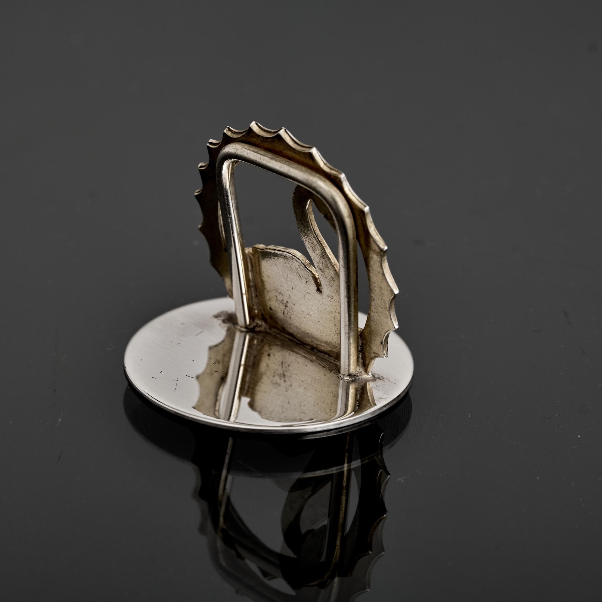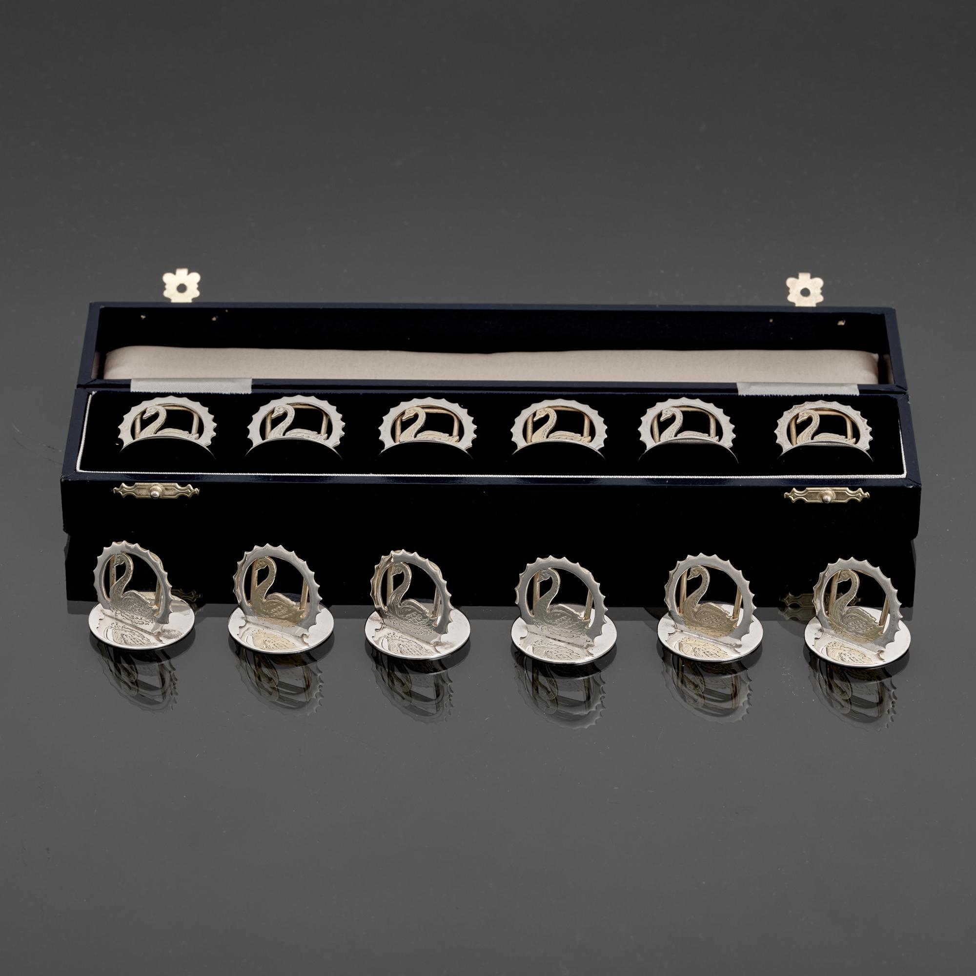 Matched set of twelve sterling silver place card or menu holders made by Asprey & Co in 1988 and 1990. They are classically styled as scallop-edged discs, each featuring a pierced and openwork figure of a swan. The swans are nicely engraved to show their feathering, water ripples and and are individually gilded to highlight the detail.