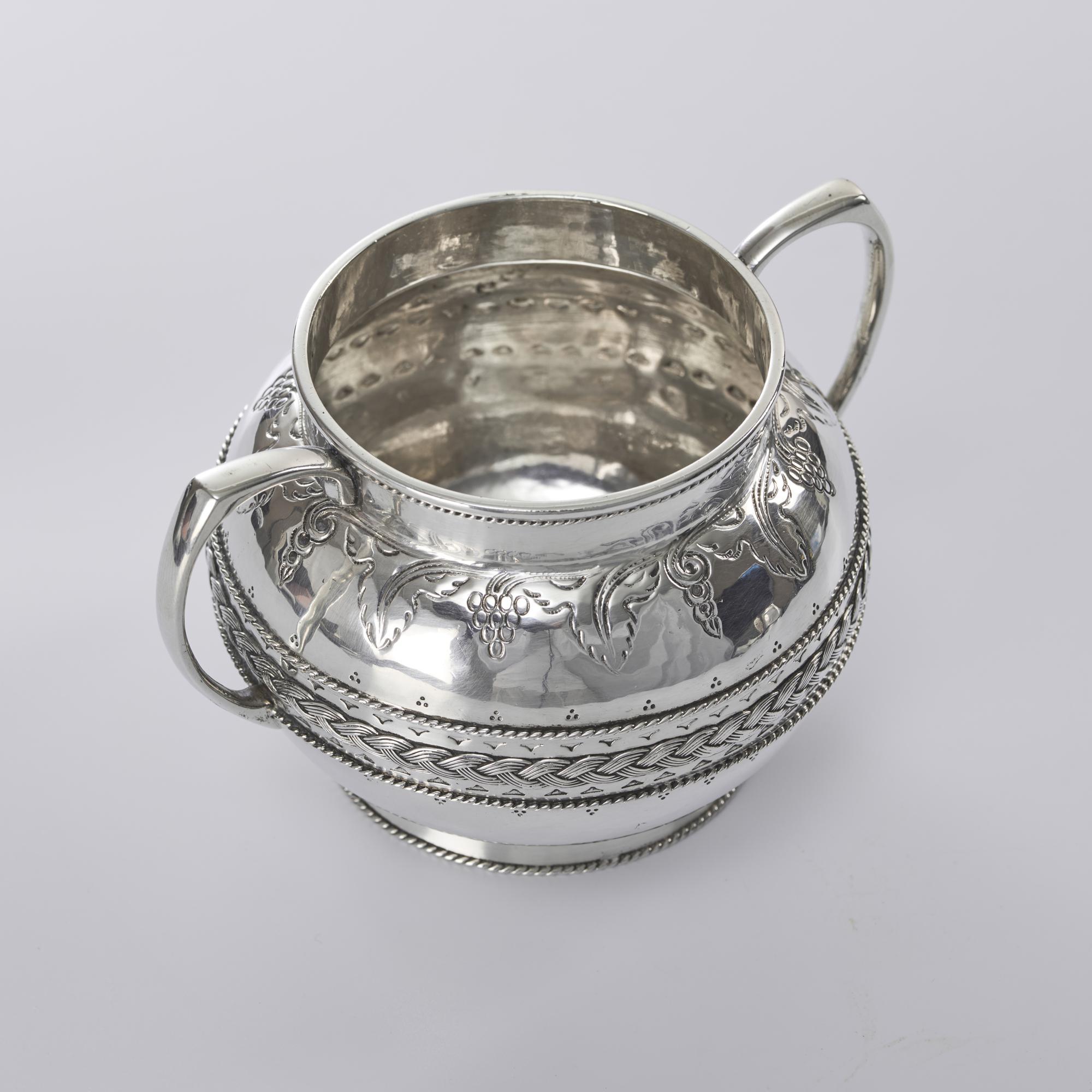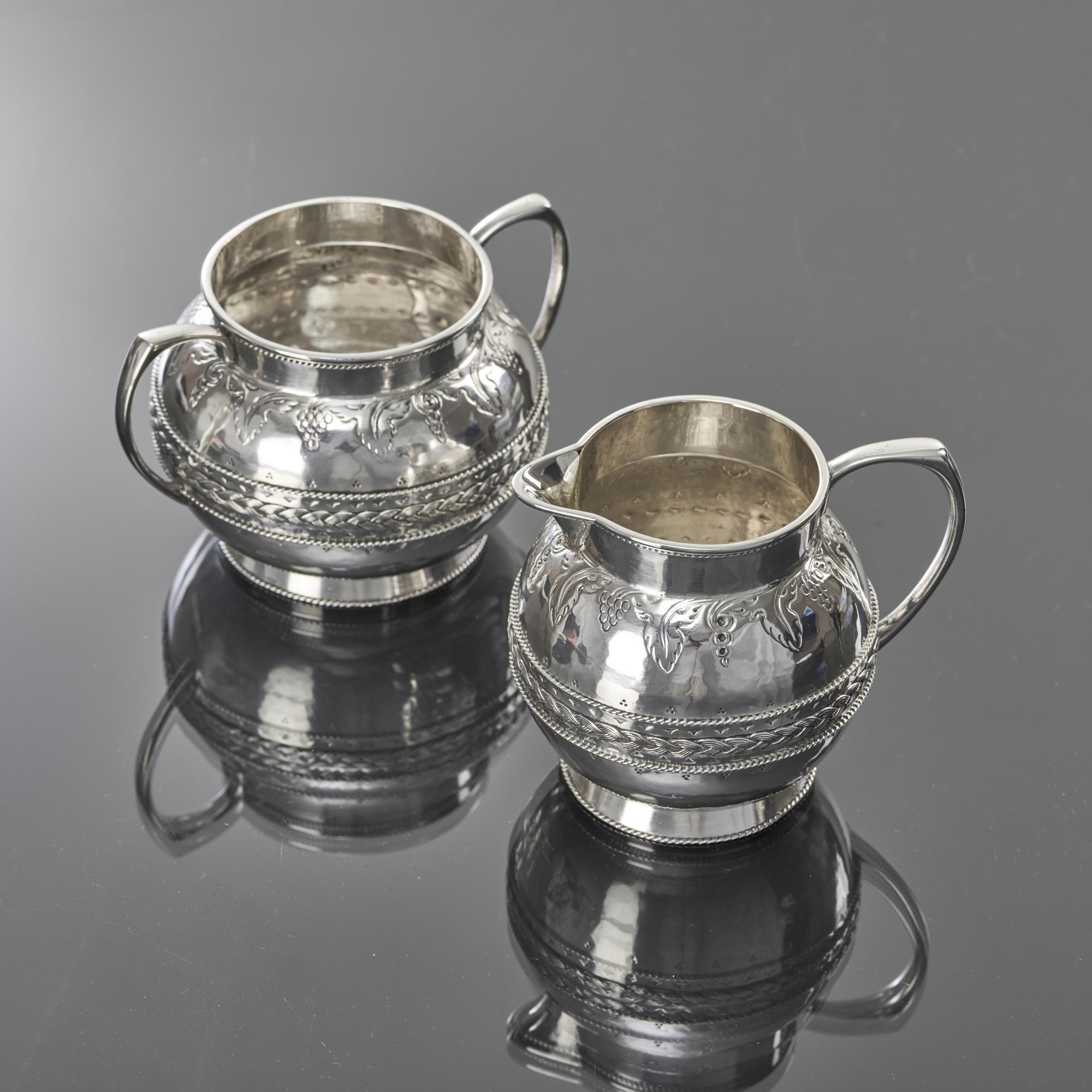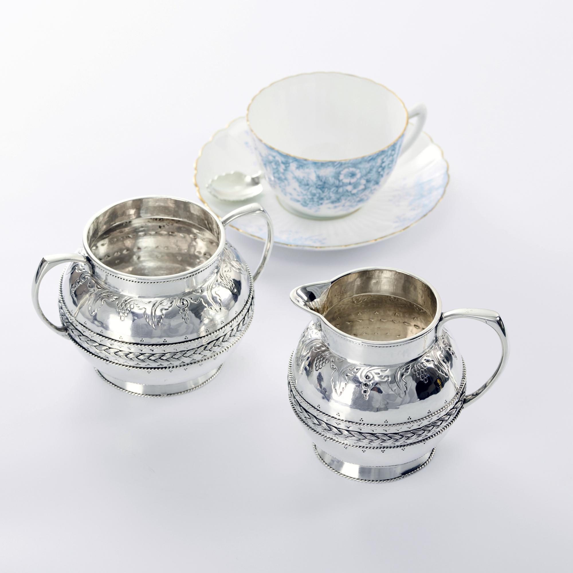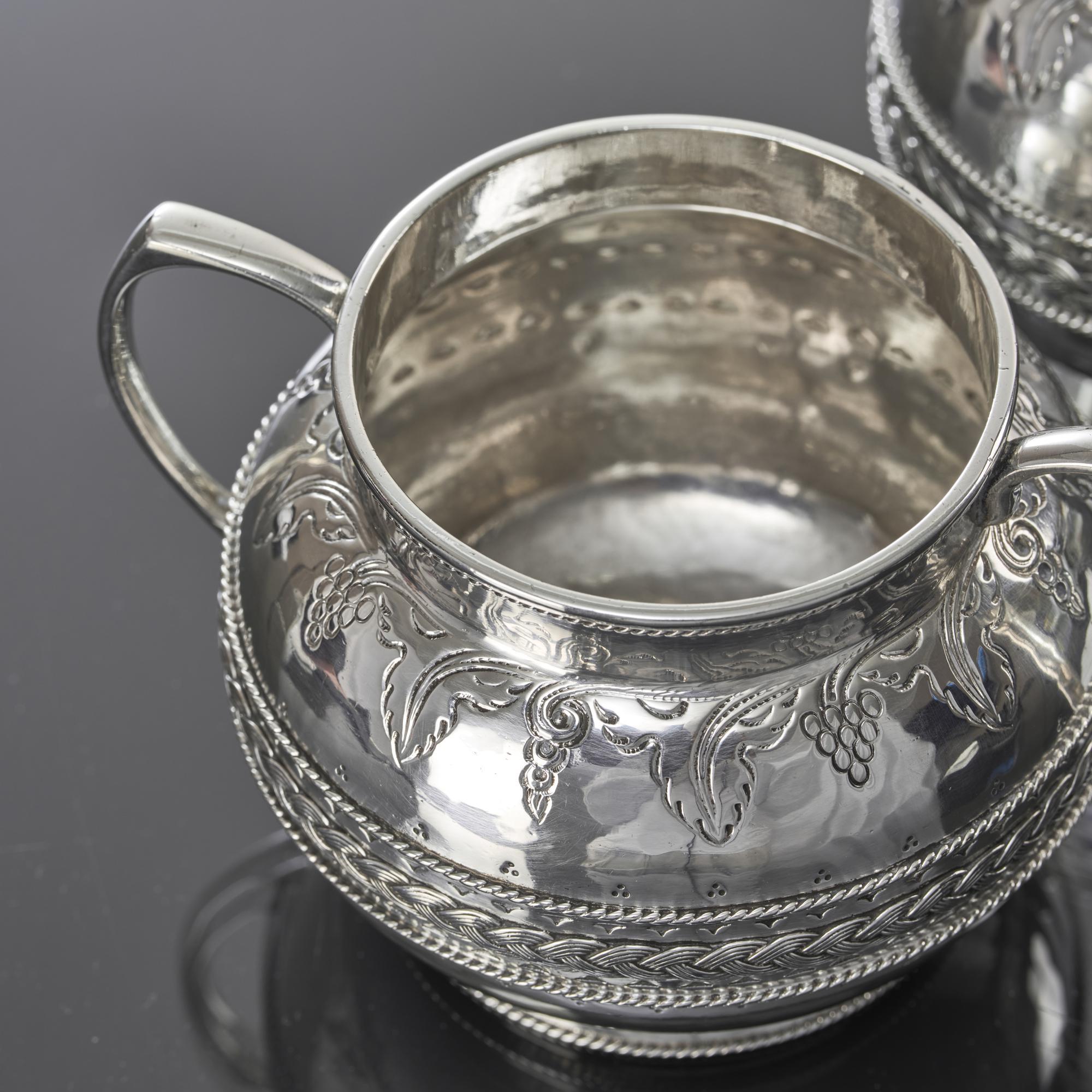 Hand-raised and hand-chased sugar bowl and milk jug. Each reflects their Arts & Crafts heritage with finely detailed cast and applied girdles of woven wirework patterns set against a lattice-effect background, and enclosed with two bands of applied twisted wire.