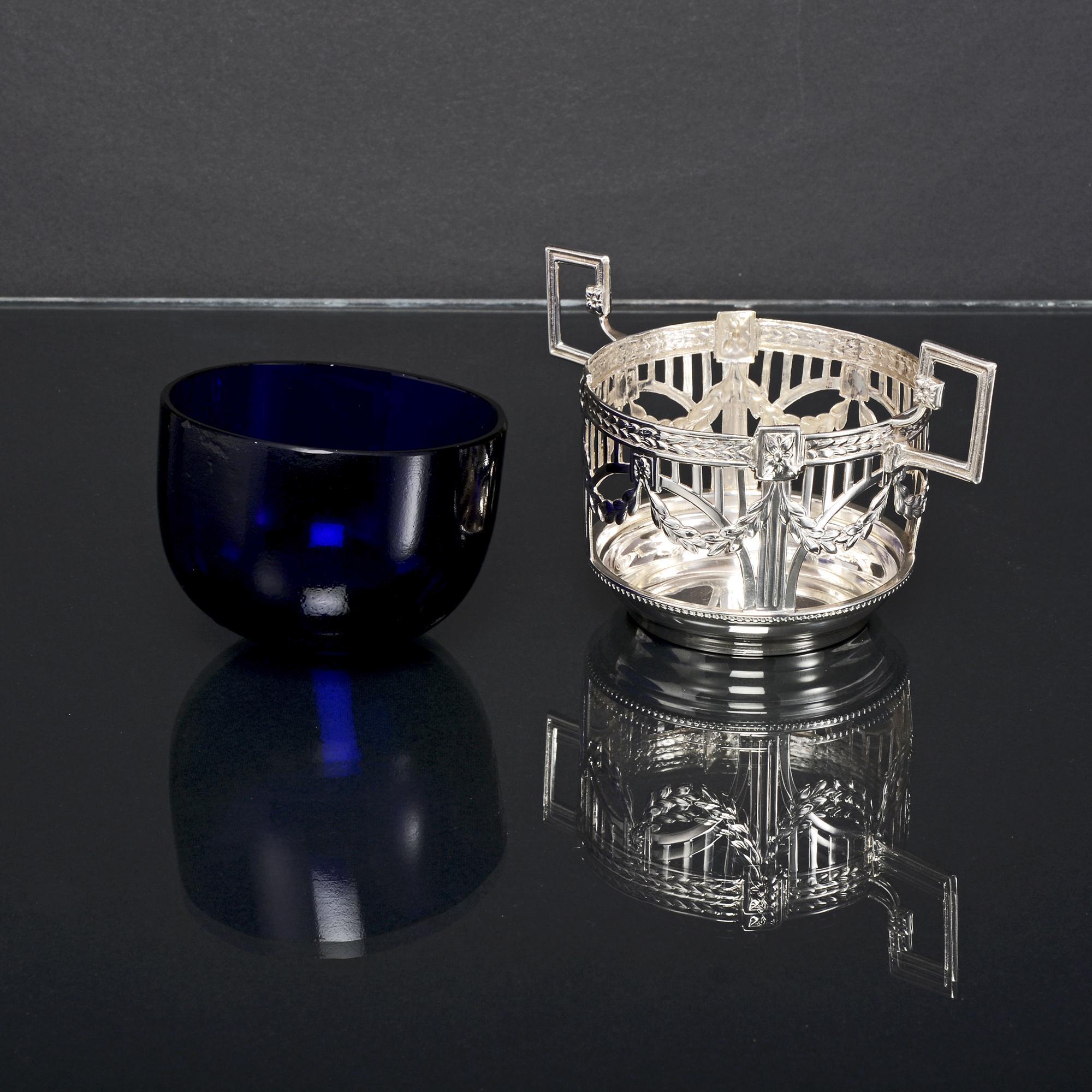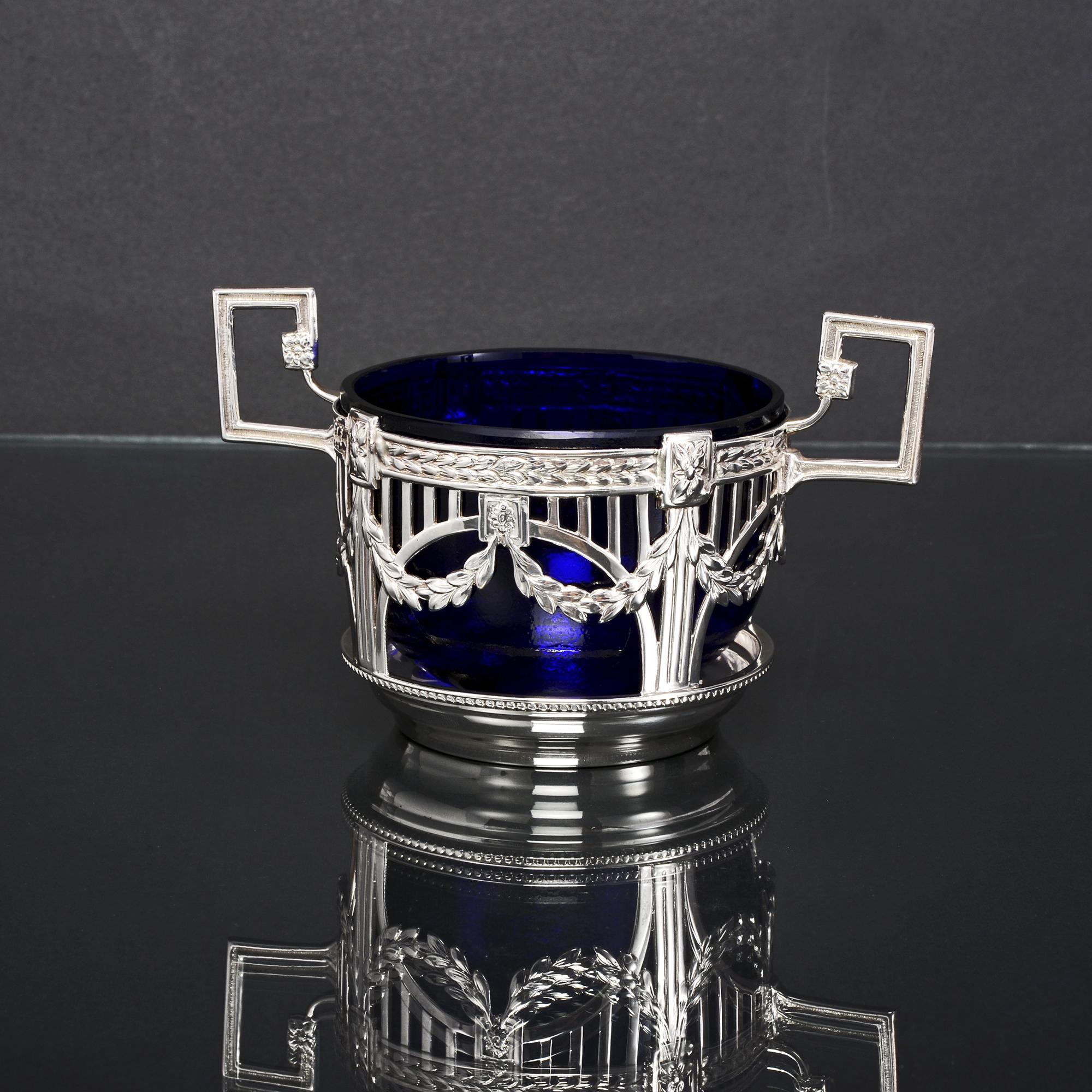 Edwardian two-handled sterling silver sugar bowl of openwork construction, pierced and decorated in the French First Empire style of the late 18th century. The bowl is fitted with a cobalt blue glass liner for ease of cleaning.