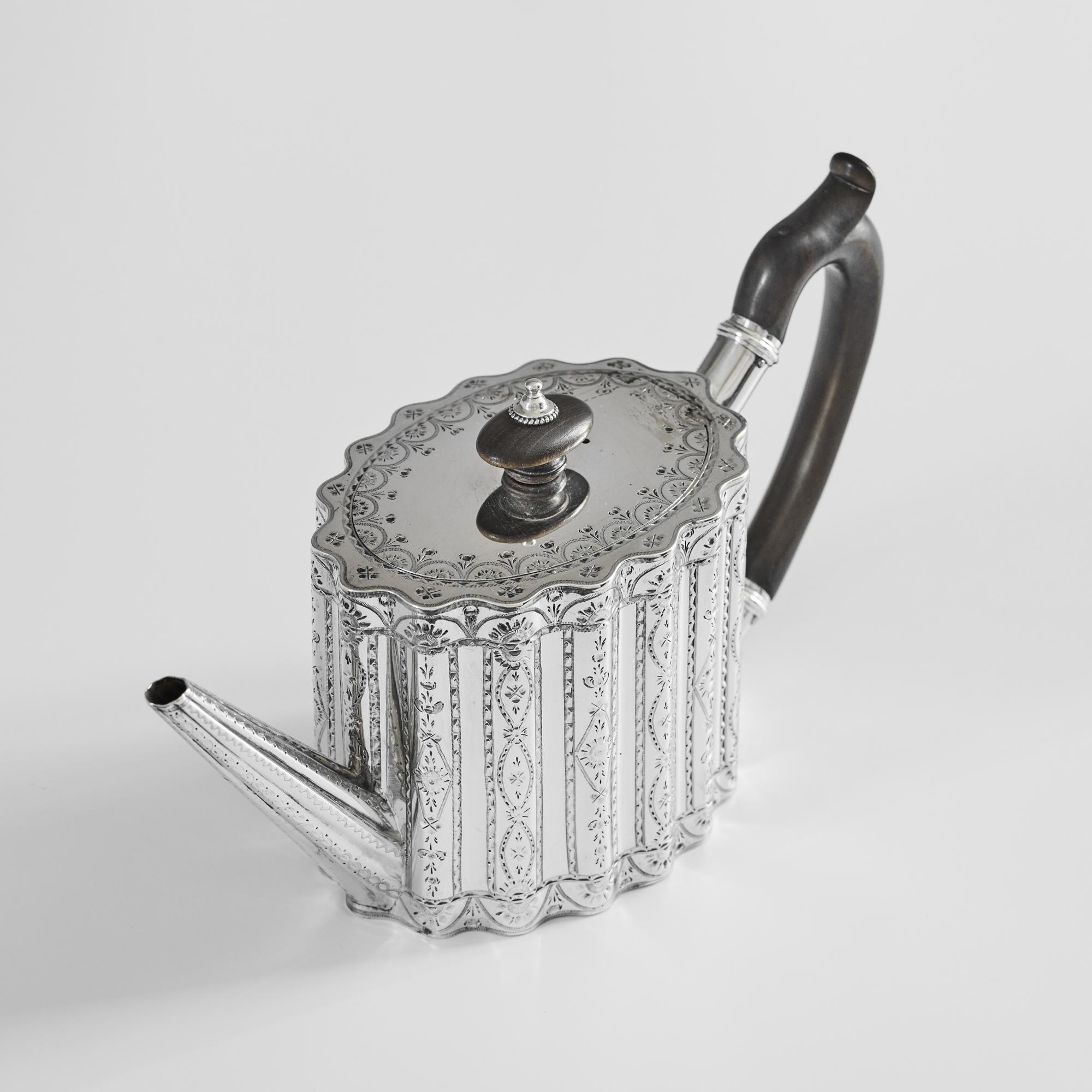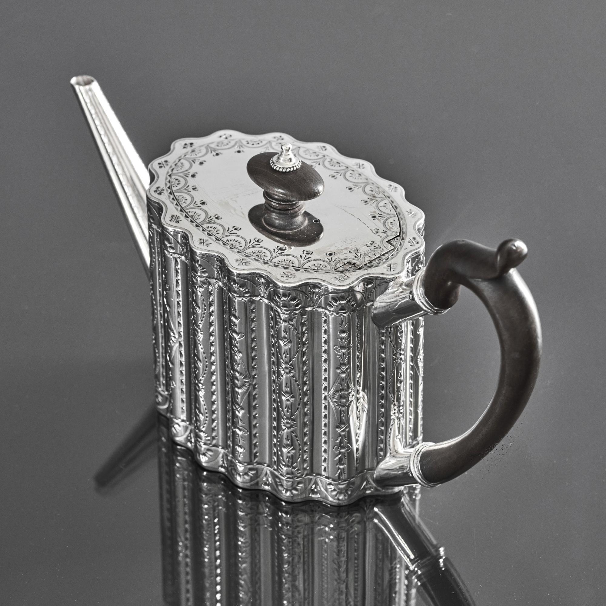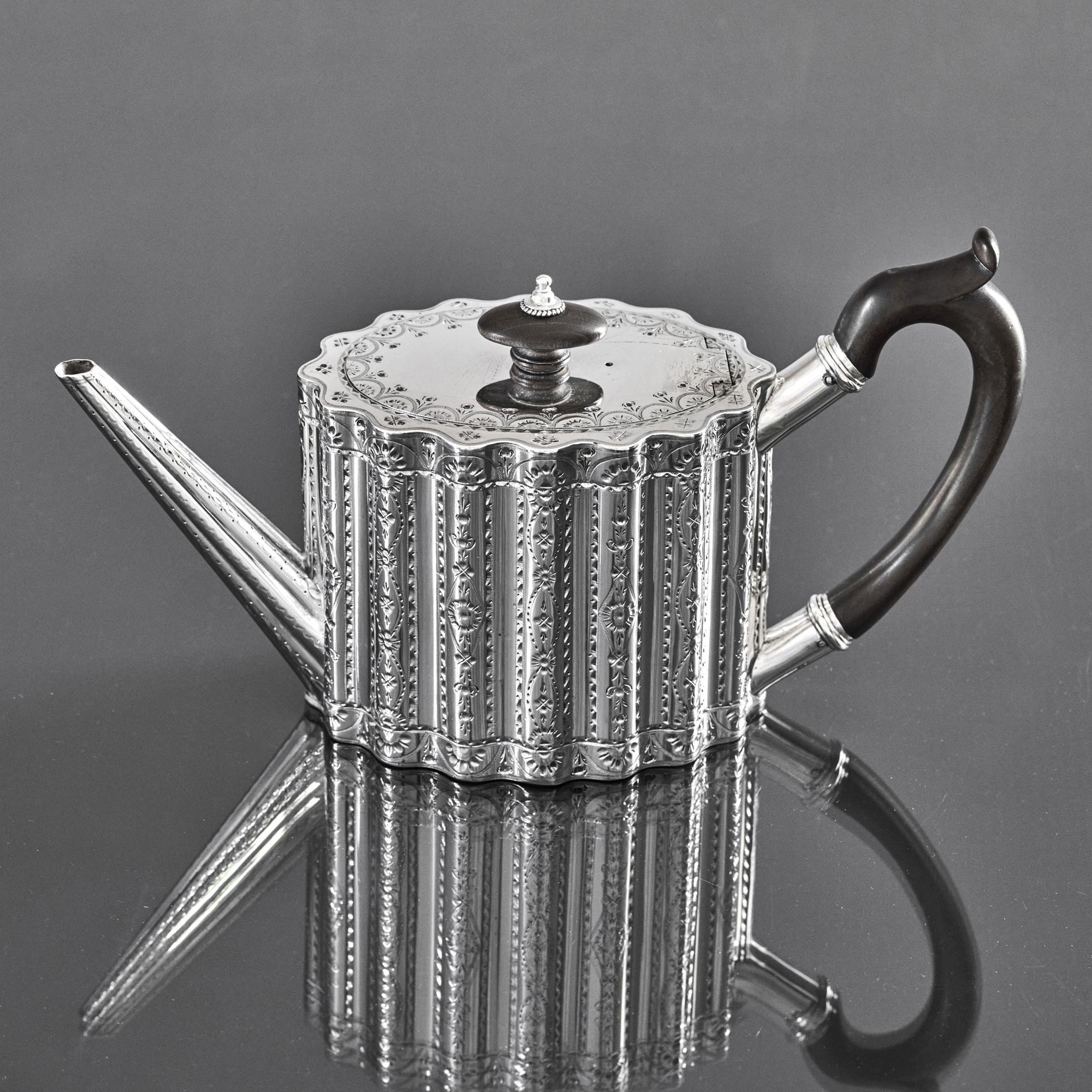 This beautiful, oval, ribbed, antique silver teapot is straight-sided with an attractive wavy profile decorated with bands of bright cut decoration. The lid has a hidden, flush jeweller's hinge, a sign of superior quality, and is surmounted by an oval wooden finial to complement the carved wood handle.