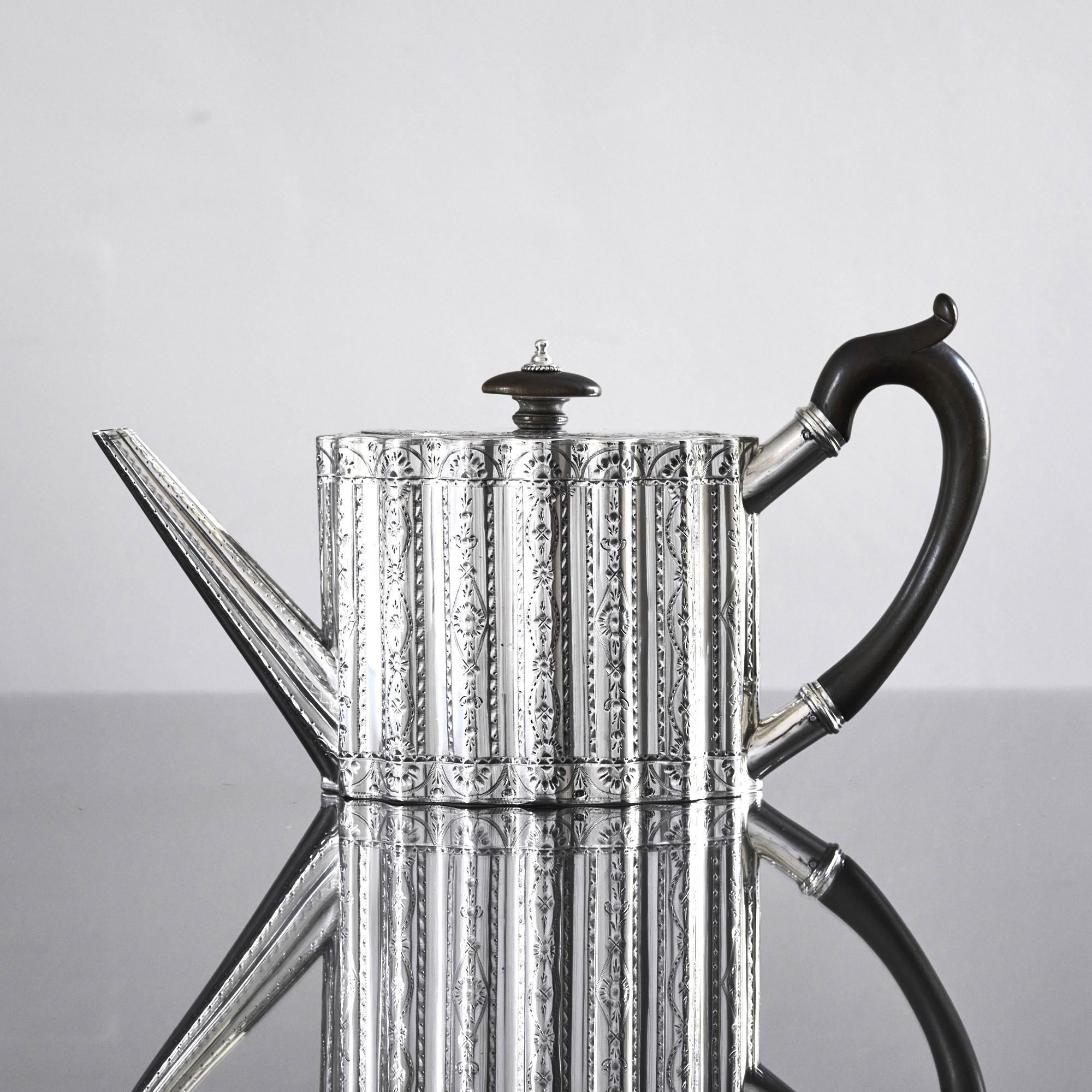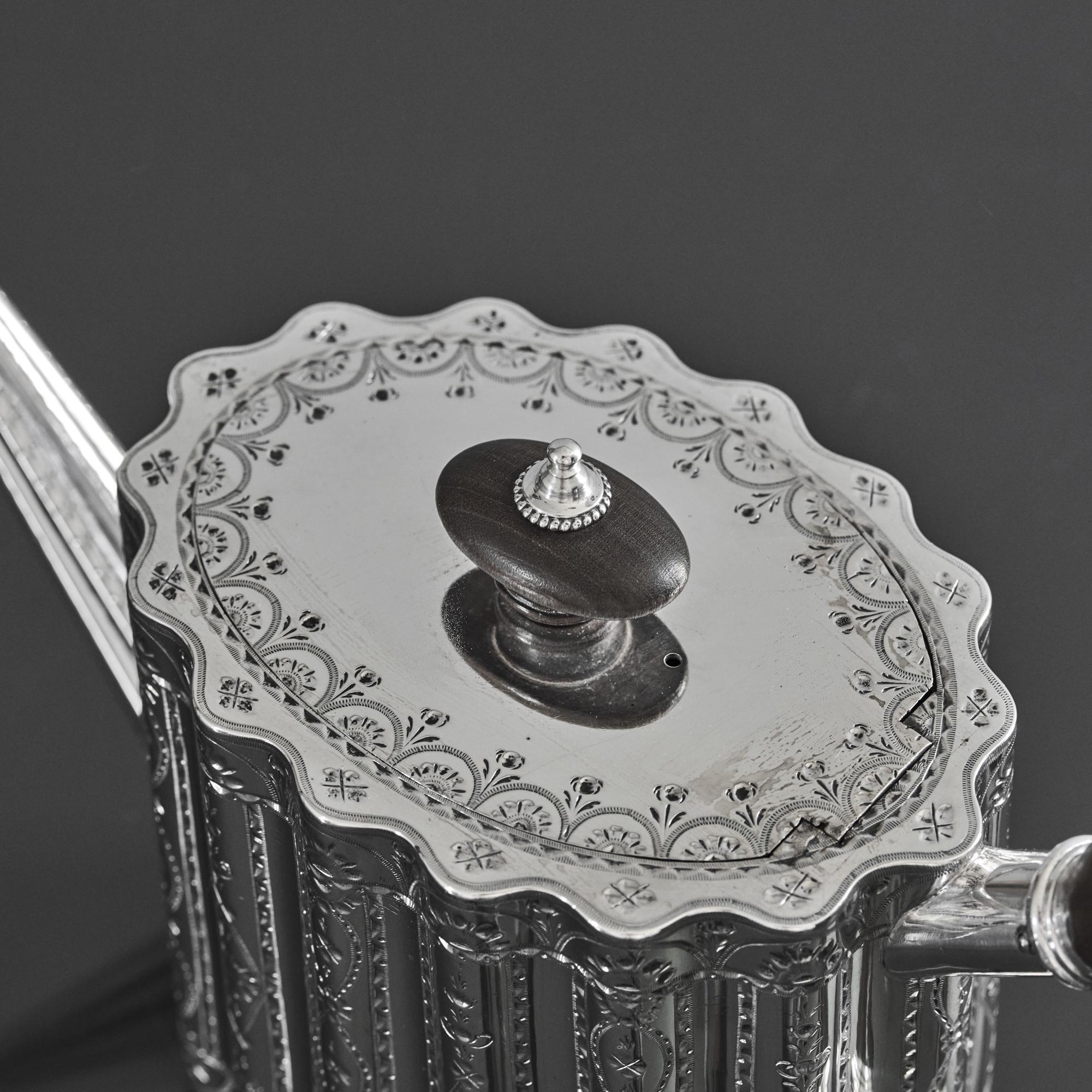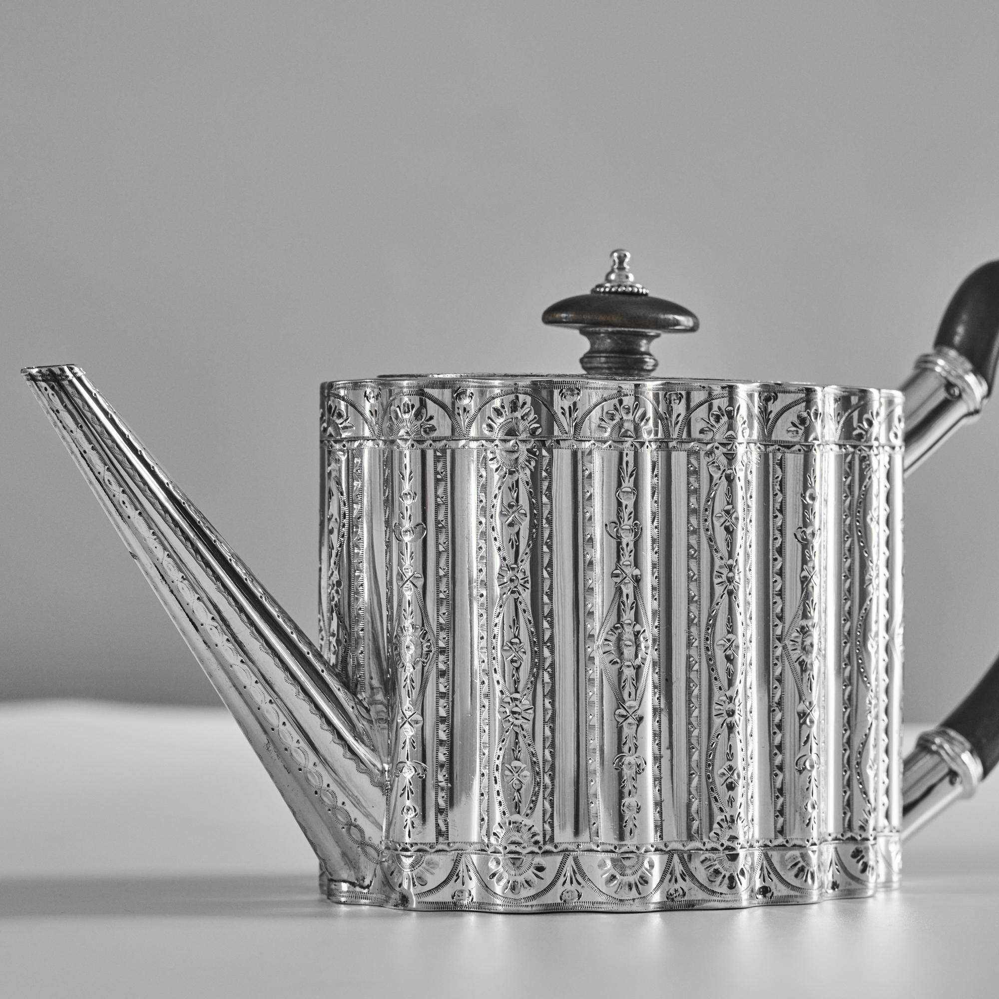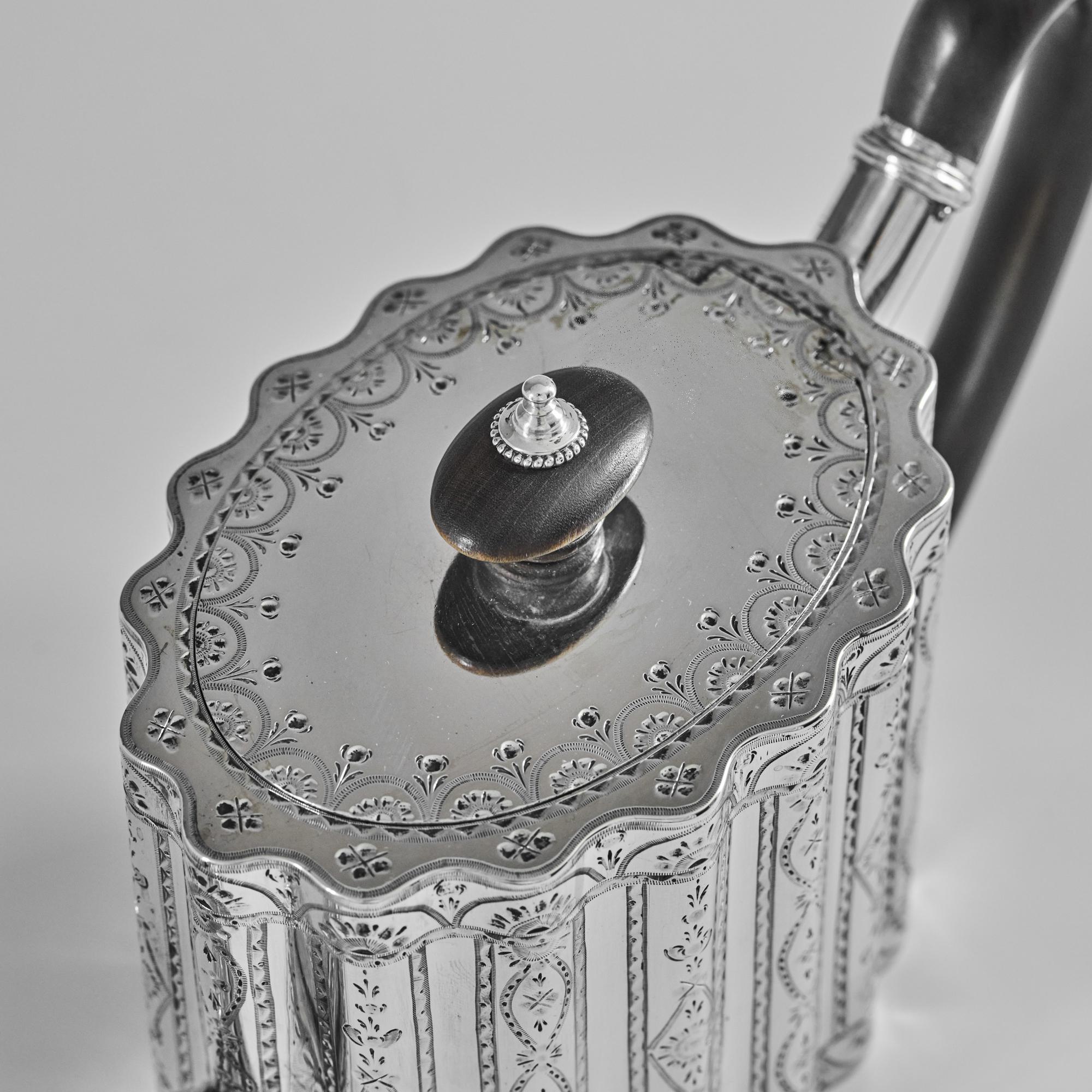 This beautiful, oval, ribbed, antique silver teapot is straight-sided with an attractive wavy profile decorated with bands of bright cut decoration. The lid has a hidden, flush jeweller's hinge, a sign of superior quality, and is surmounted by an oval wooden finial to complement the carved wood handle.