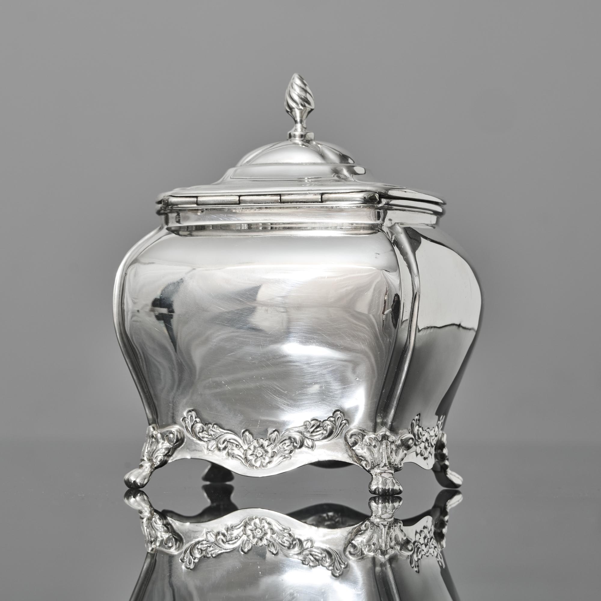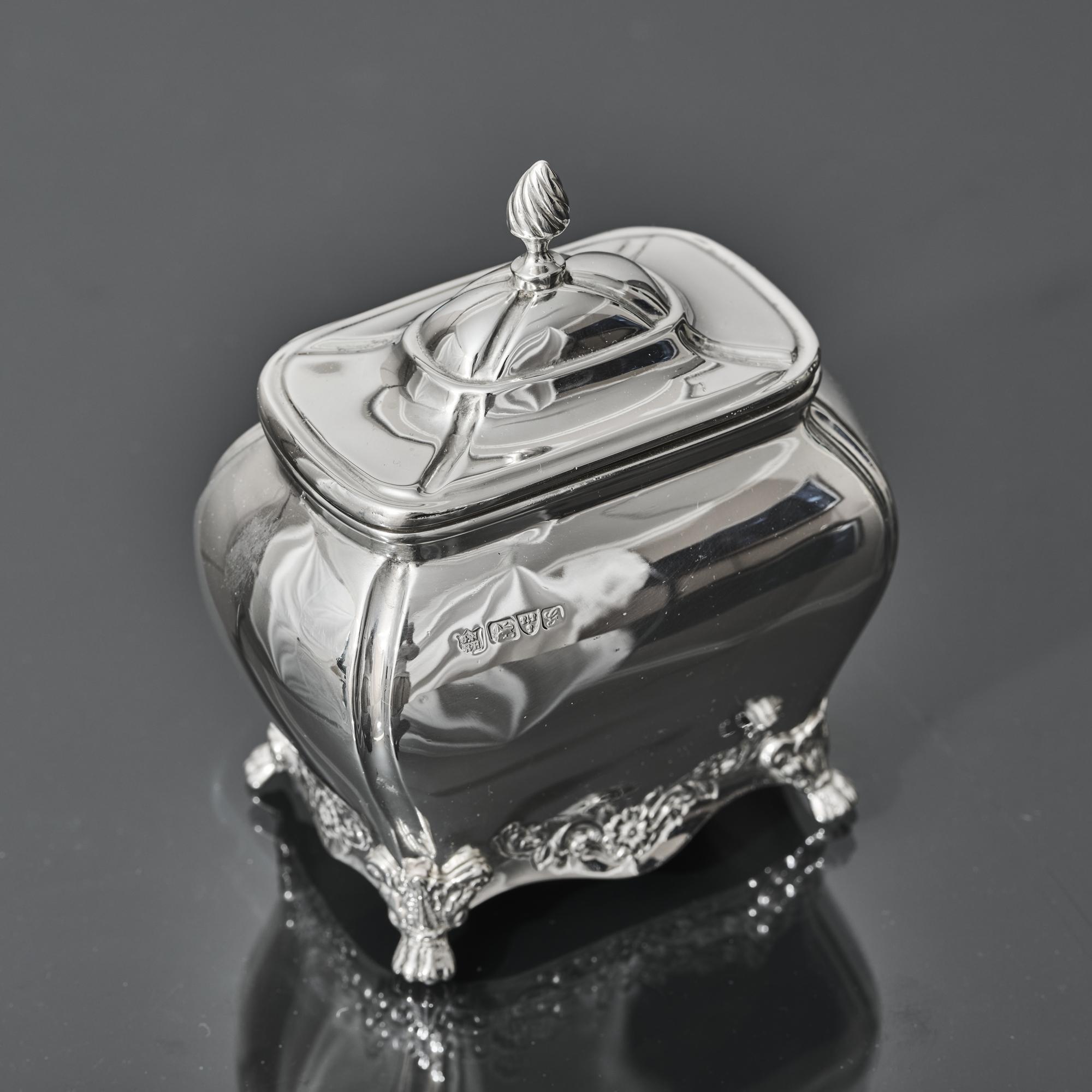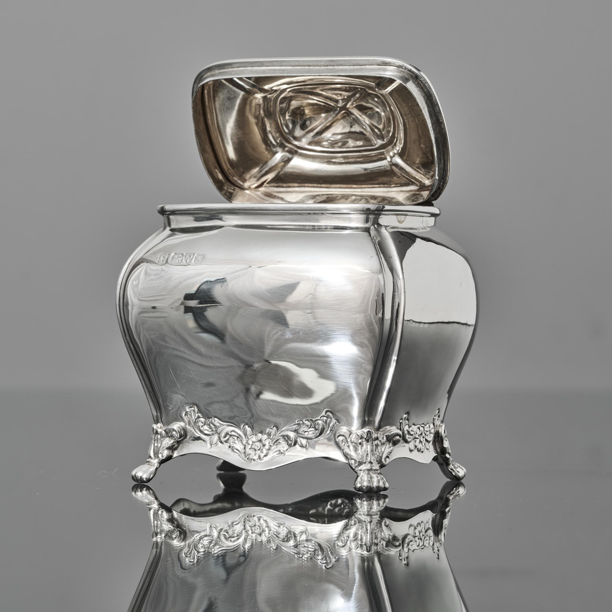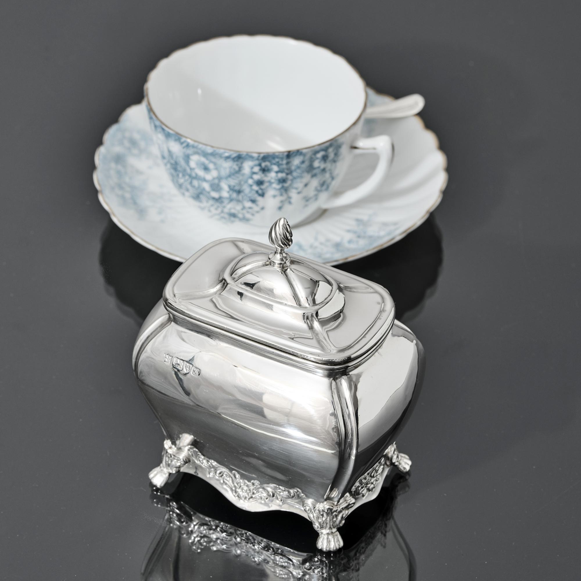 An oblong silver tea caddy of bombe form, made in 1907. With embossed floral motifs between the acanthus leaf and claw feet, this caddy is inspired by a Georgian style. It has a hinged lid with spiral fluted finial.
