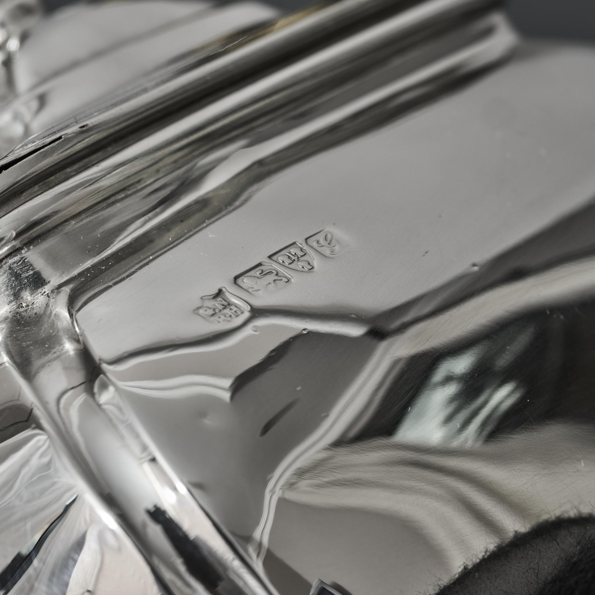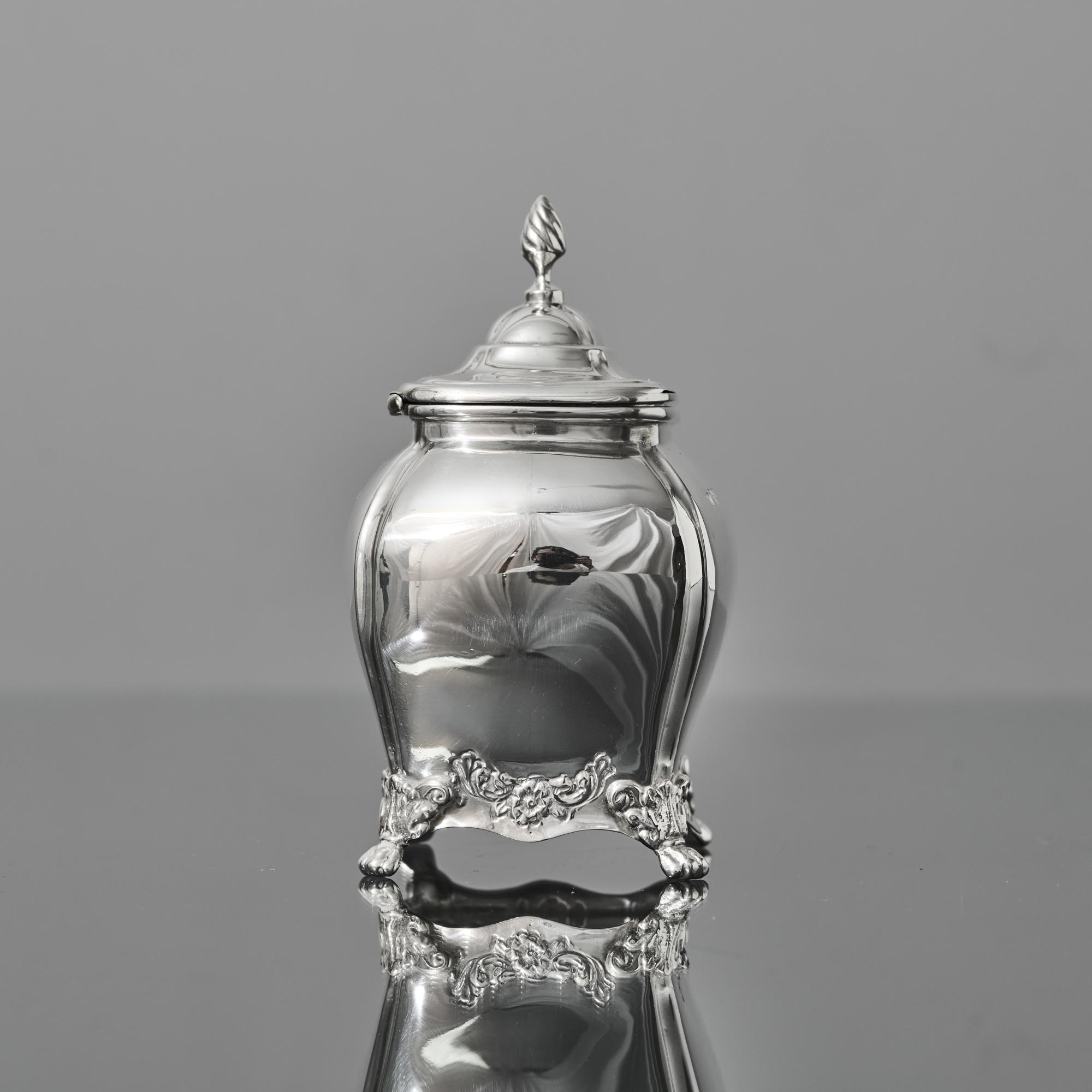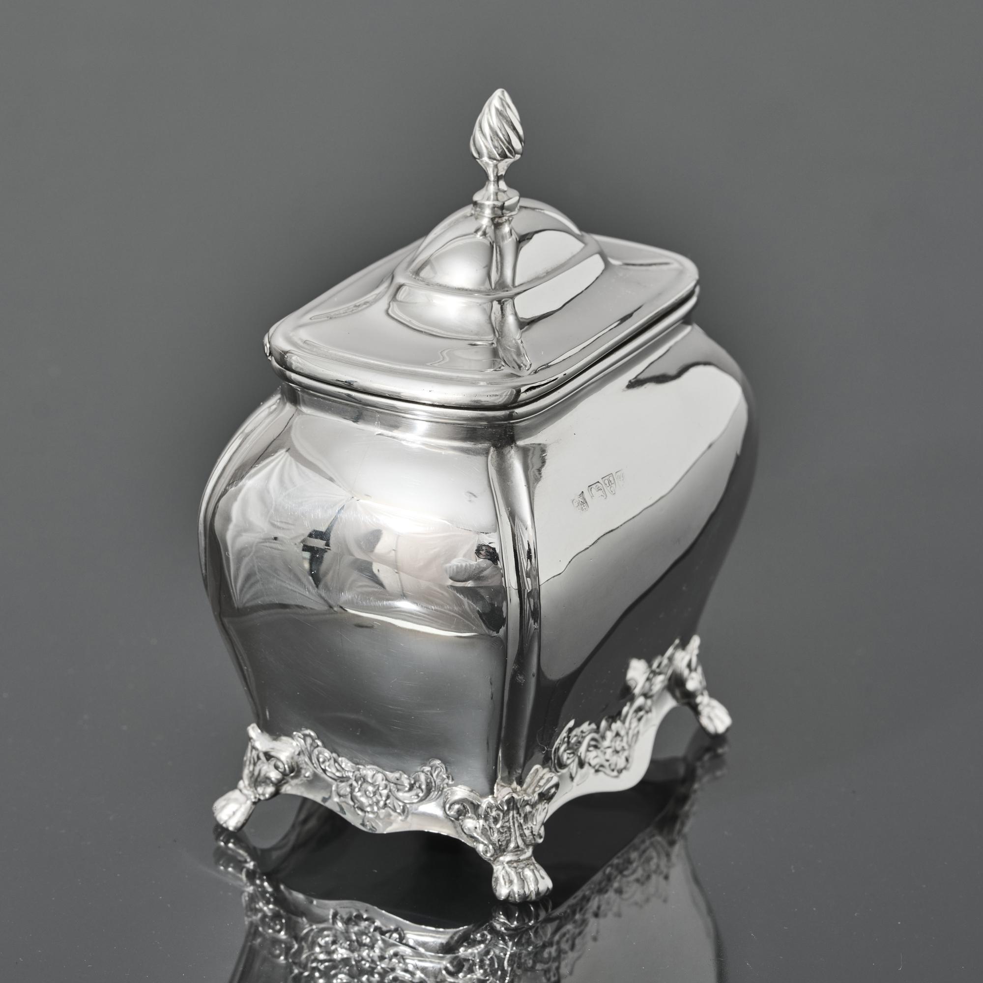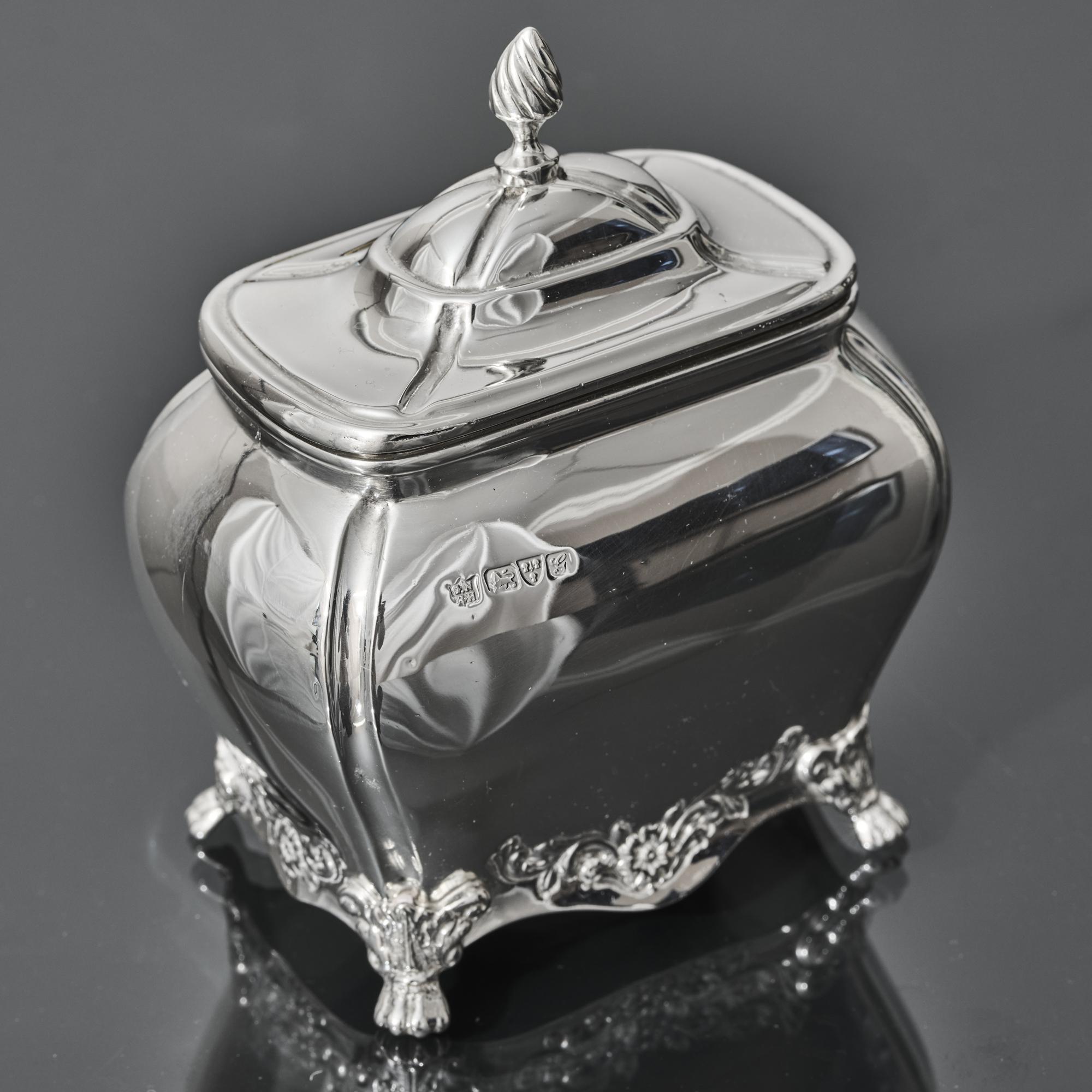 An oblong silver tea caddy of bombe form, made in 1907. With embossed floral motifs between the acanthus leaf and claw feet, this caddy is inspired by a Georgian style. It has a hinged lid with spiral fluted finial.