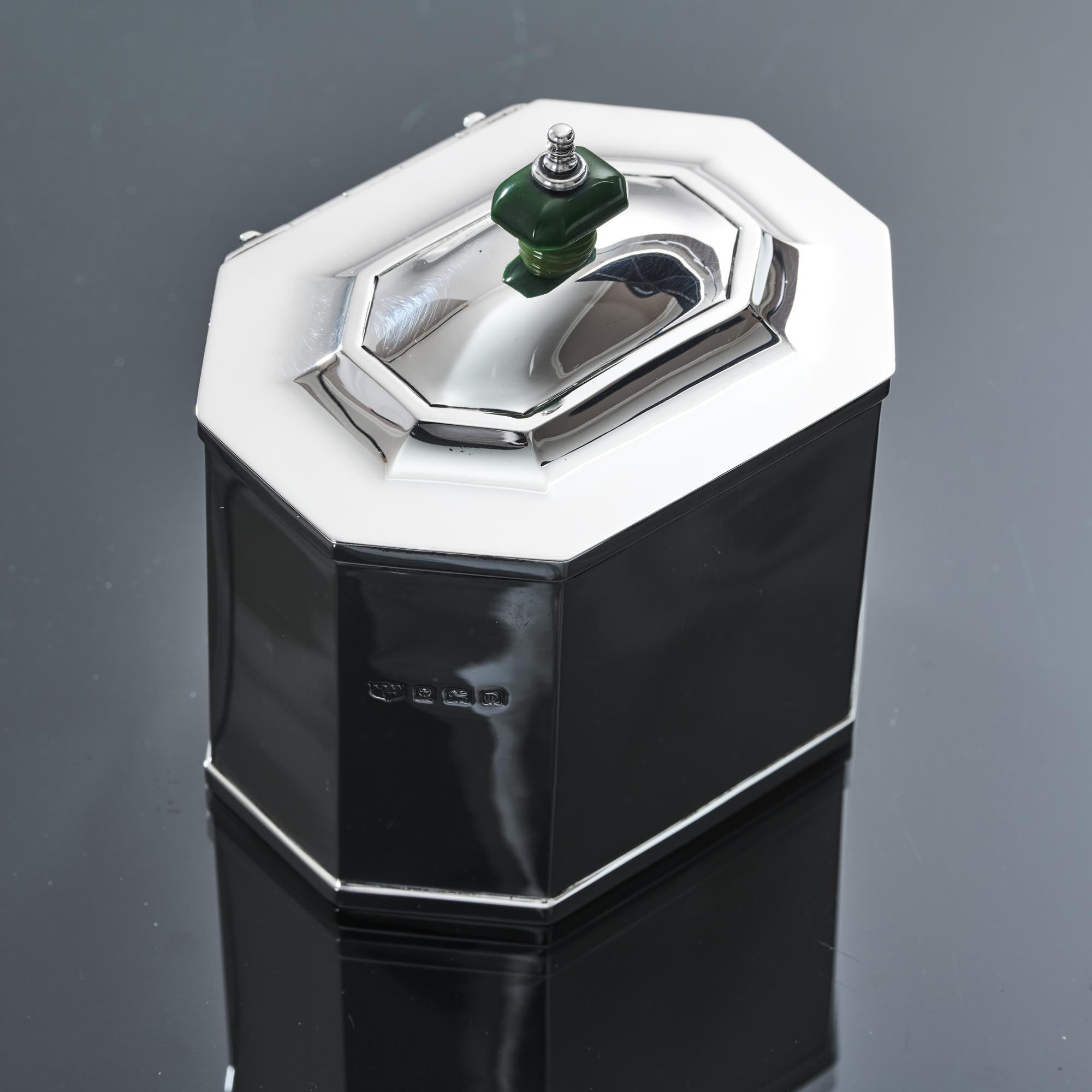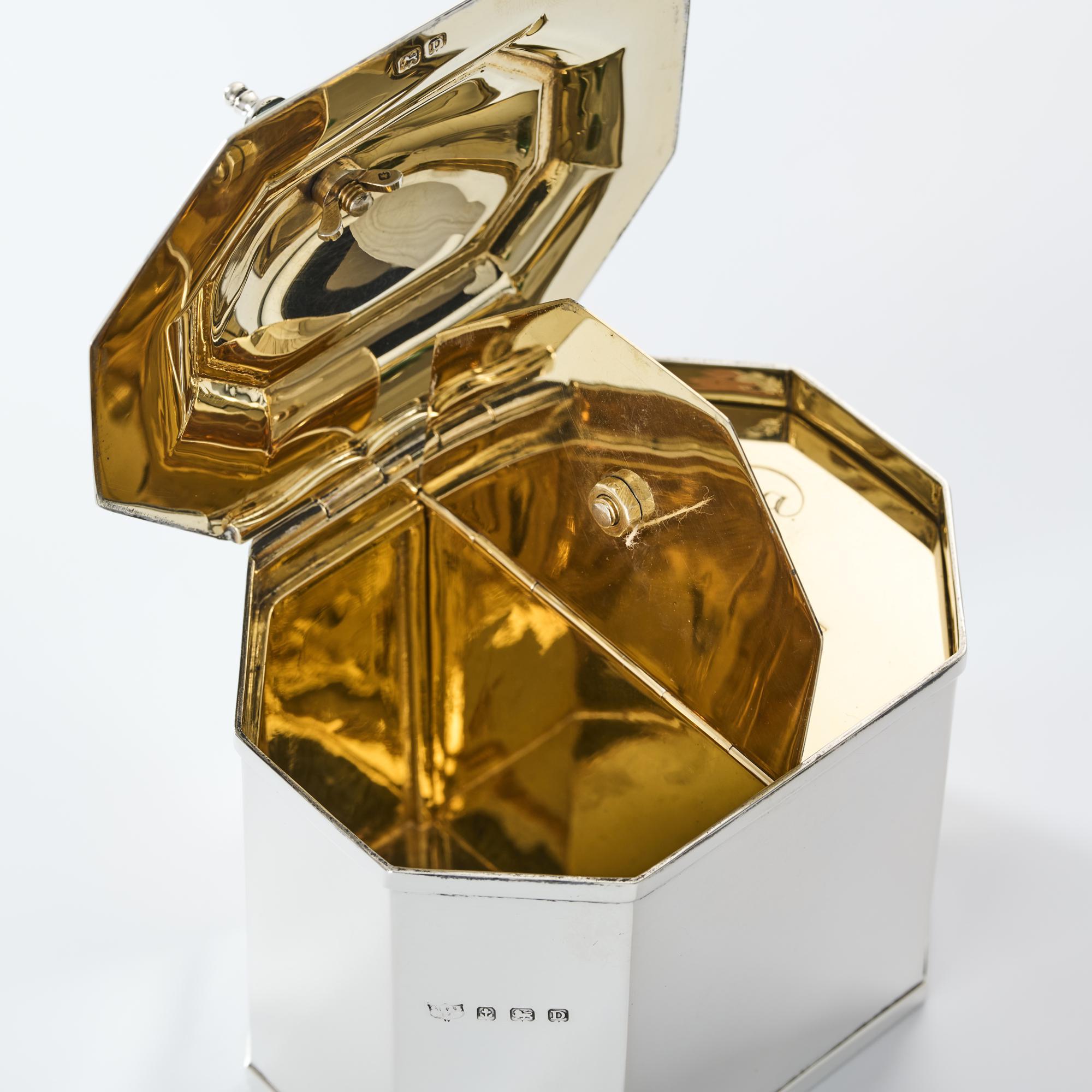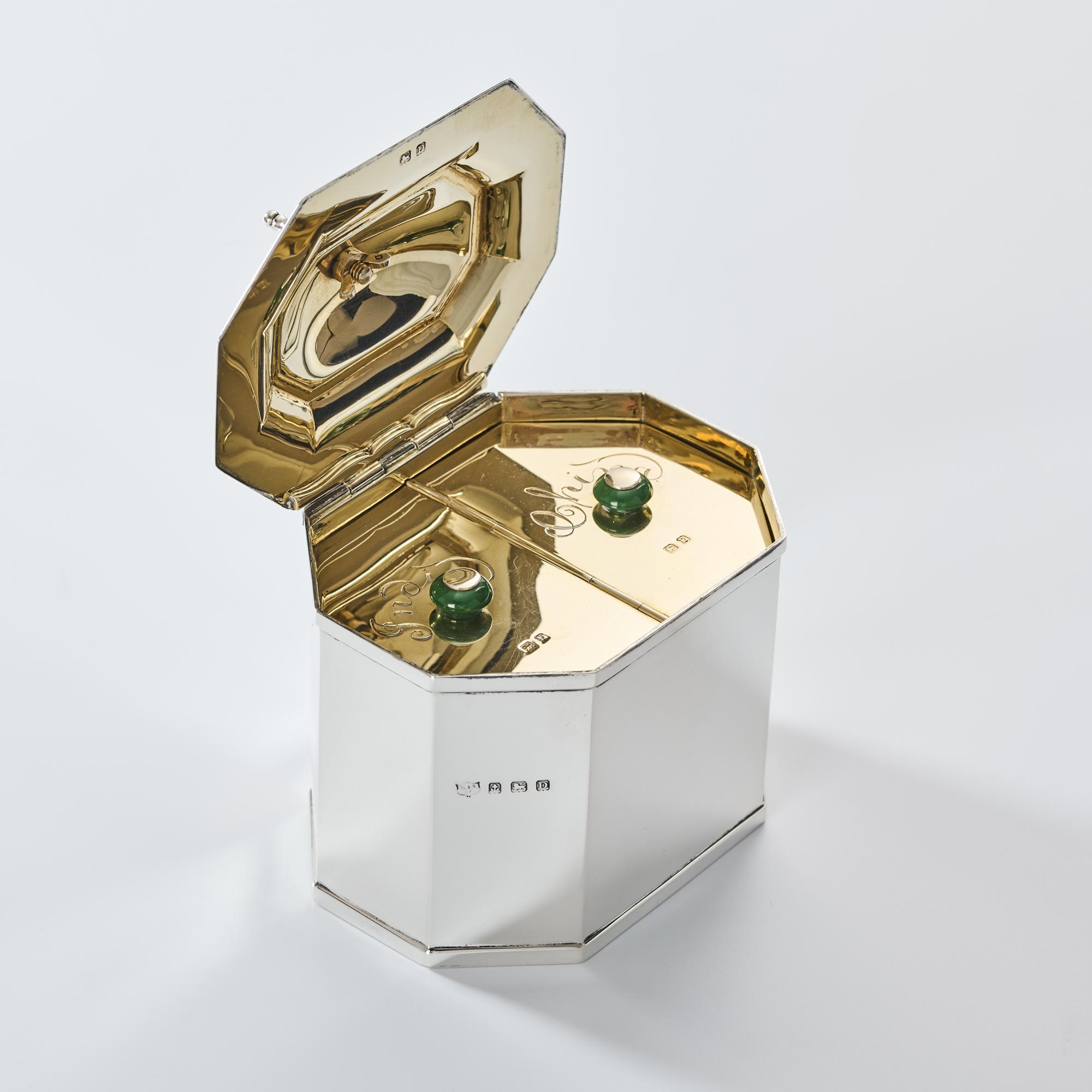 Irregular octagon-shaped Art Deco era silver tea caddy with two compartments either side of a central partition for separate teas. Each has a hinged gilded cover fitted with a detachable bun-shaped faux jade finial; one cover charmingly engraved India and the other China. The interiors are fully gilded. The caddy's hinged lid is slightly domed and surmounted by a lovely detachable faux jade finial. Overall a charming addition to any tea set.