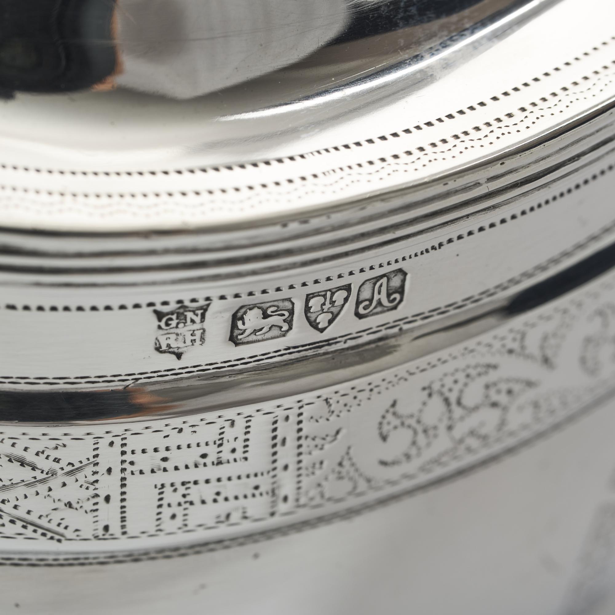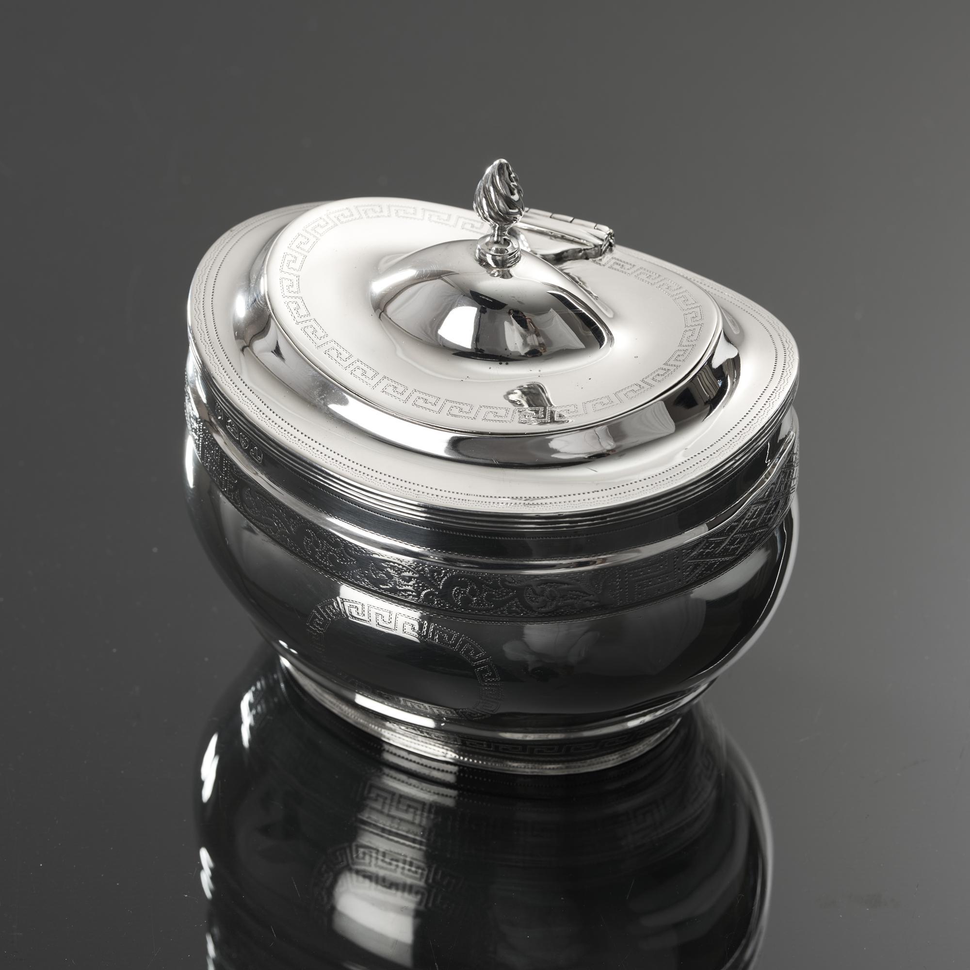 Classic silver tea caddy of oval boat shaped form, decorated with a band of hand engraving in pinprick style beneath the rim, and Greek key pattern around the hinged cover. This design was first made popular during the latter part of the 18th century.