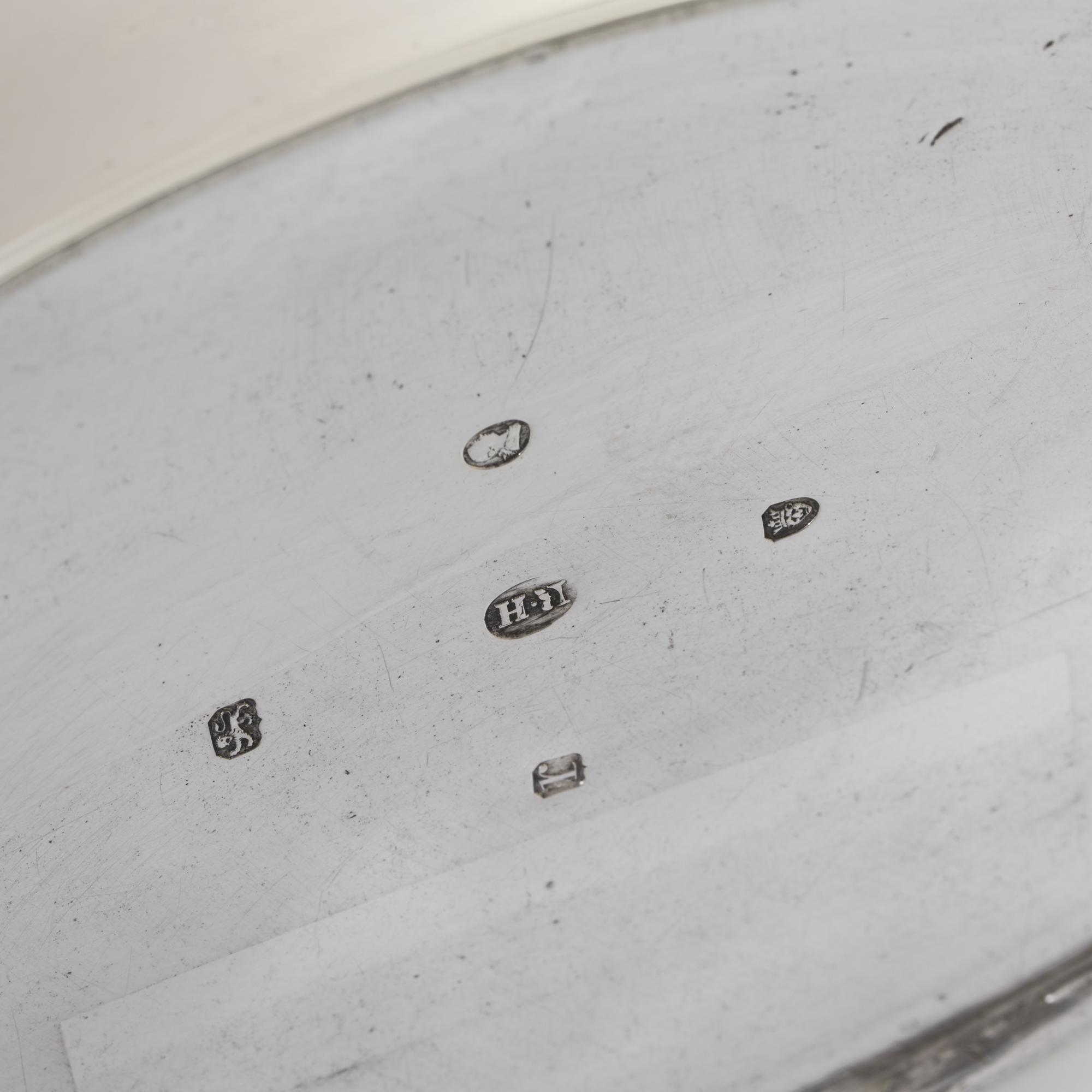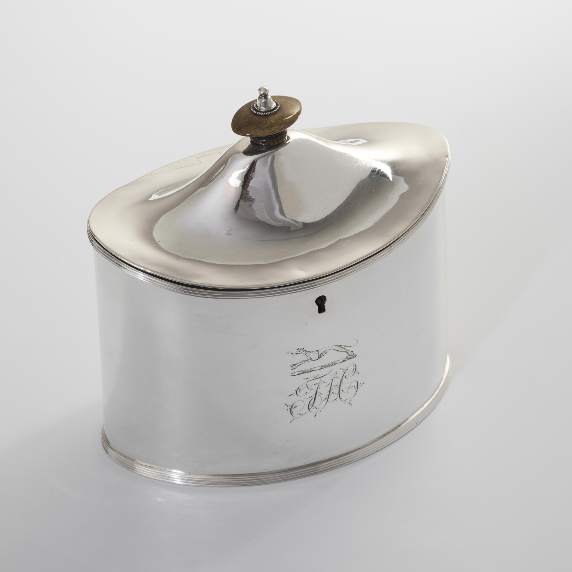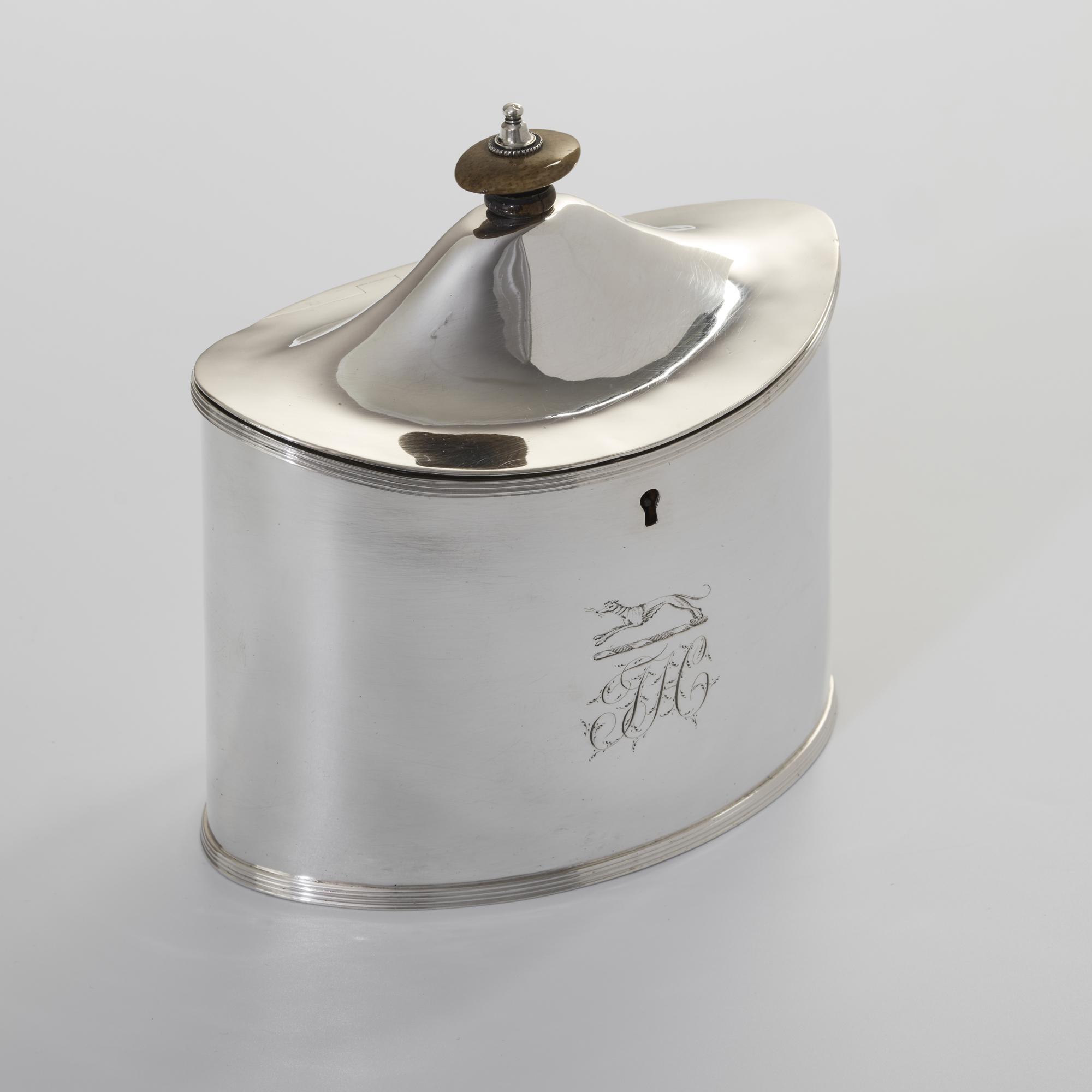 The front of the caddy is hand engraved with three entwined initials surmounted by a family crest of a greyhound. The tea caddy belonged to Sir Owen Henry Philipps Scourfield, 2nd Baronet of the Mote and of Williamston (1847-1921) who was an MP for Havorfordwest.
