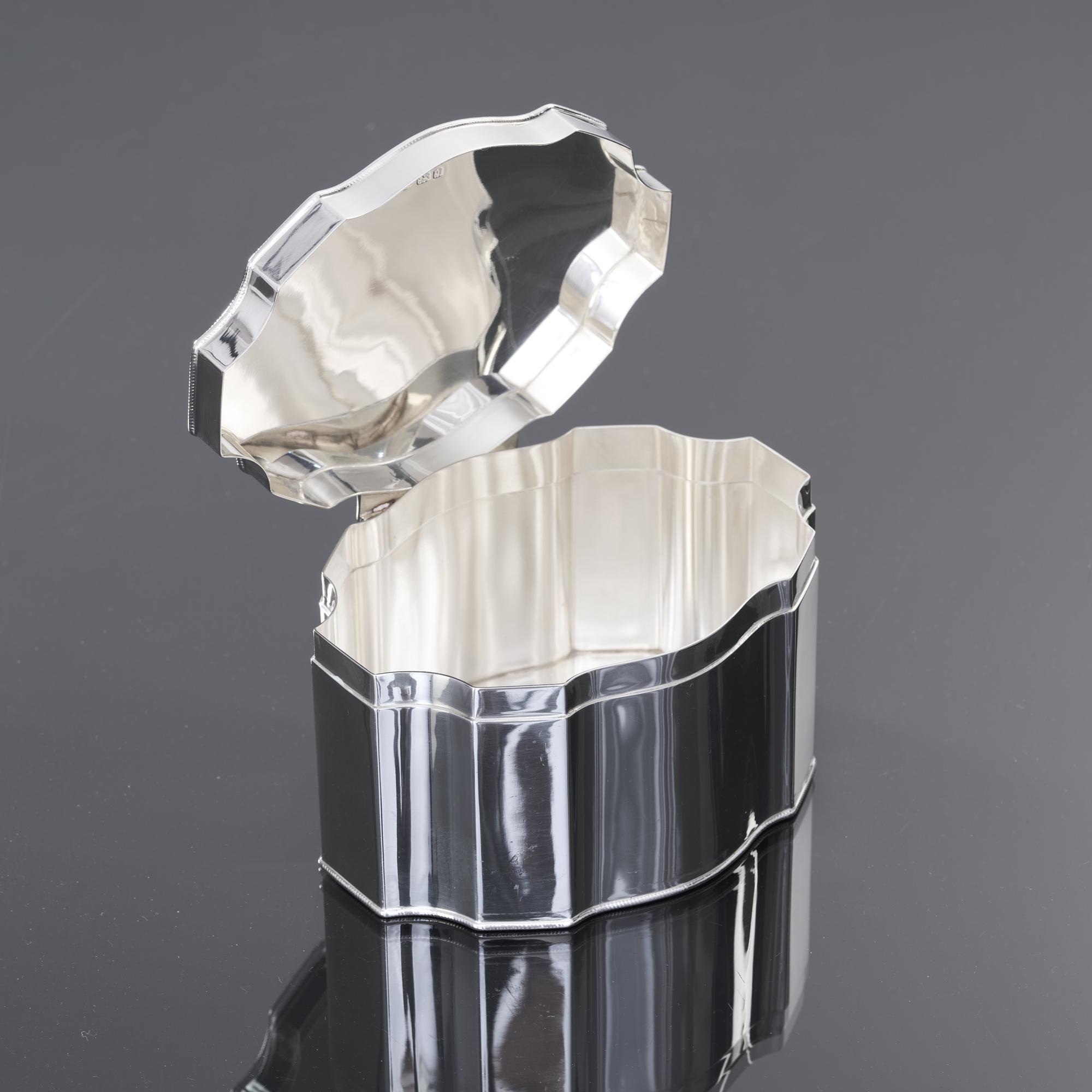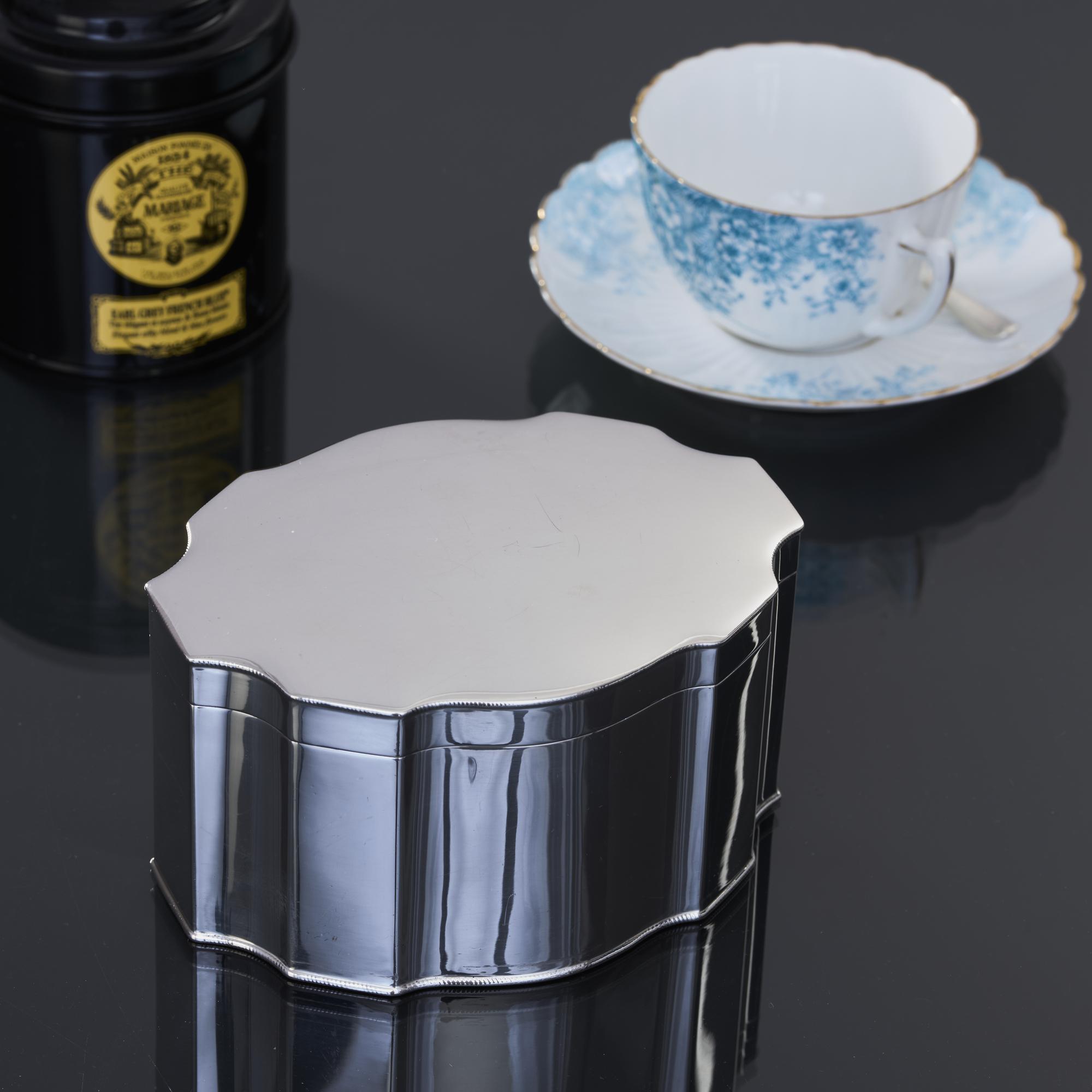 Silver tea caddy box with hinged cover, of oval shaped and panelled form. This large caddy could also double as a box to hold sweets or as a cotton bud dispenser.