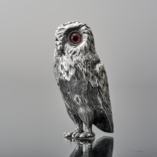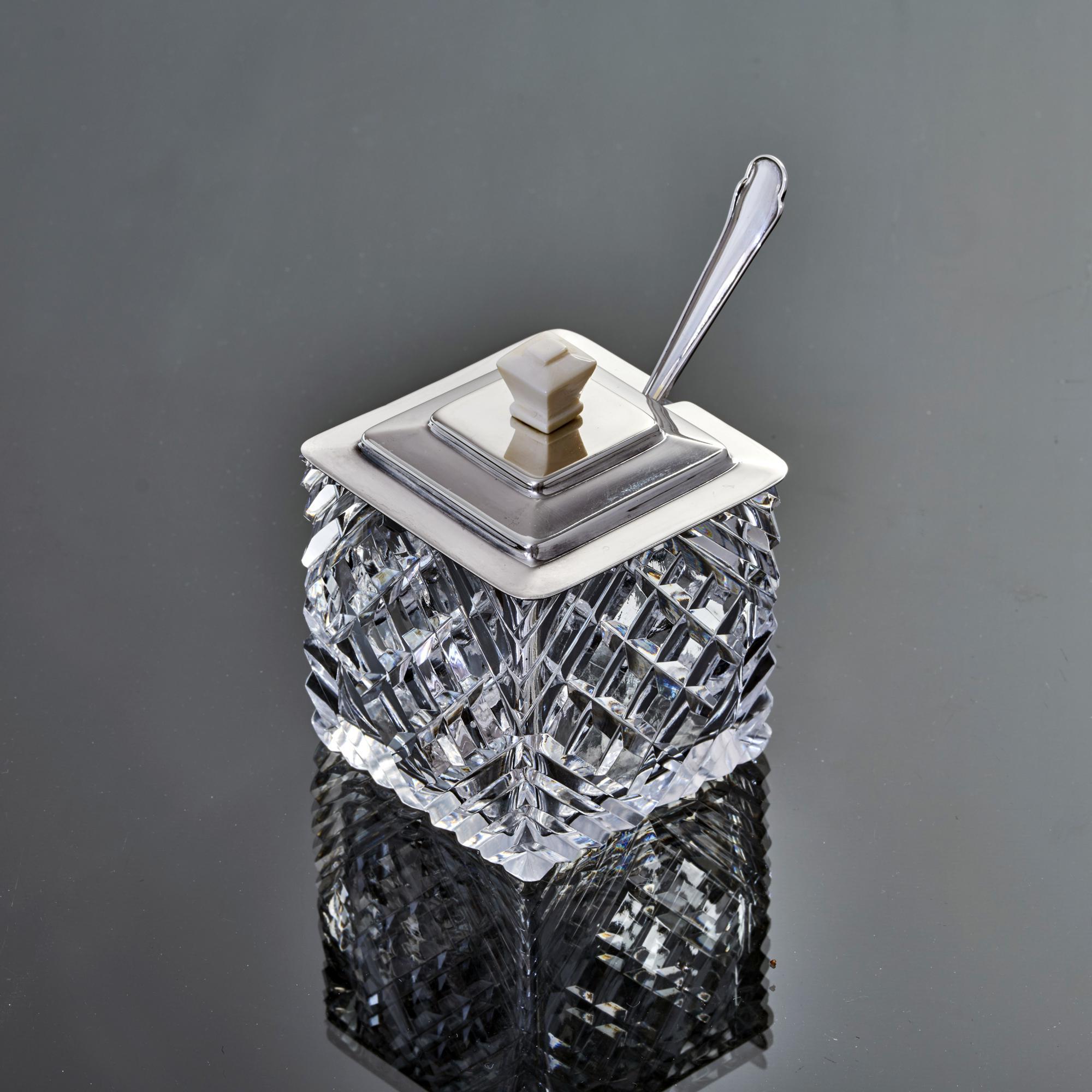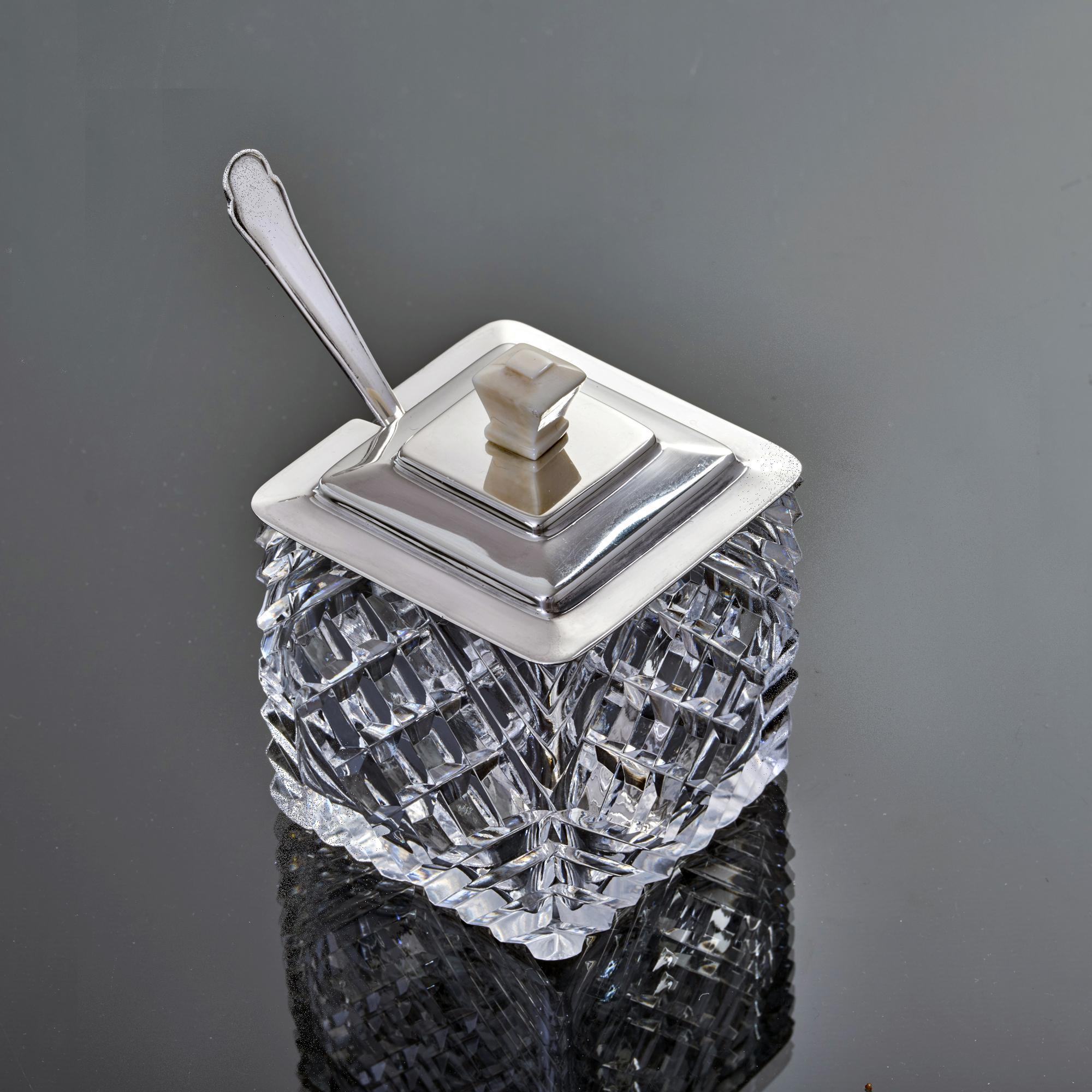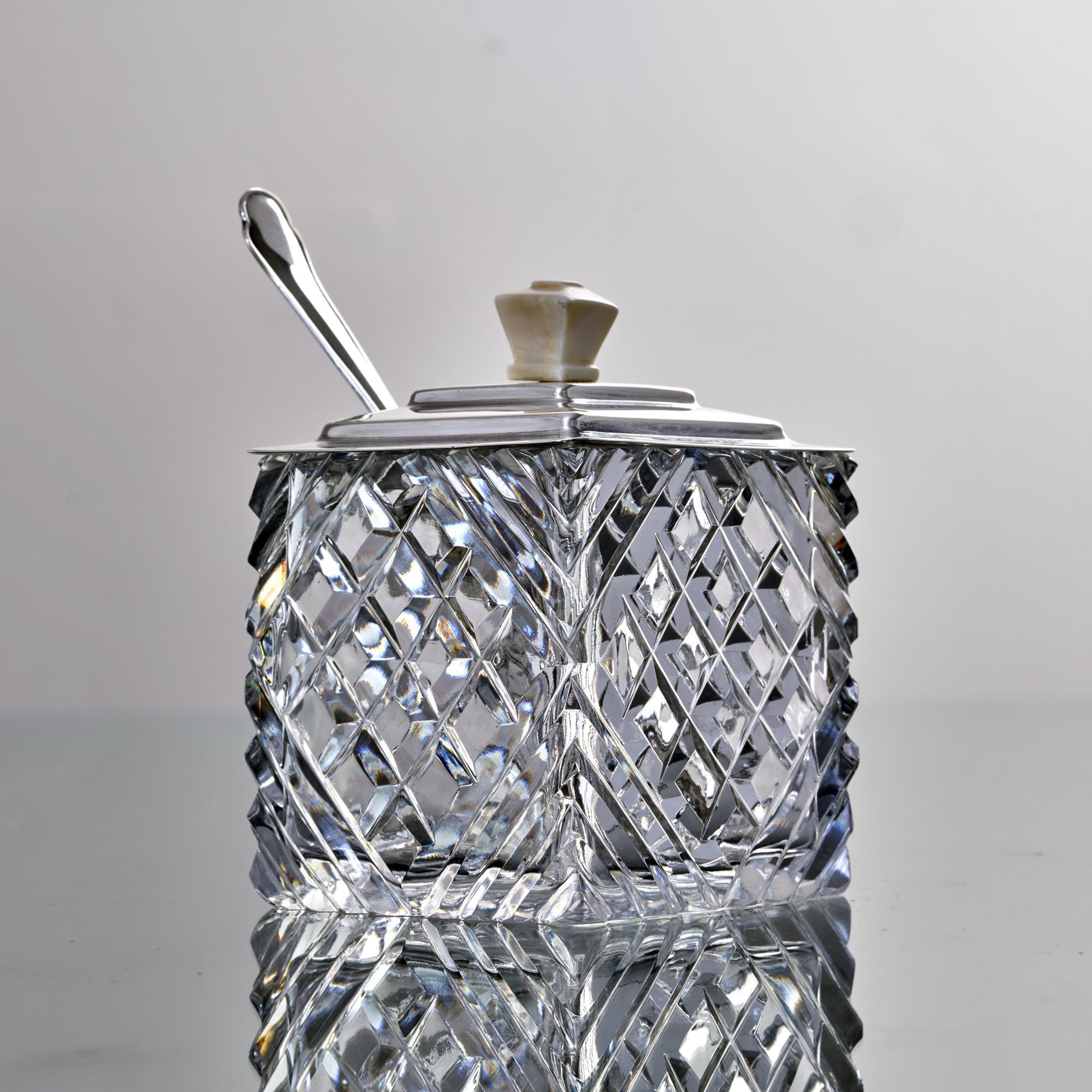 Square Art Deco cut glass jam or preserve jar with sterling silver cover and spoon. Made during WWII the body of the jam jar is hand cut with diamond and hobnail cut panels, while the stepped silver cover is fitted with a faux ivory finial; classic Art Deco design motifs. The jar's original silver jam spoon was made in 1939.