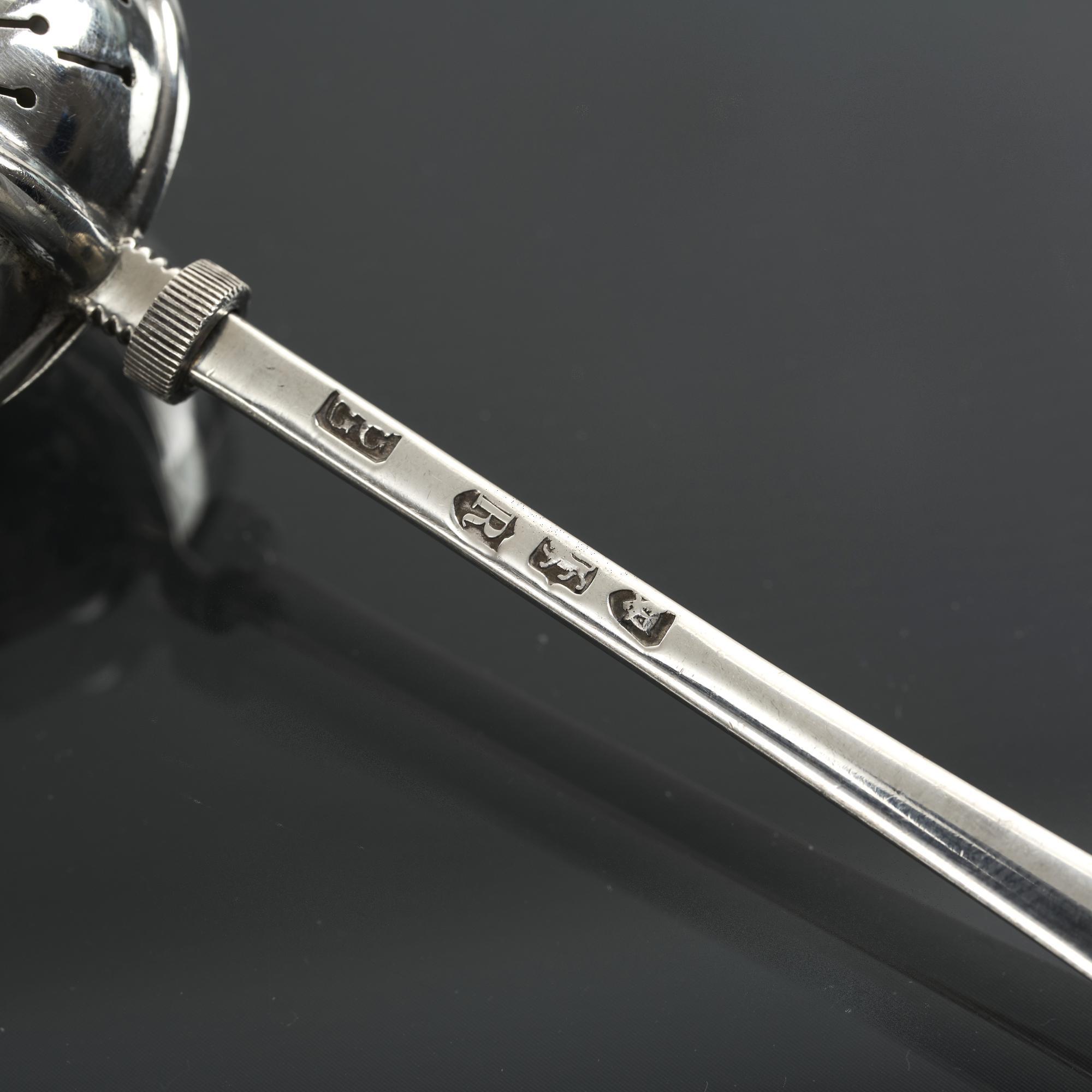This is a lovely example of a silver tea infuser in the "TEAETTE" design featuring the patented hinged opening mechanism made exclusively by George Gray in the late Victorian and early 20th century. This piece is one of the first examples. The hinged bowl holds the tea and is secured by a knurled nut on the shank and the infuser is in excellent polished condition.
