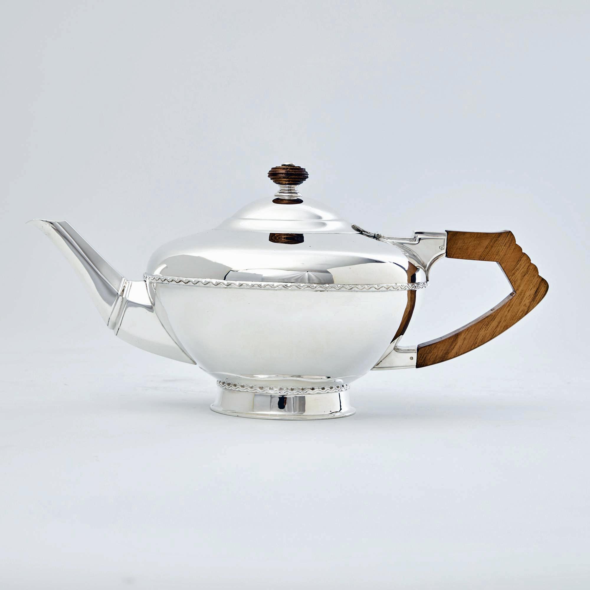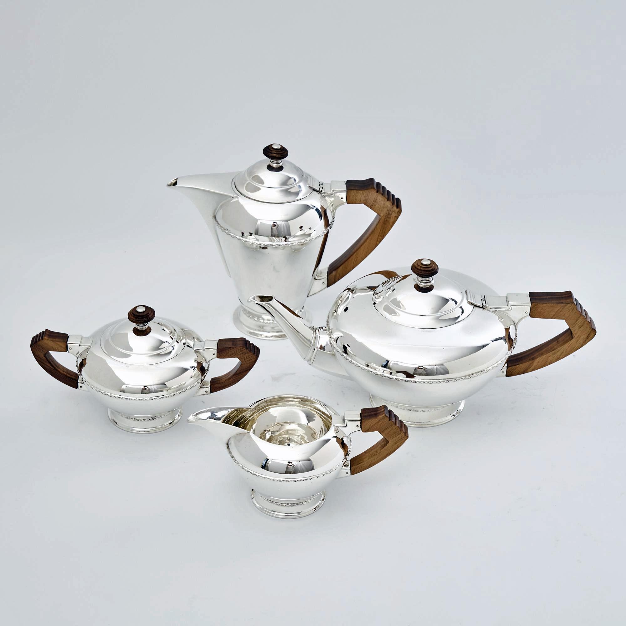 Highly stylised, Art Deco, four-piece silver tea set comprising tea set, hot water jug, lidded sugar bowl and milk jug. The pieces of the tea set are decorated with a stepped pattern while the bodies feature applied wave pattern girdles and subtle wavy decorations above the collet bases. The handles and finials are carved ivory and the sugar bowl has a pull-off cover.