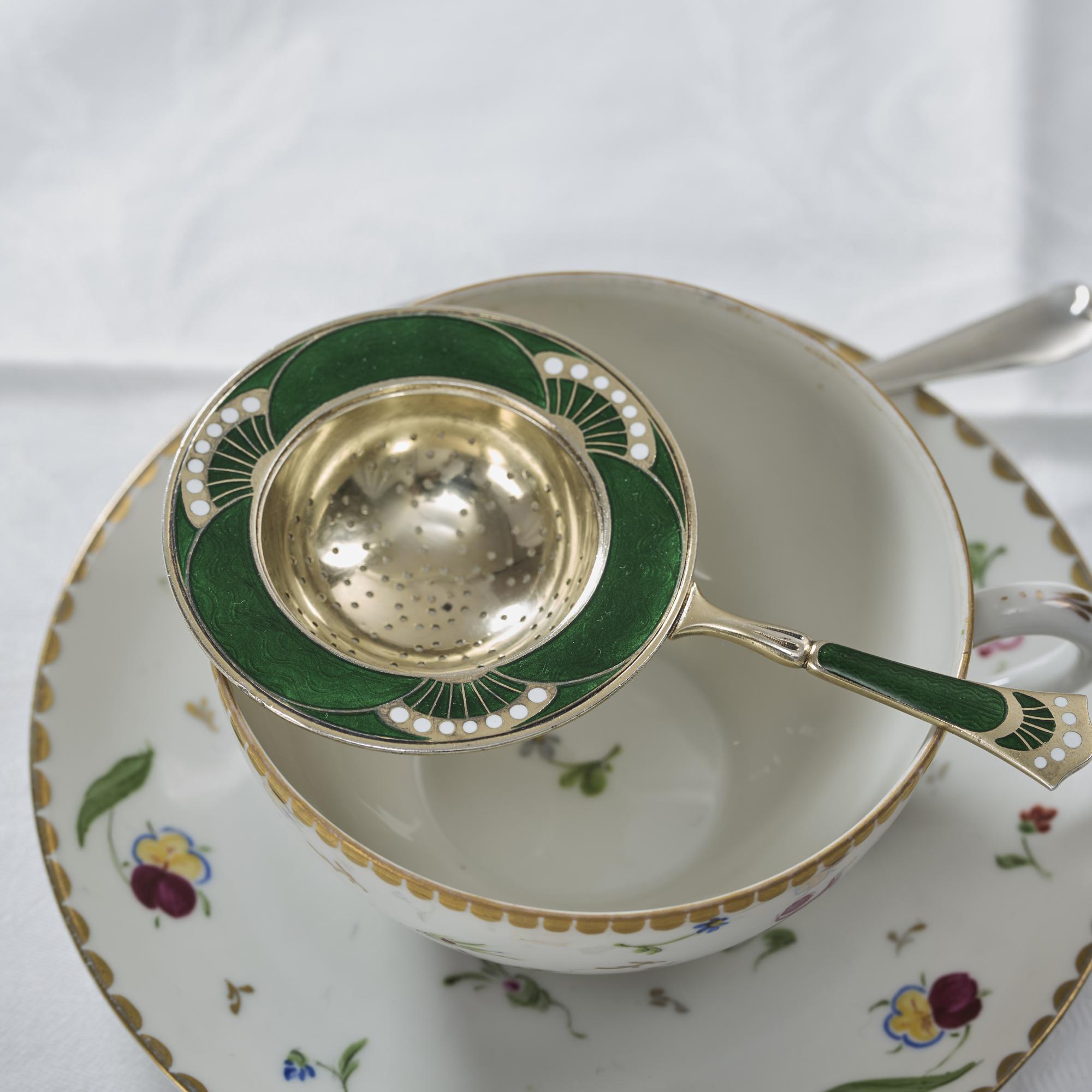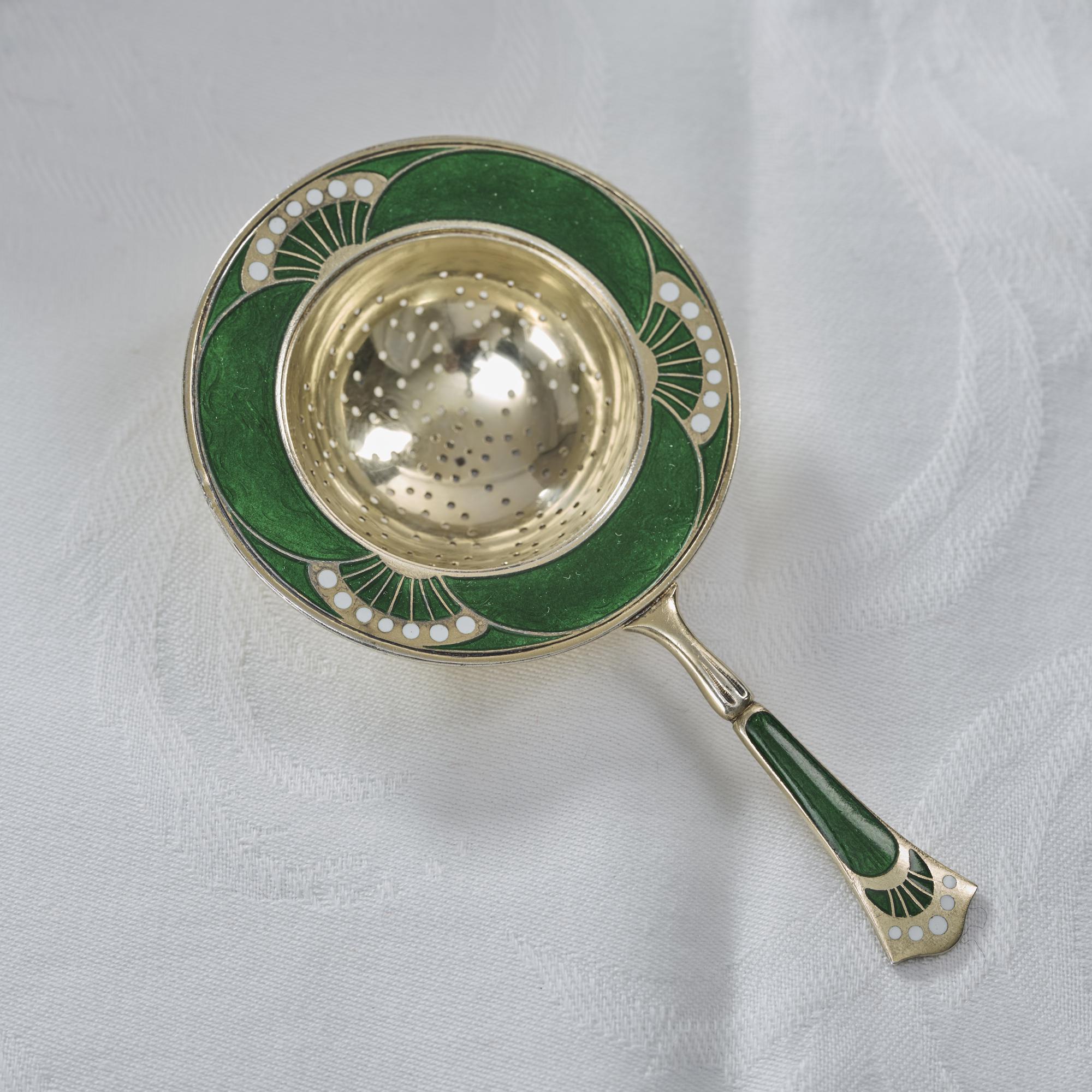 - Antique Norwegian silver-gilt & enamel tea strainer