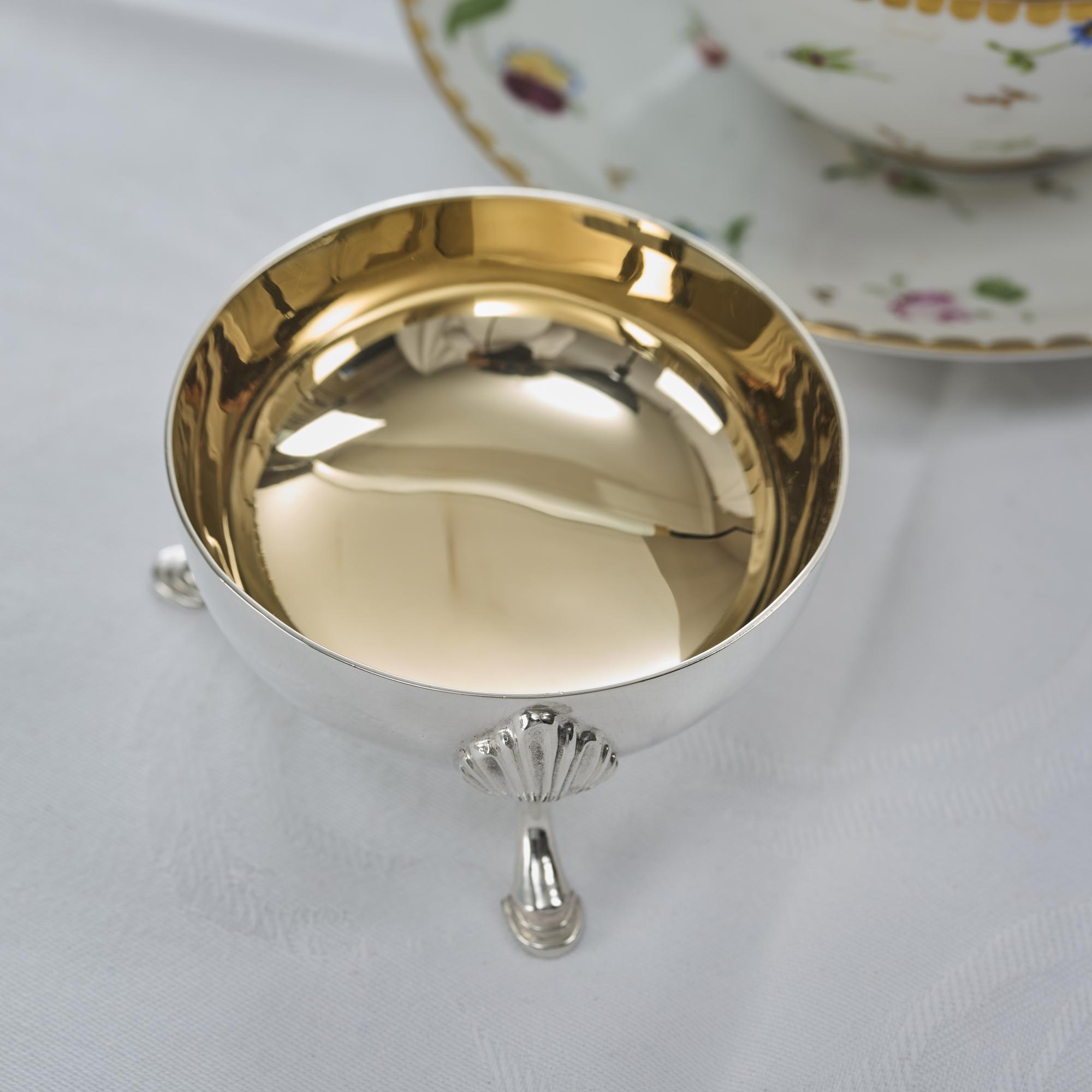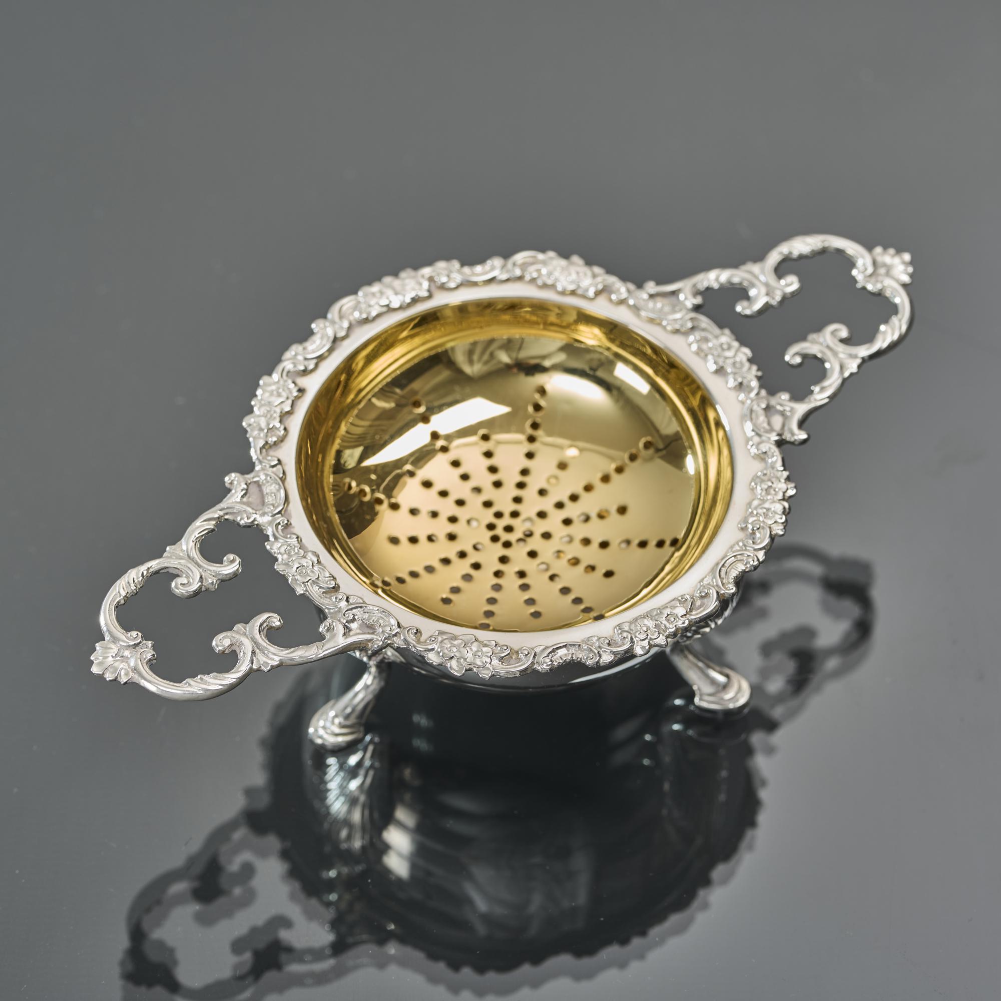 Much better than average, two-handled, heavy-gauge sterling silver tea strainer resting on its original silver stand. The pierced interior of the strainer is gilded and fitted with an applied cast floral and scroll mount and handles. The stand is mounted on three cast hoof-shaped supports.