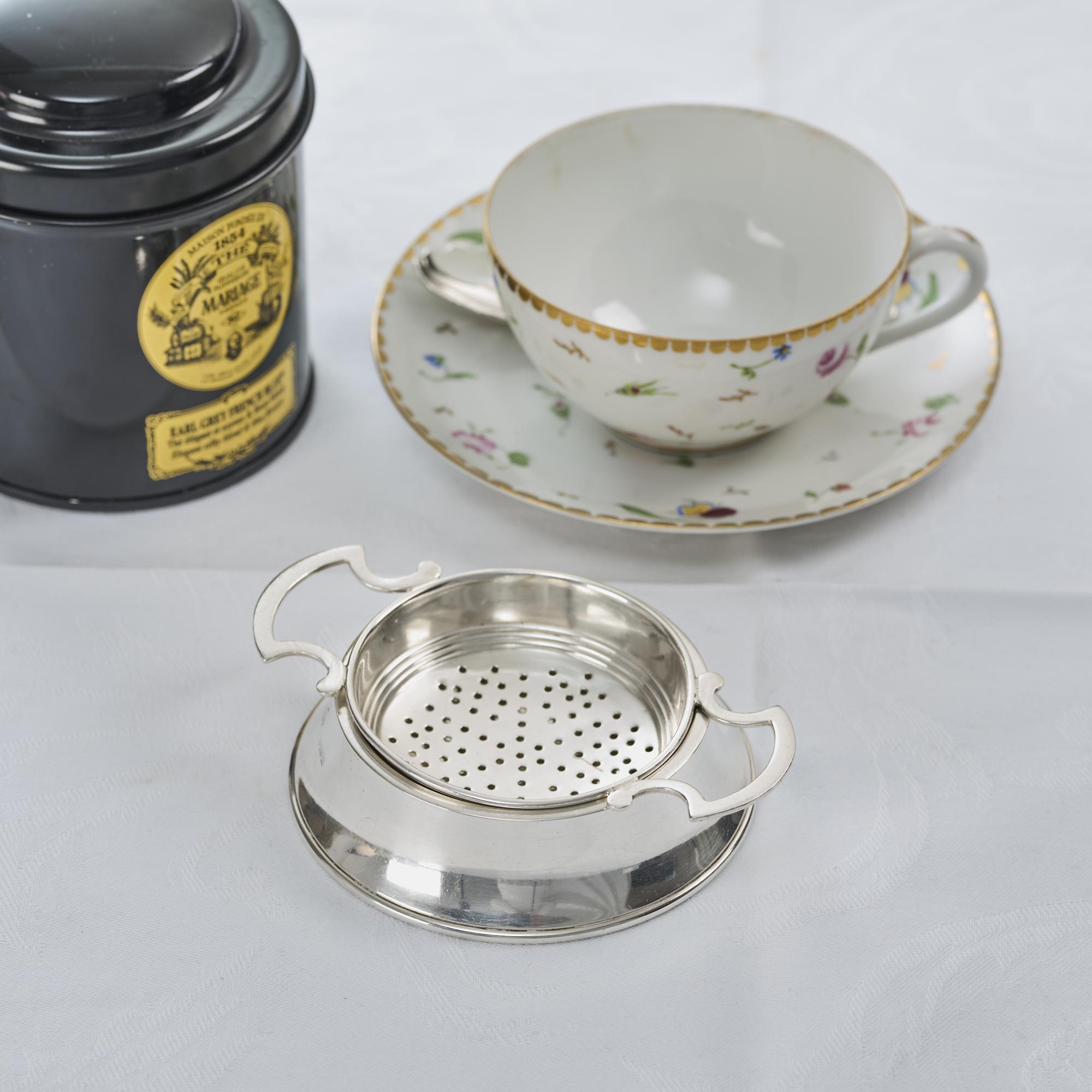 Elegant, useful sterling silver tea strainer with two scroll pattern handles enabling it to rest on its original silver stand or drip bowl, or on the rim of the tea cup. Loose tea is so superior to the teabag and deserving of a silver tea strainer. The pierced bowl captures the loose tea leaves as you pour tea from the teapot, and the stand catches the drips when the strainer is returned to the stand. Sit back and savour a real cup of tea.