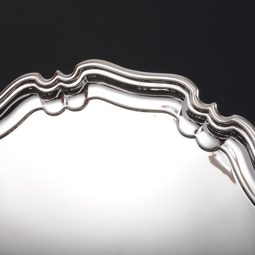 Classic, silver armada dish - a shallow circular bowl with flared rim and raised centre.