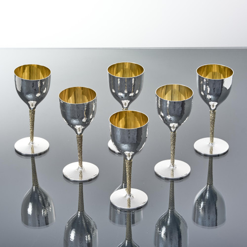 A set of eight mid-century silver wine goblets by one of the finest silversmiths of the 20th century, Stuart Devlin, and reflecting his very distinctive decorative style. The hand raised bowls and cast tapering stems are hand hammered and multifaceted, technique that reflects surrounding light and makes them sparkle.