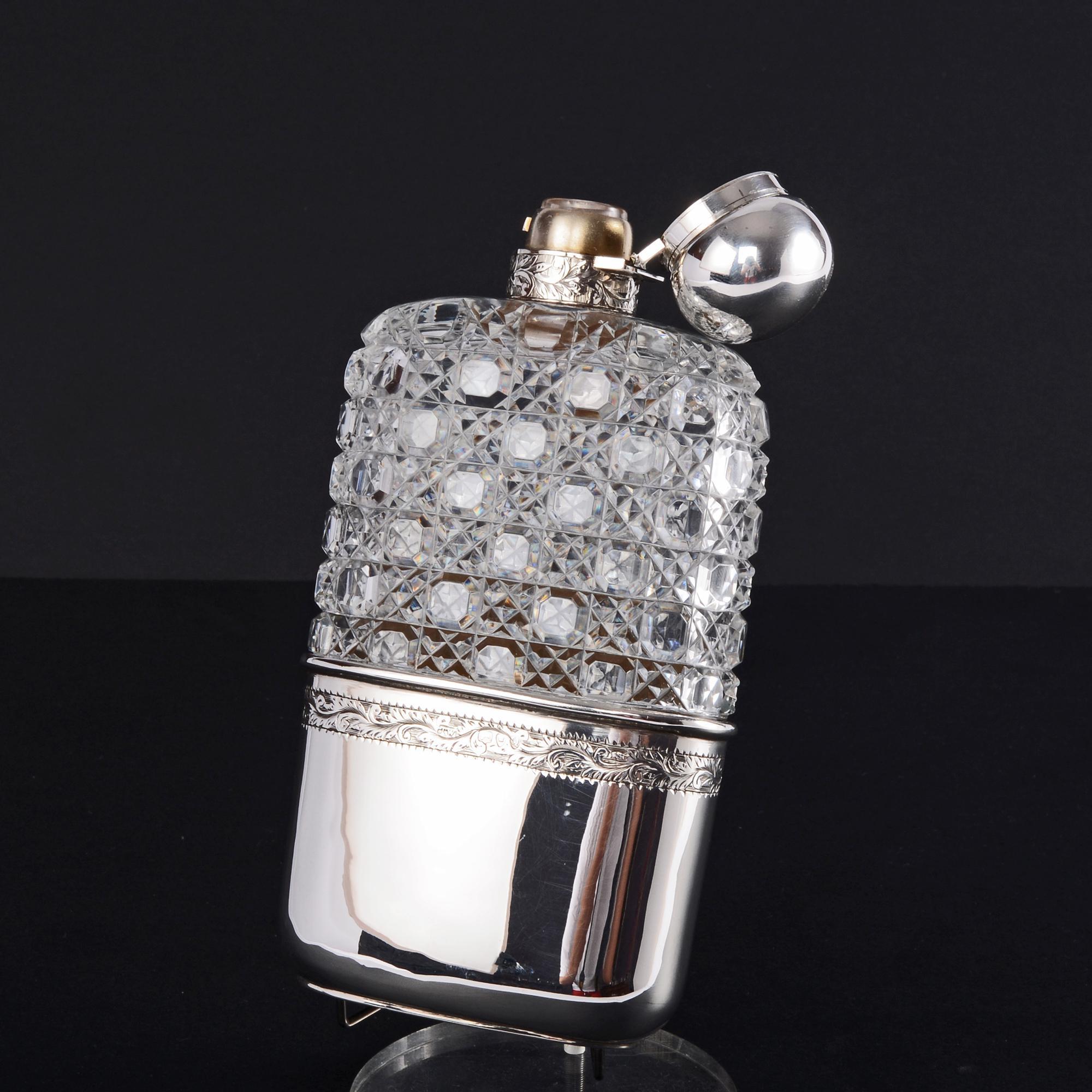 This is a large Victorian hip flask with a cut glass body and removable sterling silver drinking cup, decorated with a band of hand-engraved decoration. The cup is gilded inside and the hinged lid has a secure, one-twist bayonet fitting with engraved decoration to the collar.